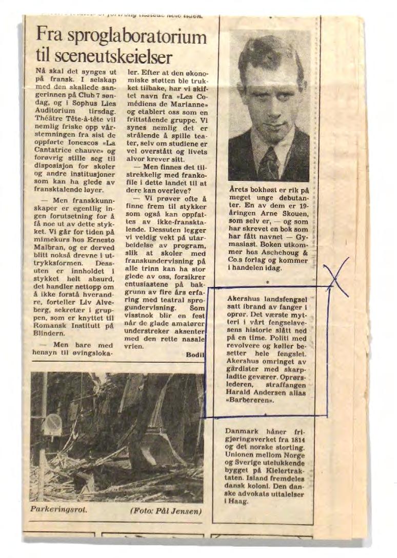 I begynnelsen av desember finner jeg et brev blant regninger og reklame. Det er adressert til ham, men har ingen avsender. Jeg åpner konvolutten, som ikke inneholder noe annet enn hele side 55 fra Aftenposten torsdag 2. desember 1982, pent sammenbrettet. Høyre spalte har tittelen «De harde 30-årene. (Sakset fra Aftenposten for 50 år siden.)» Der kan man blant annet lese om arkitekt Arnebergs planer for Akershusborgens istandsettelse, importregulering og toll på fisk og om 19-åringen Arne Skouen som debuterer med boken Gymnasiast på Aschehoug forlag. Neste notis i spalten er innrammet med blå penn.