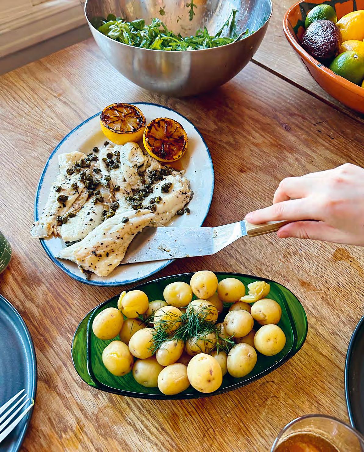 FISKEN: For å holde den ferdigstekte fisken varm mens jeg lager det siste, setter jeg en ildfast form i ovnen og varmer opp denne. Fisken er veldig ømfintlig og trenger bare et par raske minutter på hver side. Varm opp stekepanna til middels varme. Hell nøytral olje i panna til det dekker bunnen helt. Salte og pepre fisken mens den steker i panna. Legg den ferdigstekte fisken i den varme ildfaste formen.