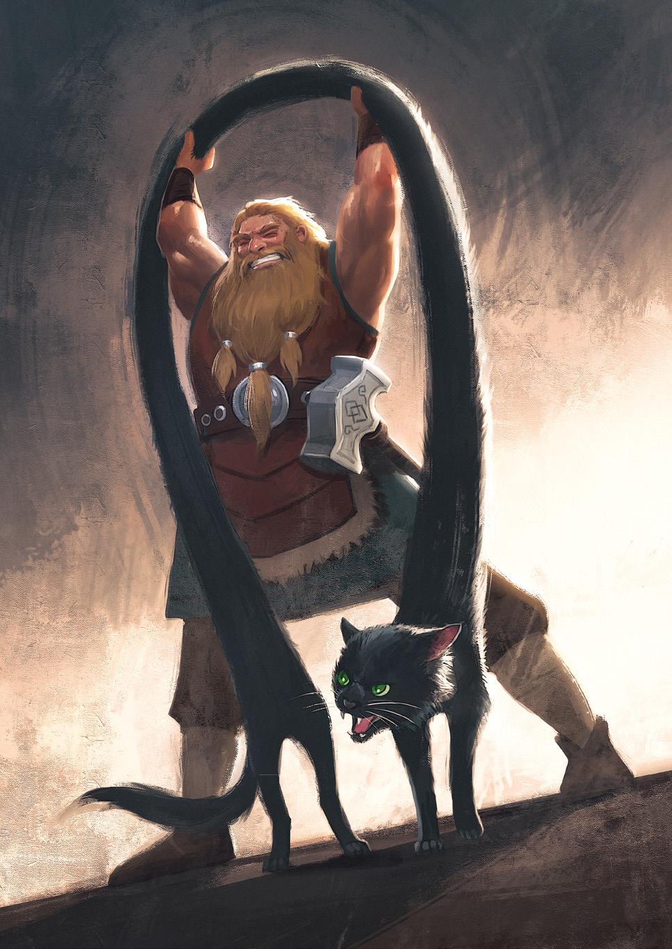 «Jeg … er … sterkest,» prustet han. «Jeg … er … Tor!» Fråden sto om munnen på ham nå. Lyn skjøt fra øynene. Skjegget gnistret. Et øyeblikk måtte katten løfte litt på den ene poten.