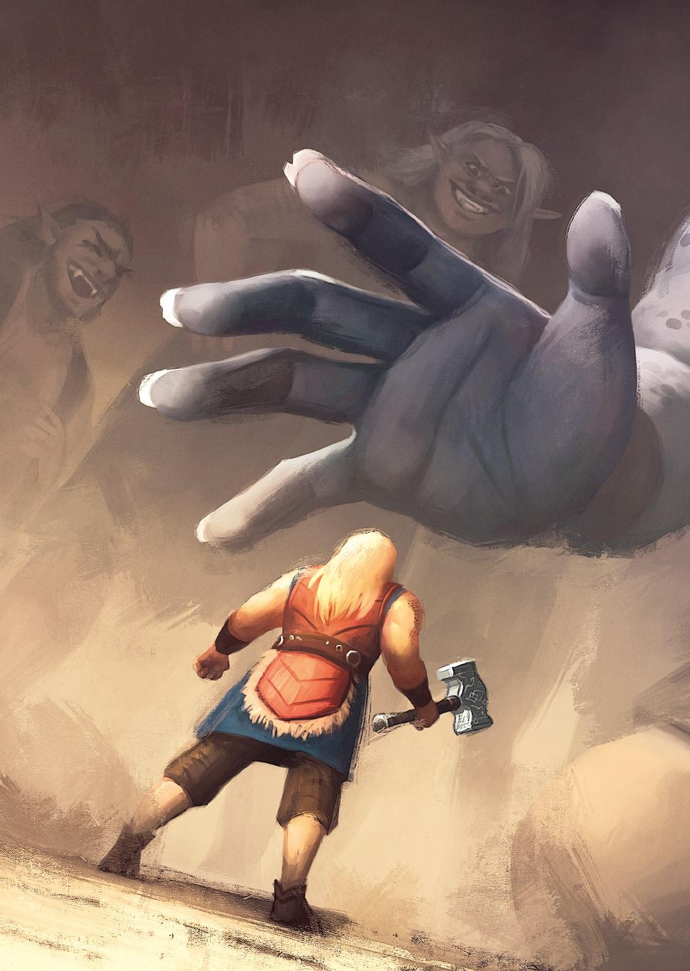 Kjempenes latter smertet fortsatt. Dette såret tar jeg med meg til det siste slaget, tenkte han, og tok et godt tak rundt skaftet på hammeren. Ved Odin, da skal det kverkes trollpakk!