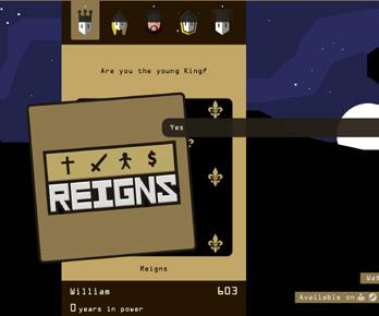 Reigns (reignsgame.com/reigns) is a free, online strategy game where players take on the role of a monarch ruling a kingdom. Each turn, receive a card with a yes/no decision. The choices impact four pillars of power: the church, the people, the army and the treasury –balancing them is key to a long reign.