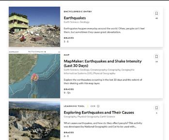 From National Geographic, Earthquake (education.nationalgeographic.org/ resource/resource-library-earthquake/) is a library of resources for teaching about earthquakes, from explanations and causes, to their impact and effects. The site offers articles, maps, videos, and related activities.