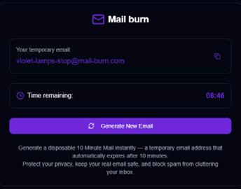 Protect your privacy, keep your real email safe, and block spam from cluttering your inbox with a temporary email from Mail Burn (mail-burn.com). Simply press generate and the site provides you with a temporary, disposable email address that automatically expires after 10 minutes.