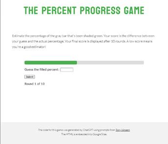 Test students’ skills of estimation (and use of percentages) with The Percent Progress Game (sites.google.com/view/ tppgame). Estimate how much of the grey bar is shaded green. The score is the difference between the guess and the actual percentage. A low score means you’re a good estimator!