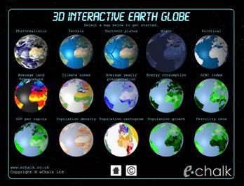 From terrain to tectonic plates, GDP to population, energy consumption to weather, explore different aspects of our planet at 3D Interactive Earth Globe (bit.ly/echalk3D). Choose from 15 globes, each with a colour key, basic data and viewing options, which allow tilt and rotation. Select one and get started.