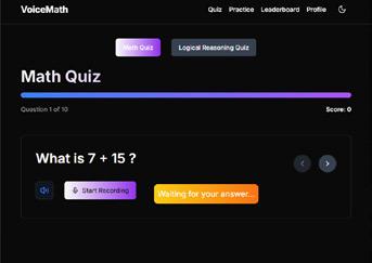 Learn and practise mathematics through interactive voice-based exercises at Voice Math (voicemath. vercel.app). Start a Math or Logical Reasoning quiz and read or listen to the questions. Speak the answer (you’ll need to give microphone access). The site keeps score as it goes through a series of questions.