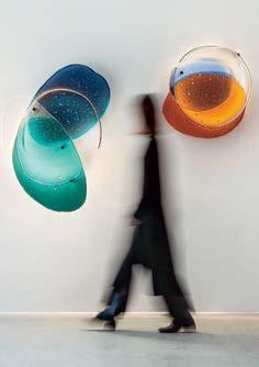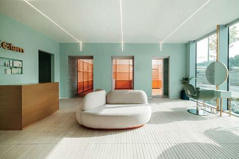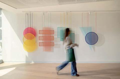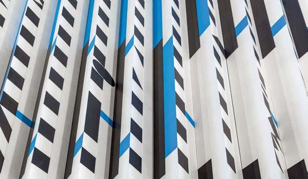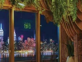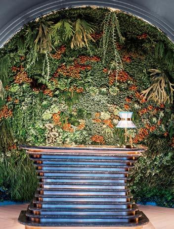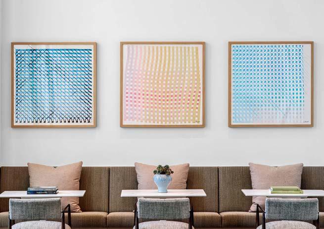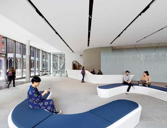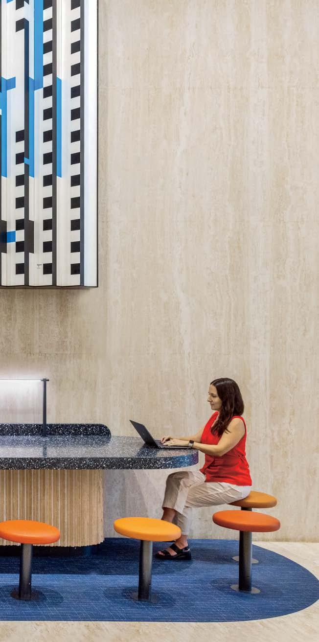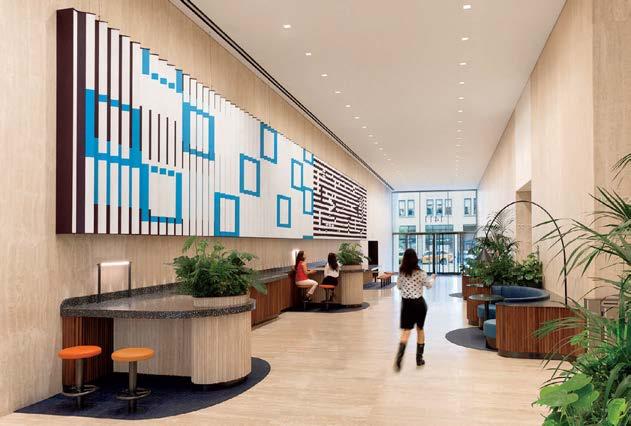 standout It helps when a client has a blue-chip art collection to choose from. Such was the case with the owner of this 40-story, 1970 office tower, formerly the World Apparel Center. KPF has fashionably transformed its 6,000-squarefoot, through-block lobby, coordinating the blue in Yaacov Agam’s kinetic 8-by-65-foot acrylic on aluminum from 1972 with the renovation’s color scheme, from the banquette’s vegan leather upholstery to the terrazzo of the 67-foot-long built-in workstation bar and even the complimentary Manhattanhenge-hued silicone covering the stools. Actual sunsets can be viewed from the indoor/ outdoor rooftop amenity currently under construction.