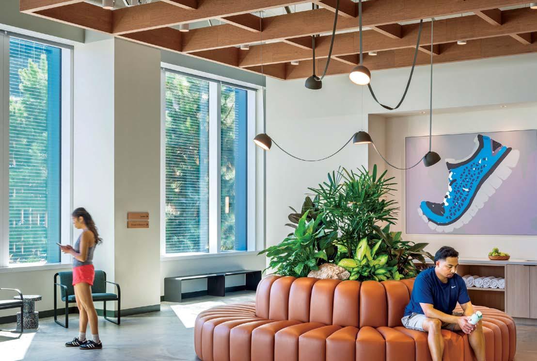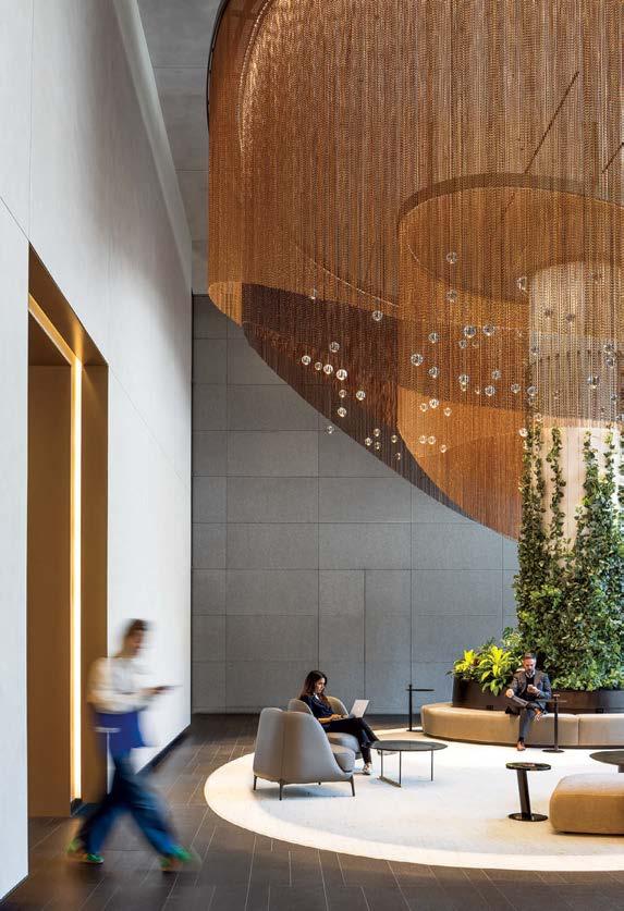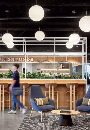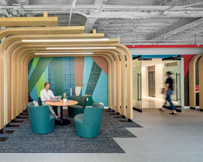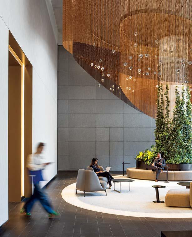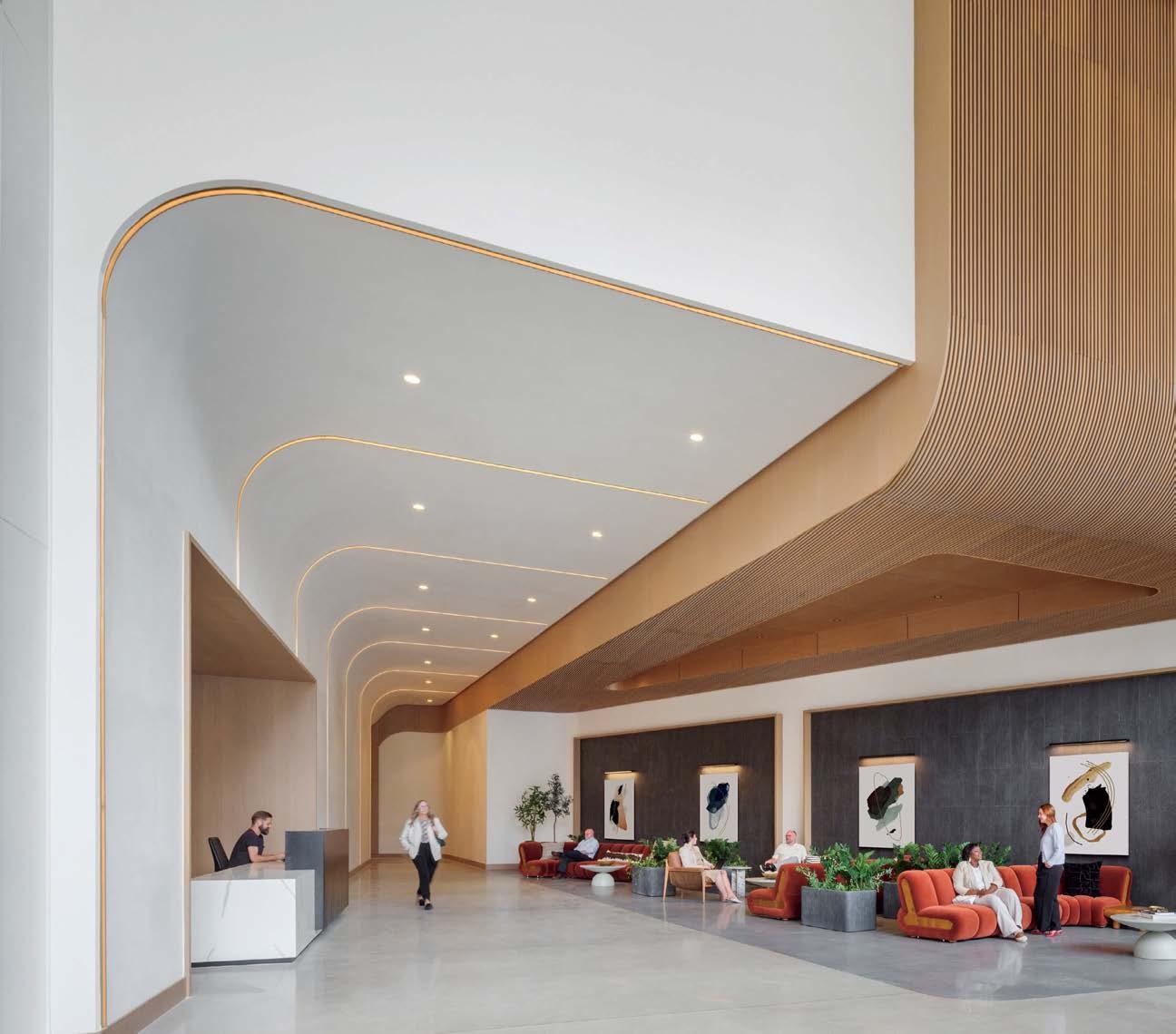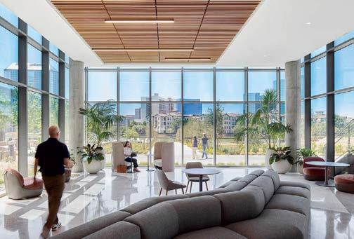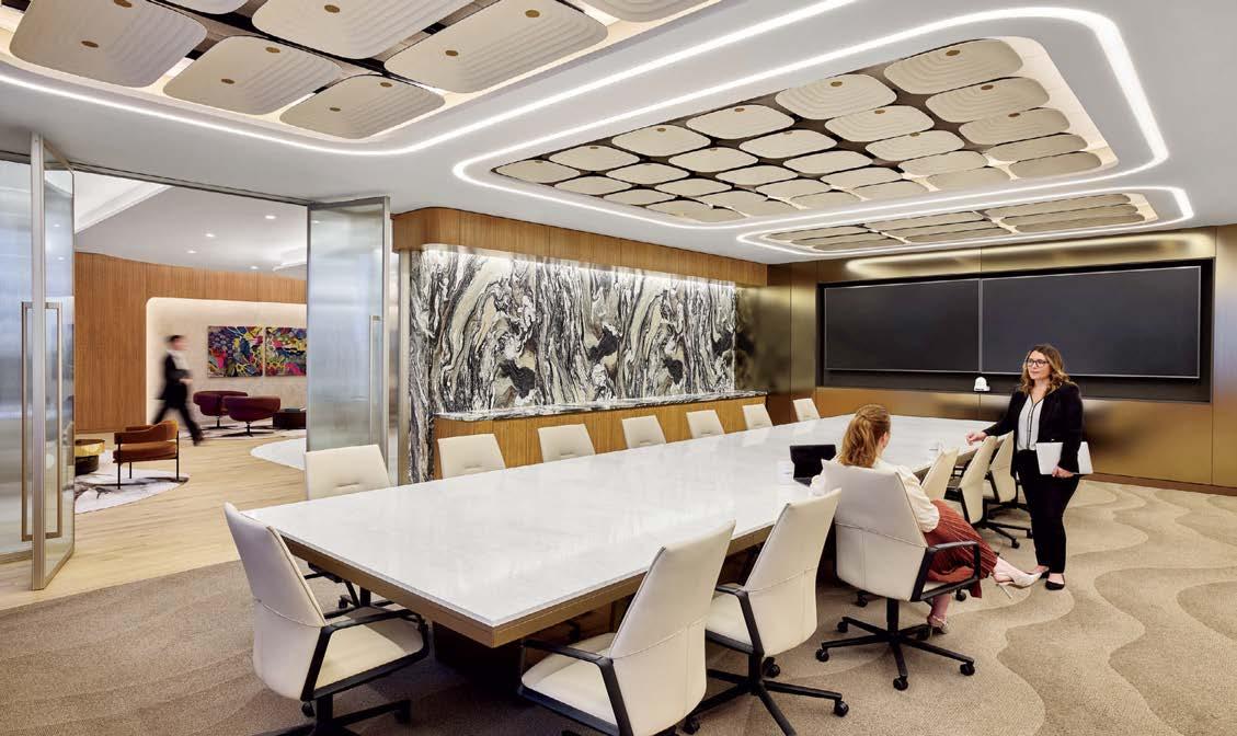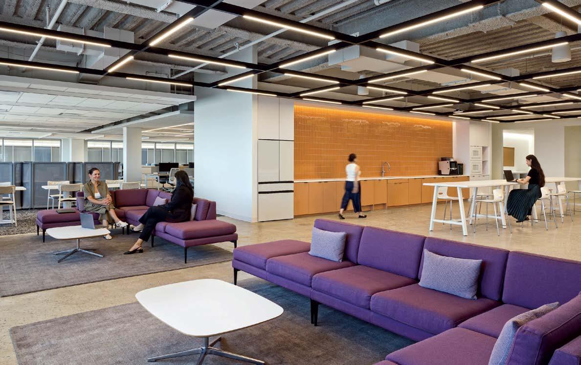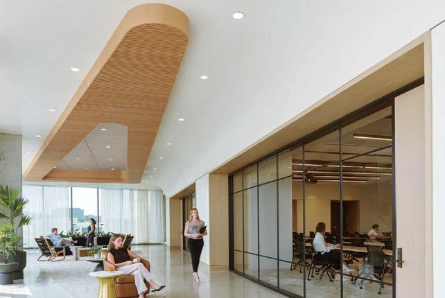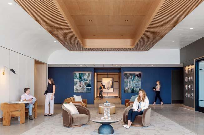 standout More than 30,000 square feet of this ground-up, 15-story office tower by architecture firm Goettsch Partners has been crafted by PDB to be flexible, welcoming, and wellness-oriented. That’s evident in the lobby, an airy 30-foot space with inviting velvetappointed curved sectionals, capped by a dramatic ceiling swoosh veneered in warm white oak. The upscale finishes continue on level five—a full floor of amenities—where glass-fronted training rooms are divisible and daylit, and lounges are like living rooms, with chenille-upholstered barrel chairs, marble-topped coffee tables, and carbon-neutral carpet tile.