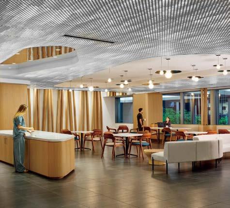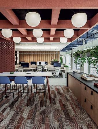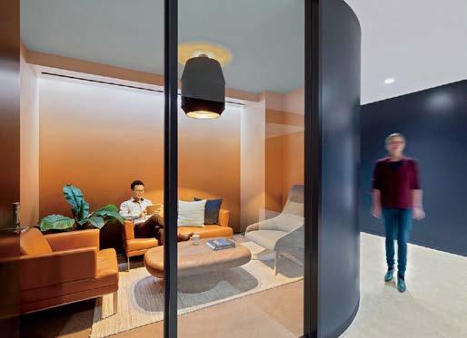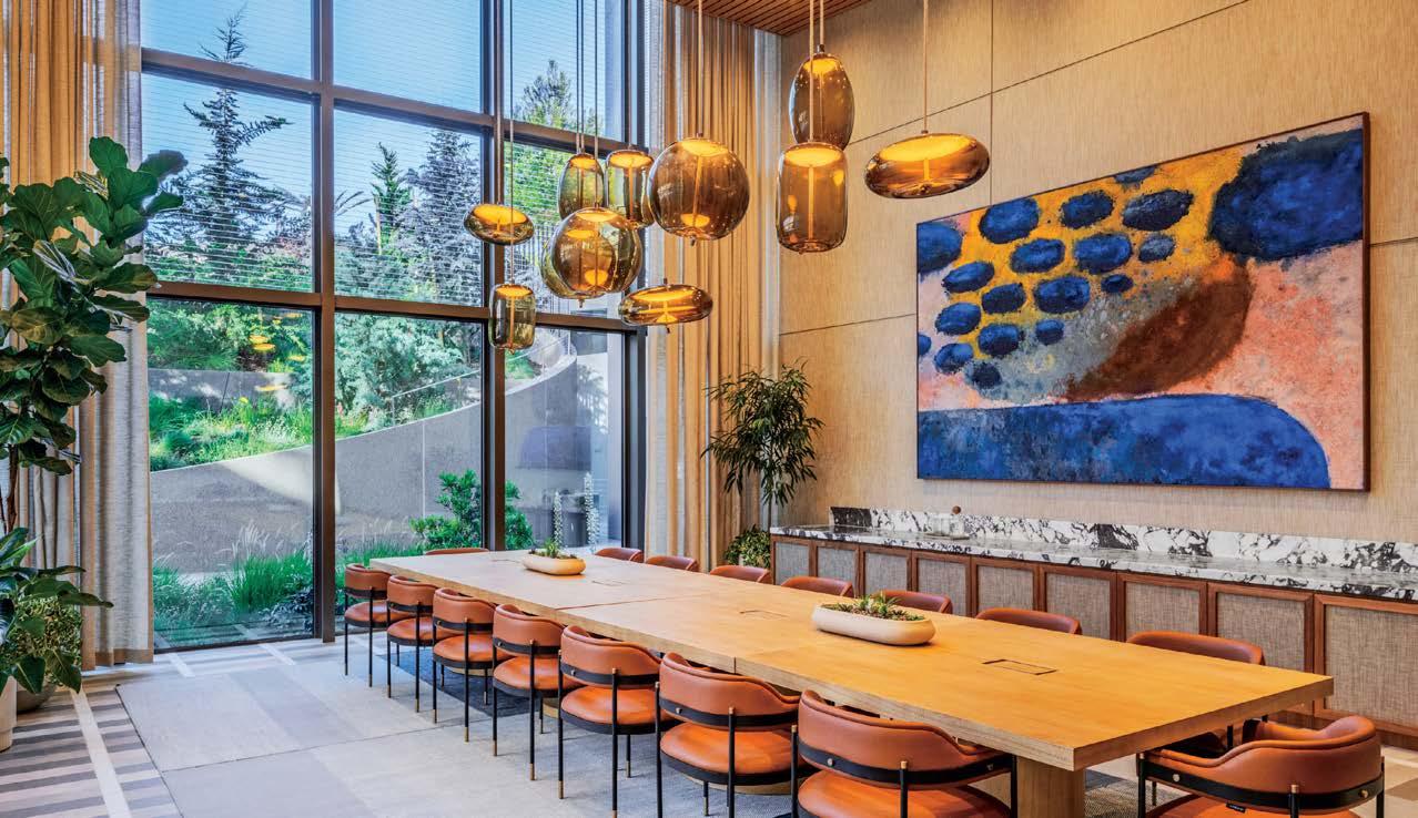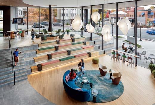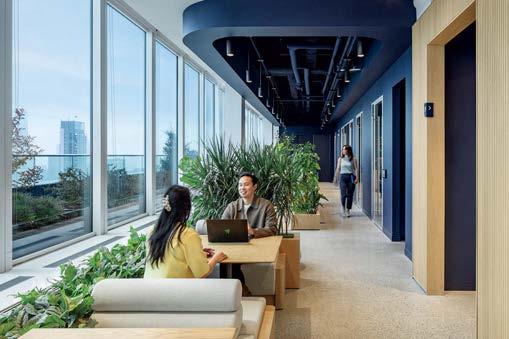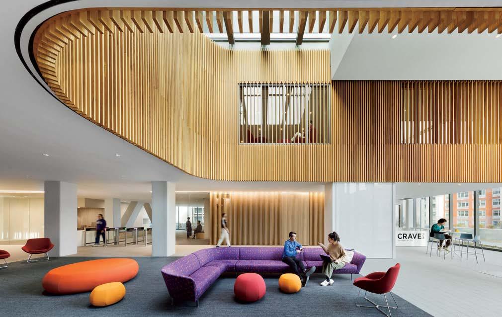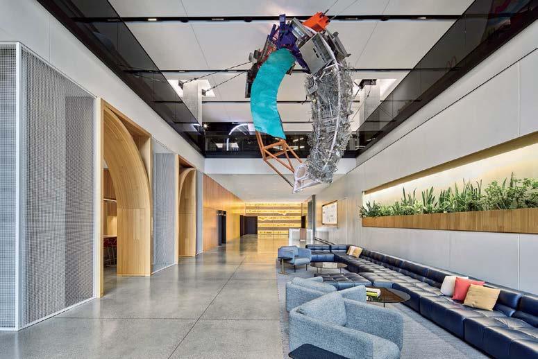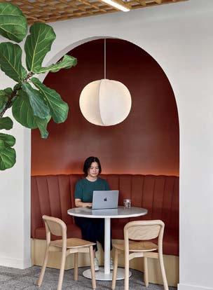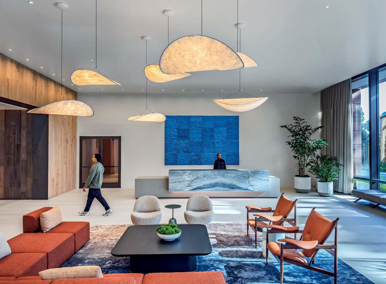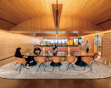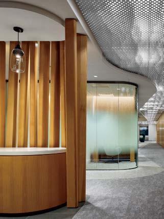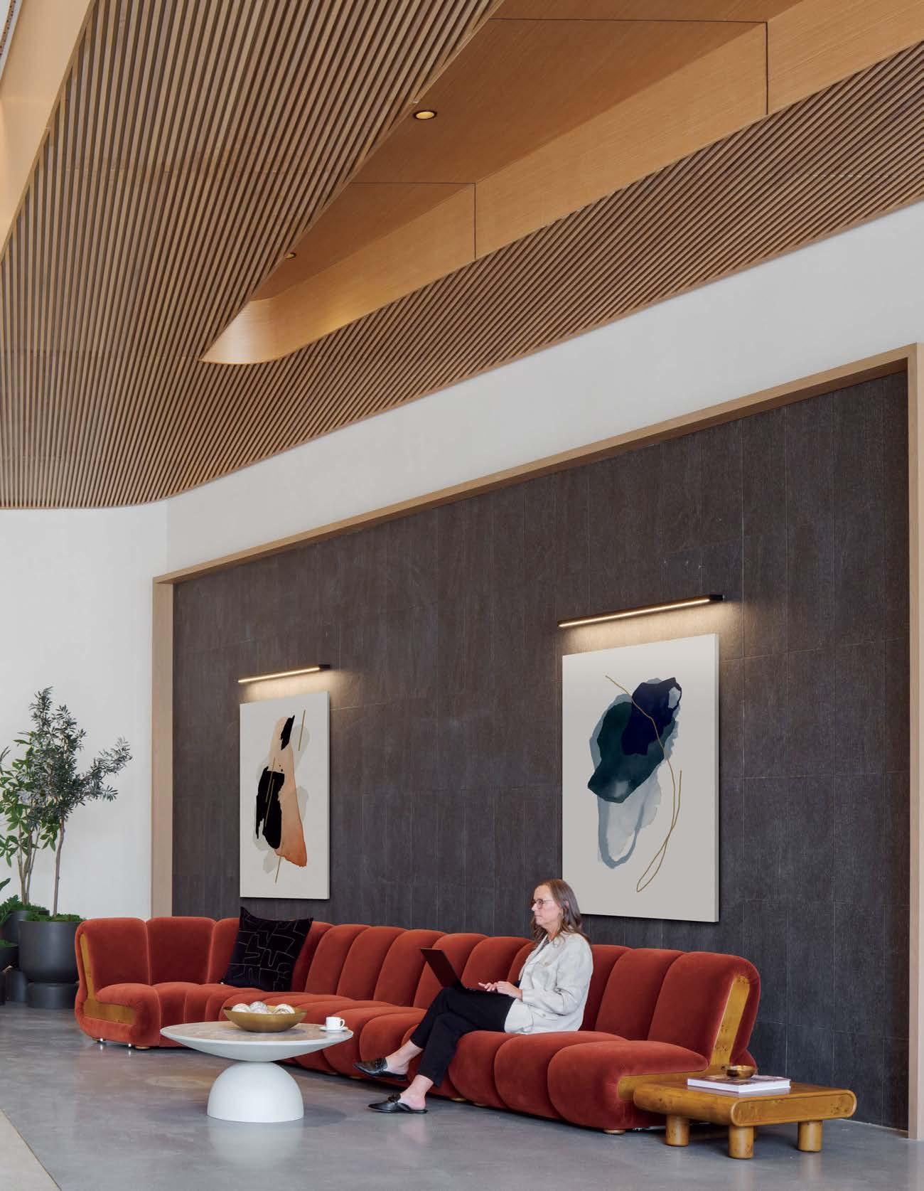 standout More than 30,000 square feet of this ground-up, 15-story office tower by architecture firm Goettsch Partners has been crafted by PDB to be flexible, welcoming, and wellness-oriented. That’s evident in the lobby, an airy 30-foot space with inviting velvetappointed curved sectionals, capped by a dramatic ceiling swoosh veneered in warm white oak. The upscale finishes continue on level five—a full floor of amenities—where glass-fronted training rooms are divisible and daylit, and lounges are like living rooms, with chenille-upholstered barrel chairs, marble-topped coffee tables, and carbon-neutral carpet tile.