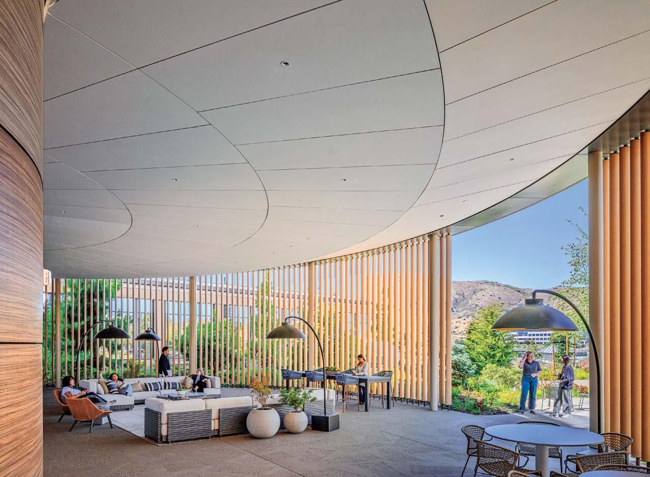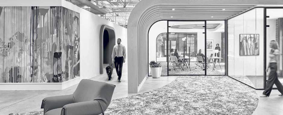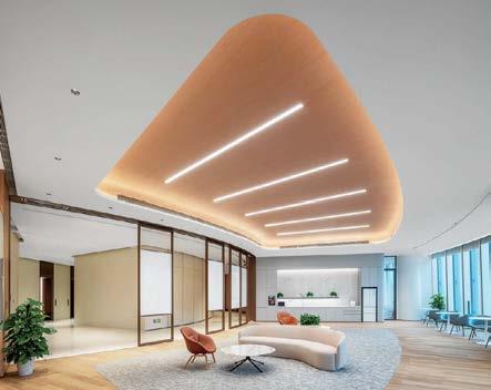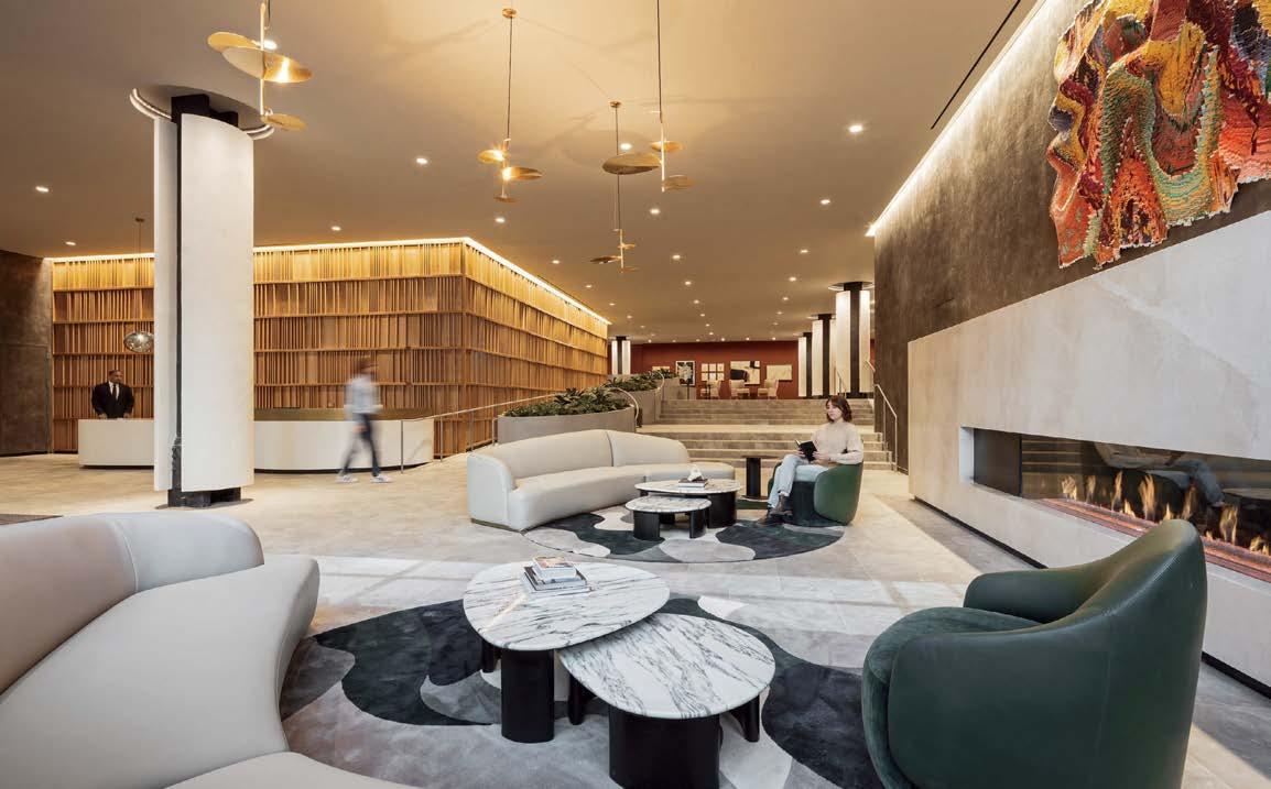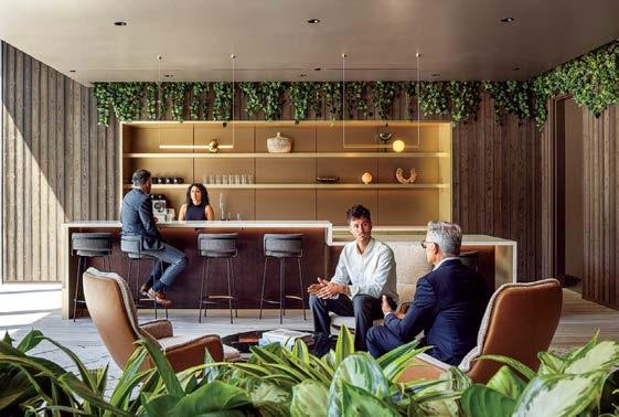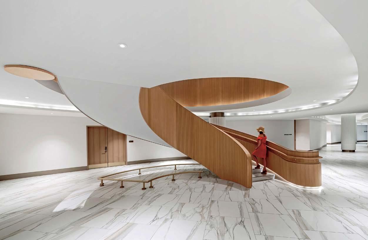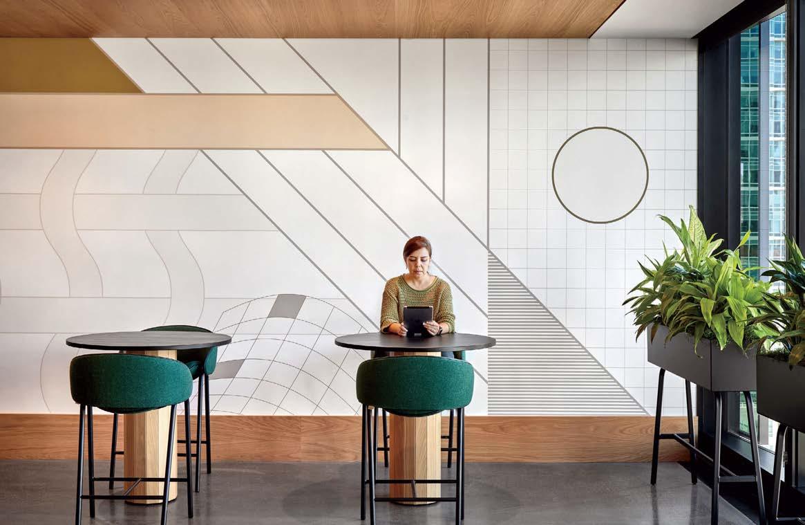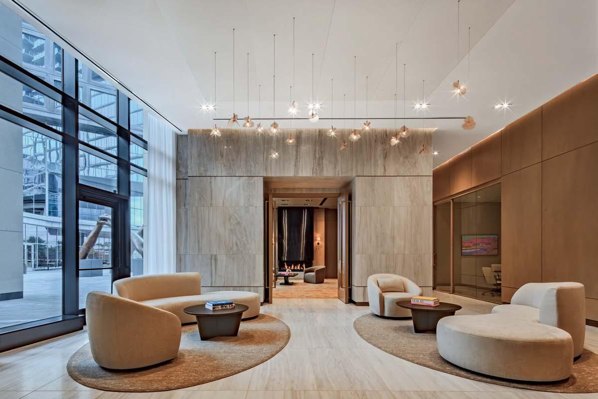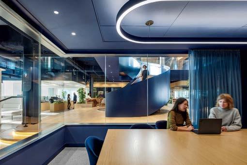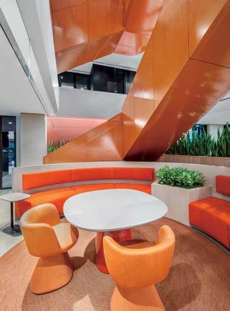 standout More than 30,000 square feet of this ground-up, 15-story office tower by architecture firm Goettsch Partners has been crafted by PDB to be flexible, welcoming, and wellness-oriented. That’s evident in the lobby, an airy 30-foot space with inviting velvetappointed curved sectionals, capped by a dramatic ceiling swoosh veneered in warm white oak. The upscale finishes continue on level five—a full floor of amenities—where glass-fronted training rooms are divisible and daylit, and lounges are like living rooms, with chenille-upholstered barrel chairs, marble-topped coffee tables, and carbon-neutral carpet tile.