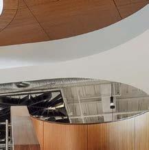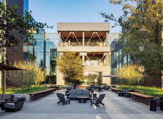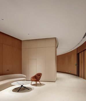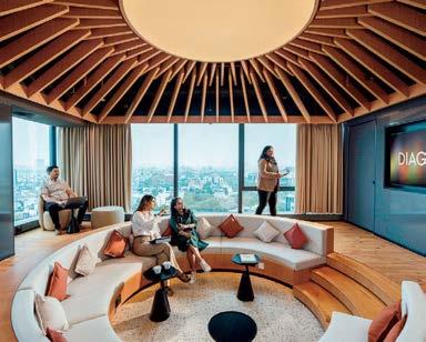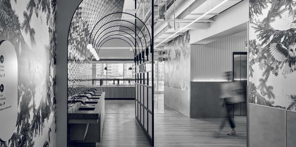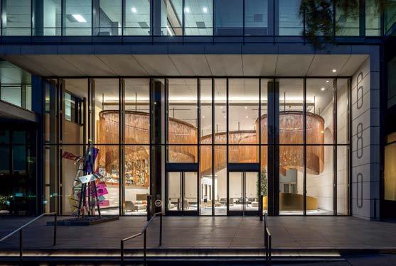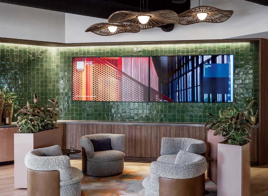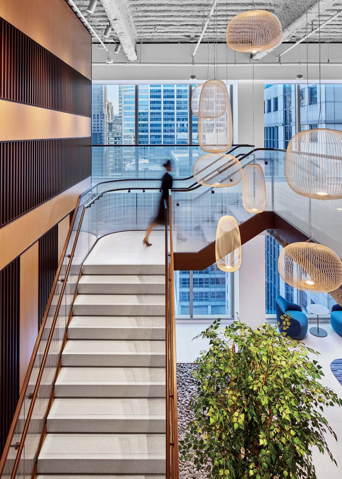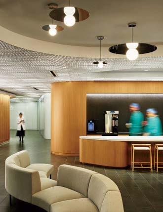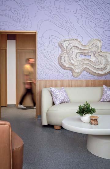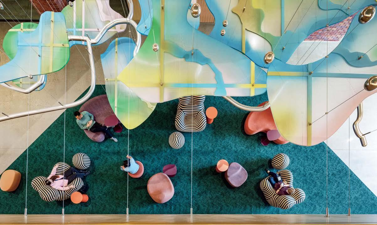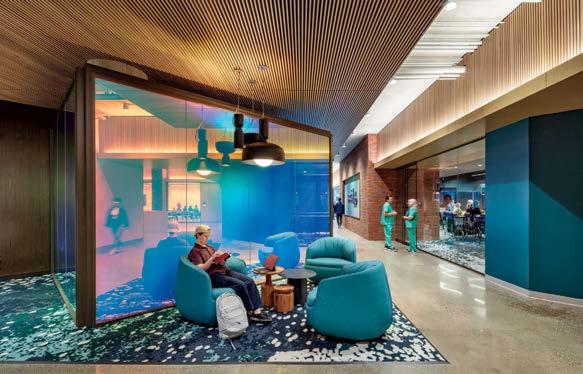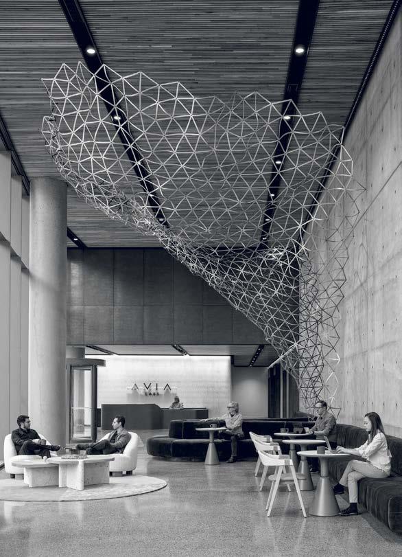 standout More than 30,000 square feet of this ground-up, 15-story office tower by architecture firm Goettsch Partners has been crafted by PDB to be flexible, welcoming, and wellness-oriented. That’s evident in the lobby, an airy 30-foot space with inviting velvetappointed curved sectionals, capped by a dramatic ceiling swoosh veneered in warm white oak. The upscale finishes continue on level five—a full floor of amenities—where glass-fronted training rooms are divisible and daylit, and lounges are like living rooms, with chenille-upholstered barrel chairs, marble-topped coffee tables, and carbon-neutral carpet tile.