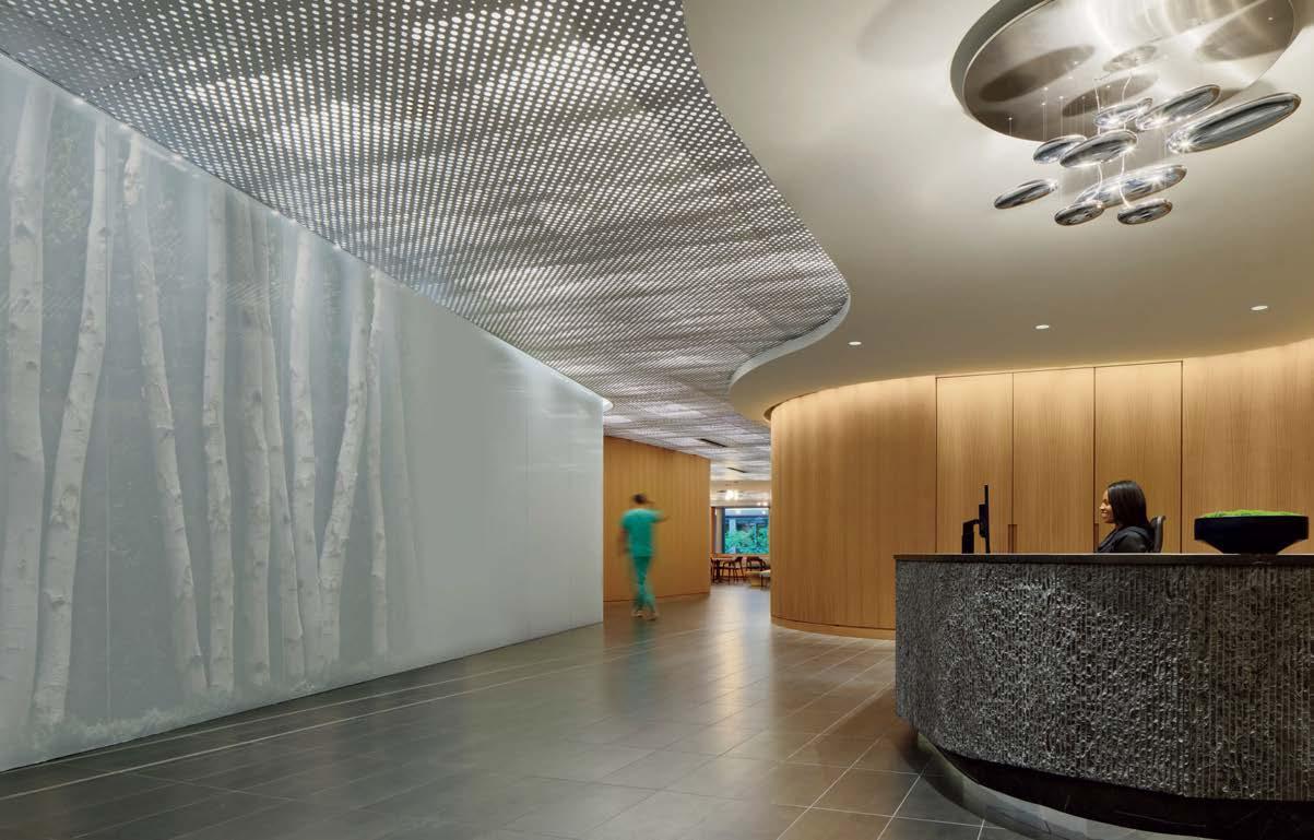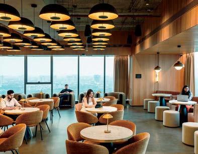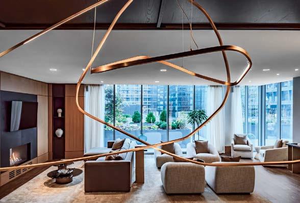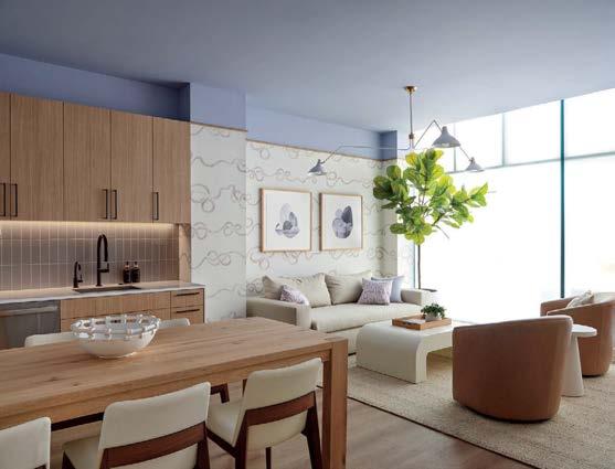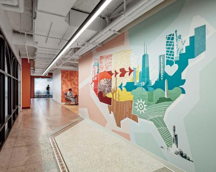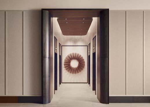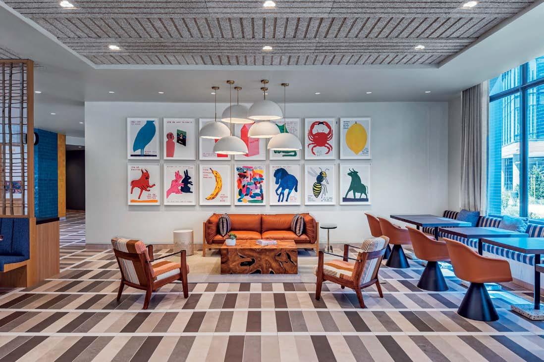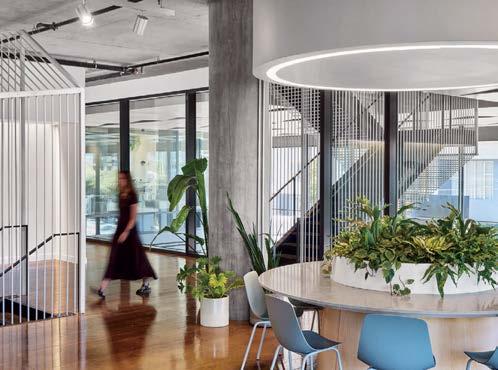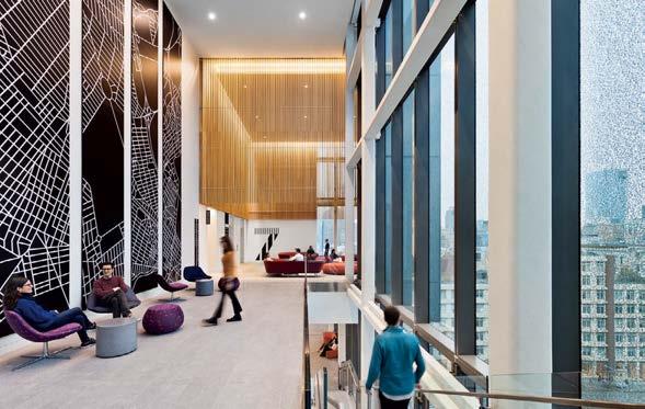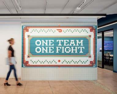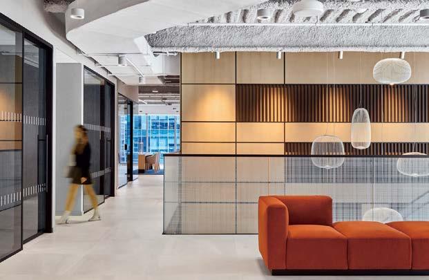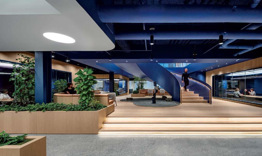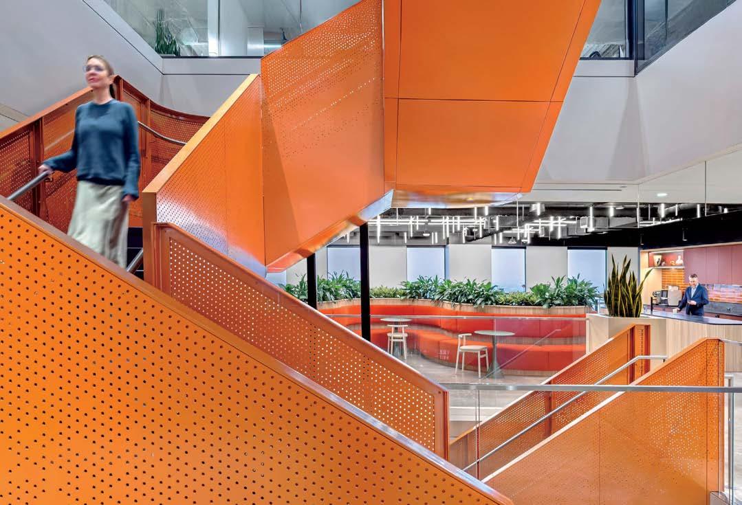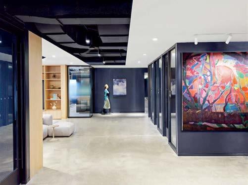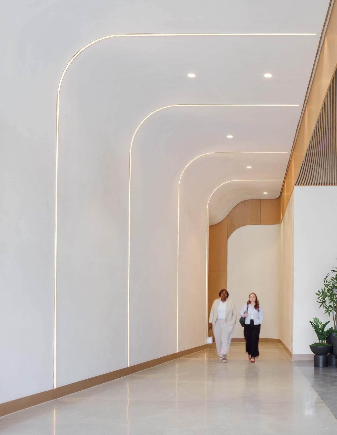 standout More than 30,000 square feet of this ground-up, 15-story office tower by architecture firm Goettsch Partners has been crafted by PDB to be flexible, welcoming, and wellness-oriented. That’s evident in the lobby, an airy 30-foot space with inviting velvetappointed curved sectionals, capped by a dramatic ceiling swoosh veneered in warm white oak. The upscale finishes continue on level five—a full floor of amenities—where glass-fronted training rooms are divisible and daylit, and lounges are like living rooms, with chenille-upholstered barrel chairs, marble-topped coffee tables, and carbon-neutral carpet tile.