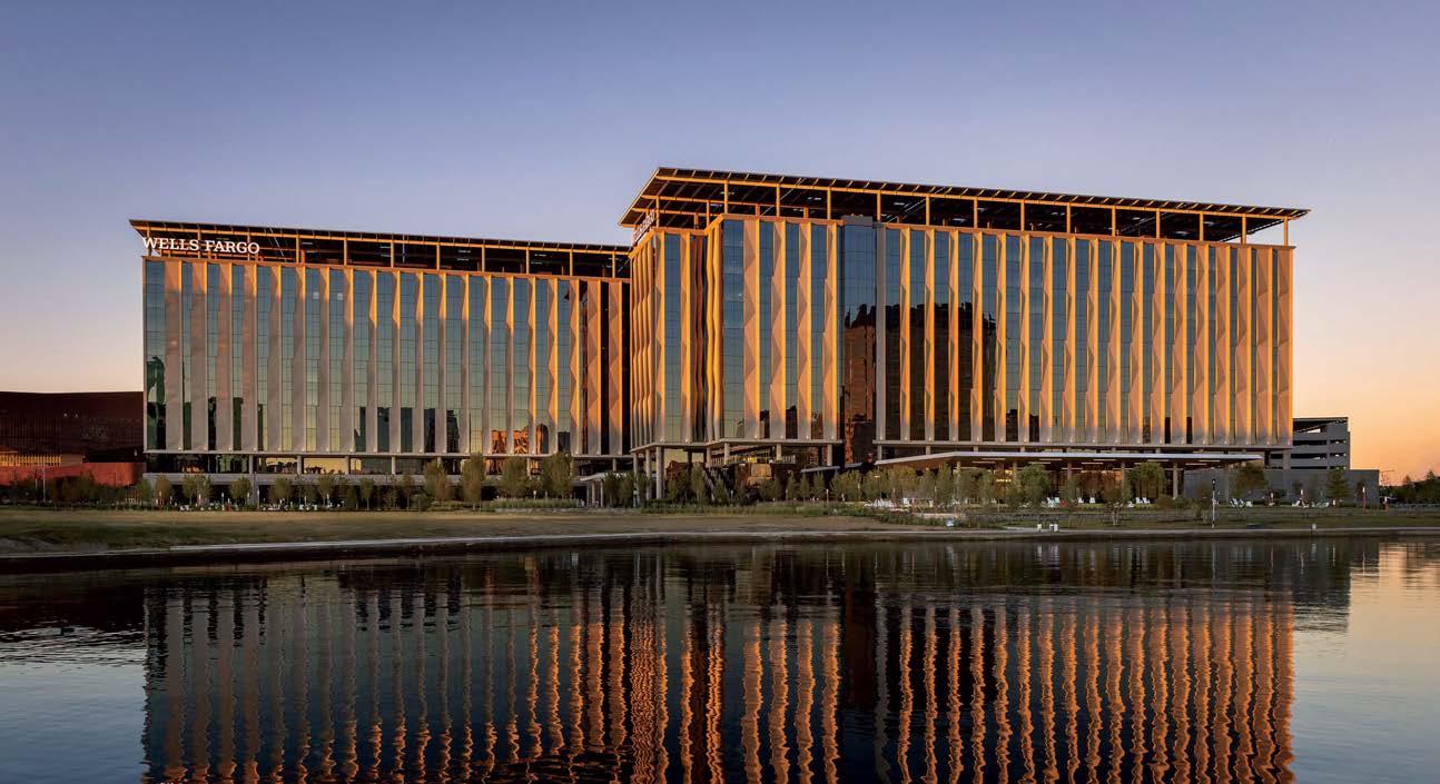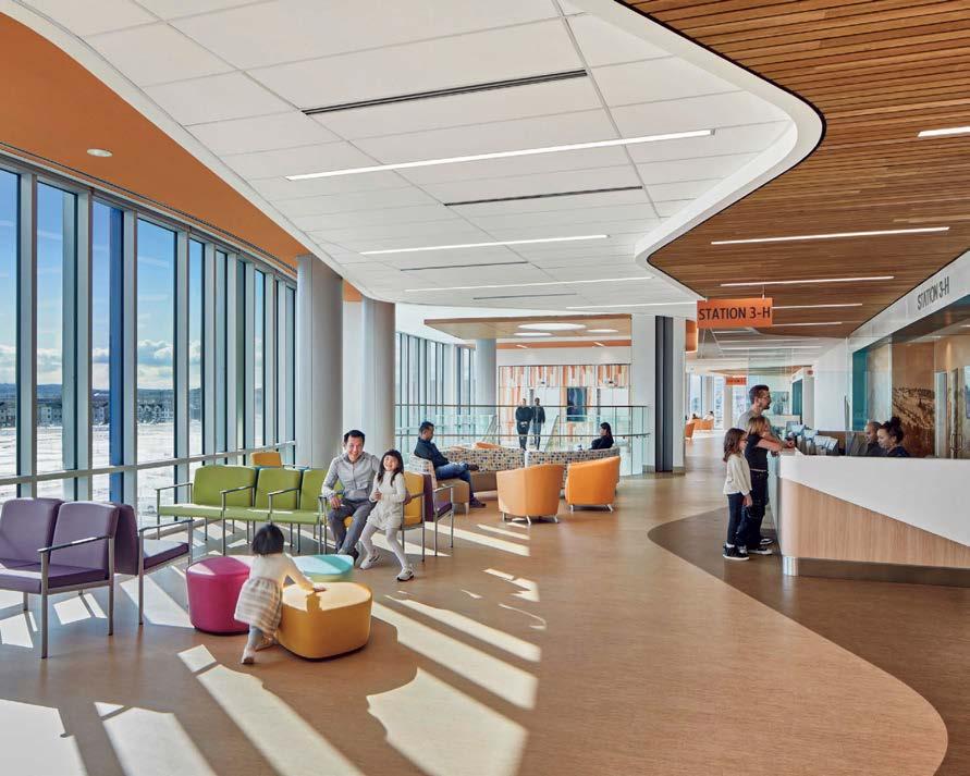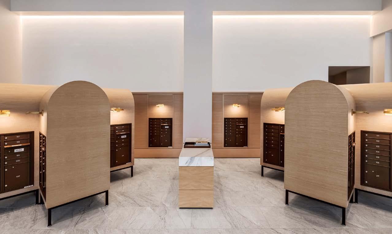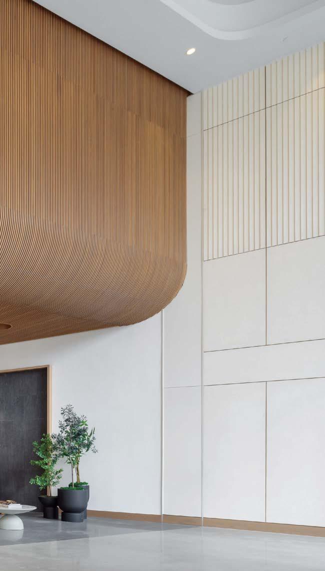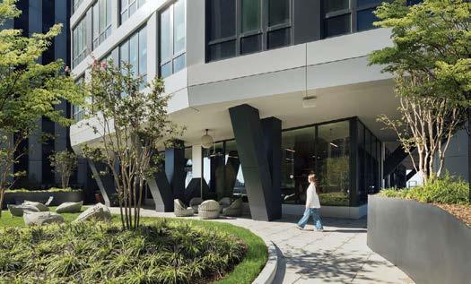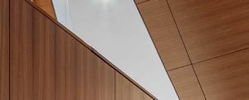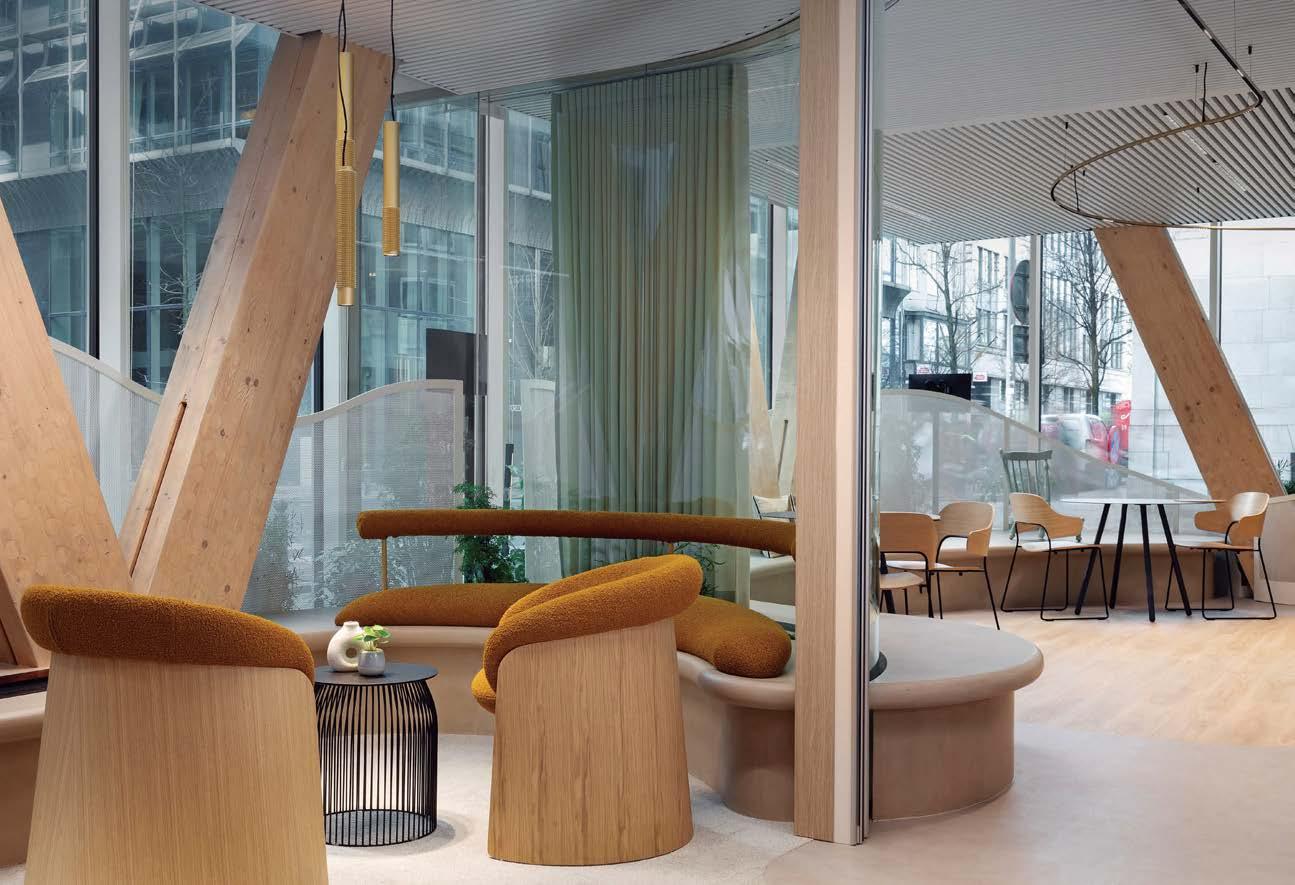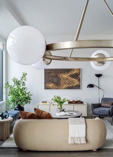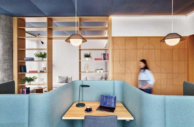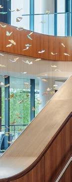 standout More than 30,000 square feet of this ground-up, 15-story office tower by architecture firm Goettsch Partners has been crafted by PDB to be flexible, welcoming, and wellness-oriented. That’s evident in the lobby, an airy 30-foot space with inviting velvetappointed curved sectionals, capped by a dramatic ceiling swoosh veneered in warm white oak. The upscale finishes continue on level five—a full floor of amenities—where glass-fronted training rooms are divisible and daylit, and lounges are like living rooms, with chenille-upholstered barrel chairs, marble-topped coffee tables, and carbon-neutral carpet tile.