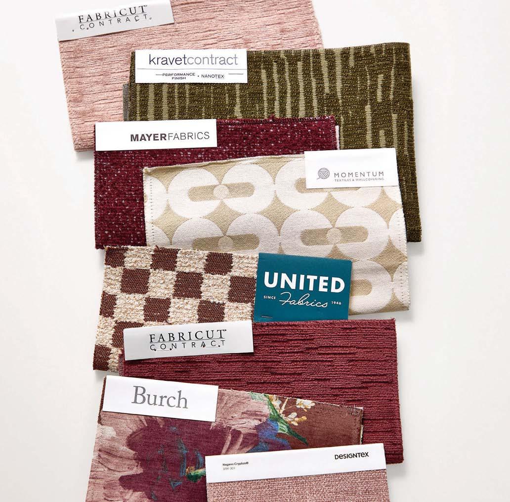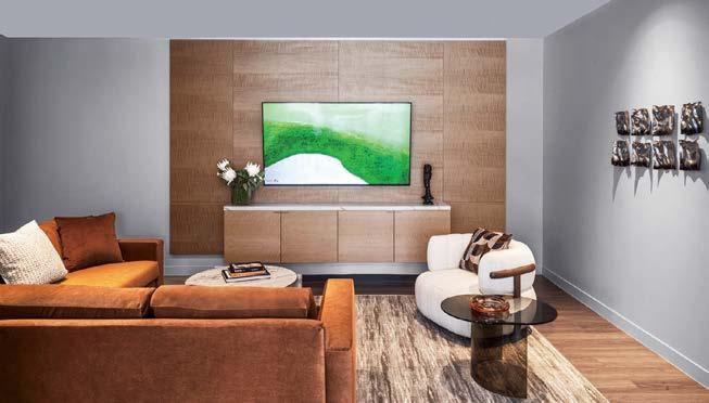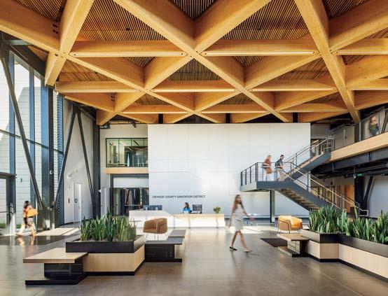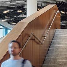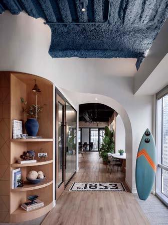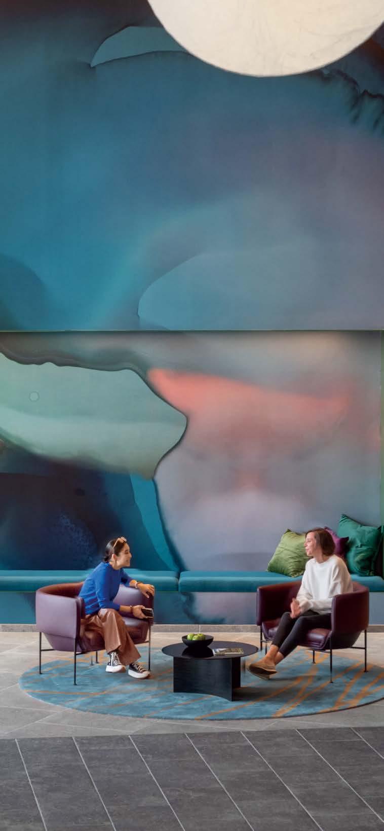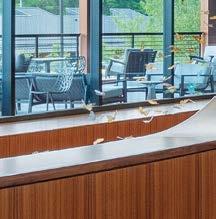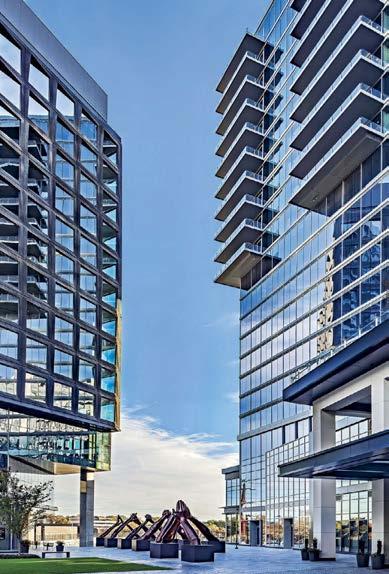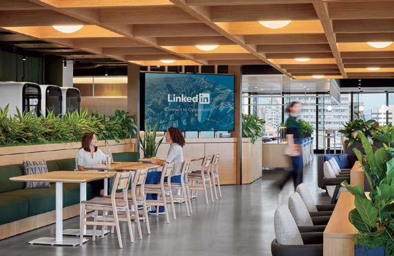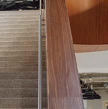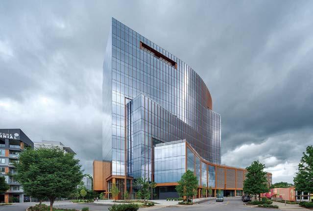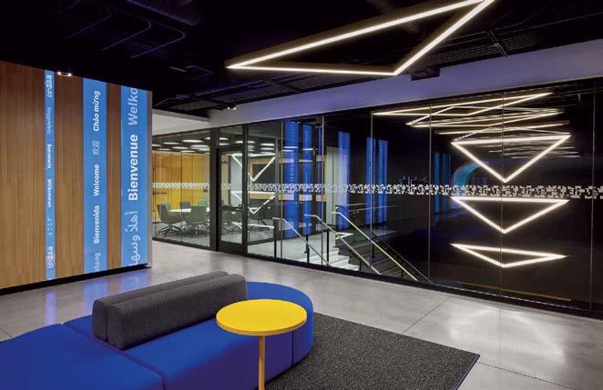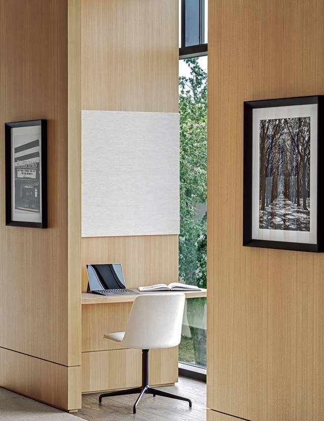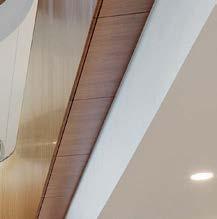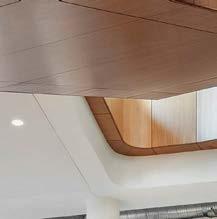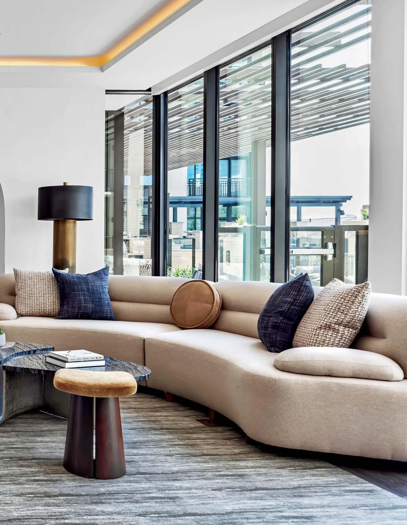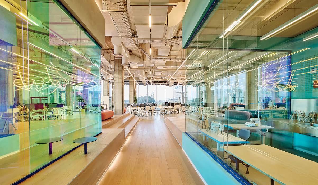 standout More than 30,000 square feet of this ground-up, 15-story office tower by architecture firm Goettsch Partners has been crafted by PDB to be flexible, welcoming, and wellness-oriented. That’s evident in the lobby, an airy 30-foot space with inviting velvetappointed curved sectionals, capped by a dramatic ceiling swoosh veneered in warm white oak. The upscale finishes continue on level five—a full floor of amenities—where glass-fronted training rooms are divisible and daylit, and lounges are like living rooms, with chenille-upholstered barrel chairs, marble-topped coffee tables, and carbon-neutral carpet tile.