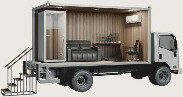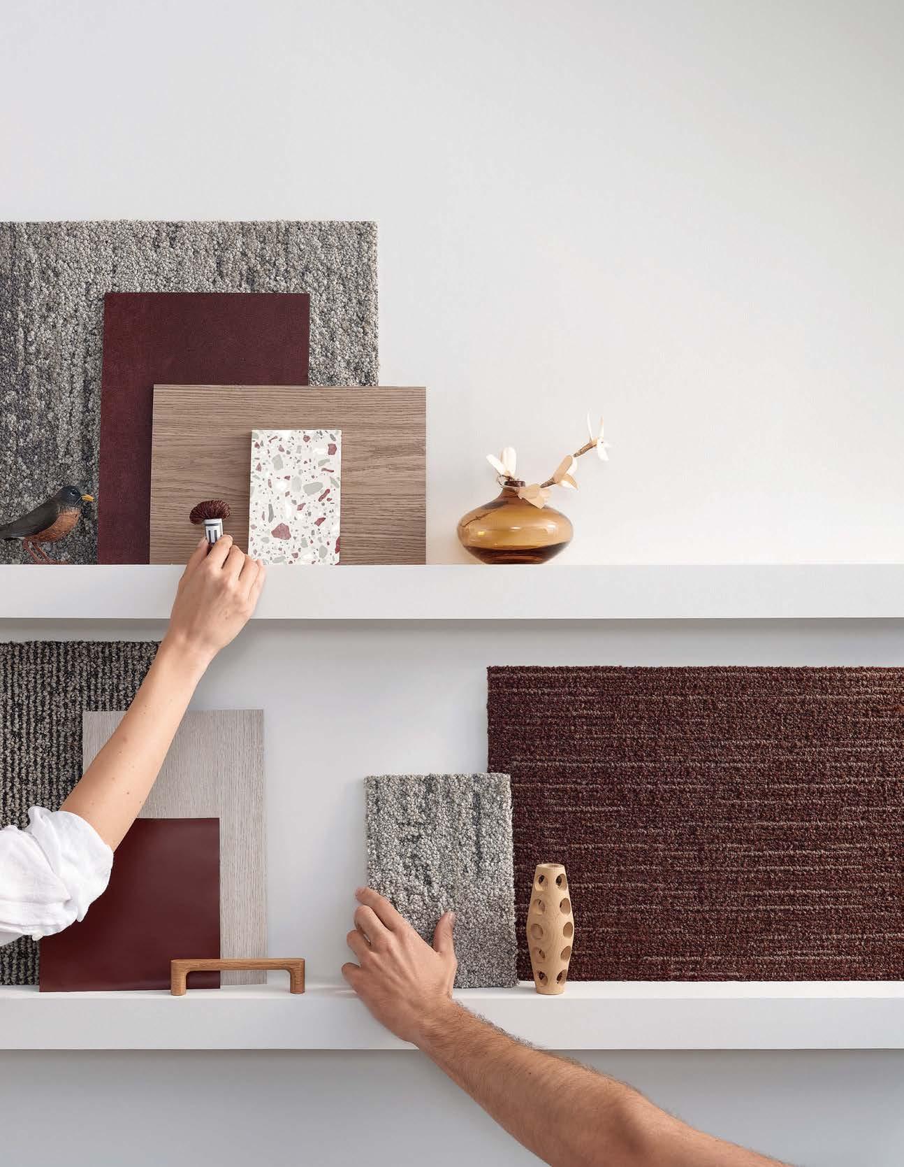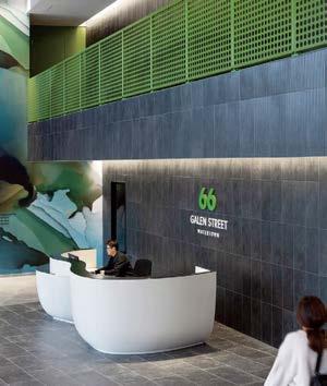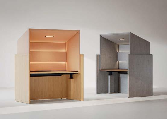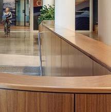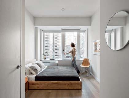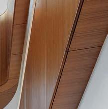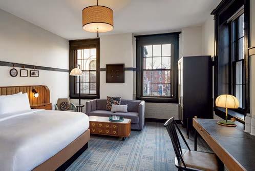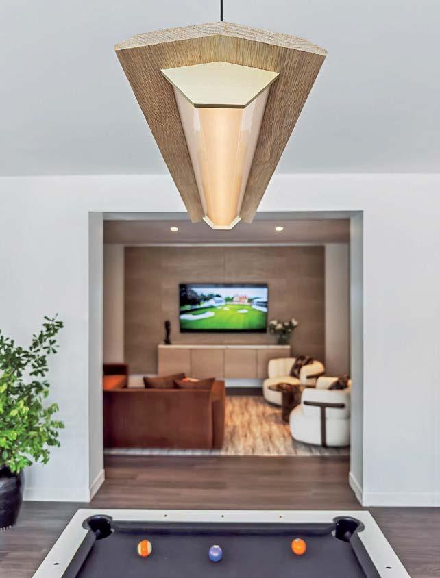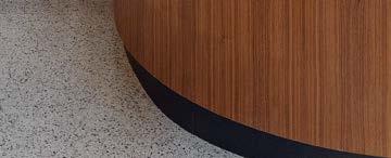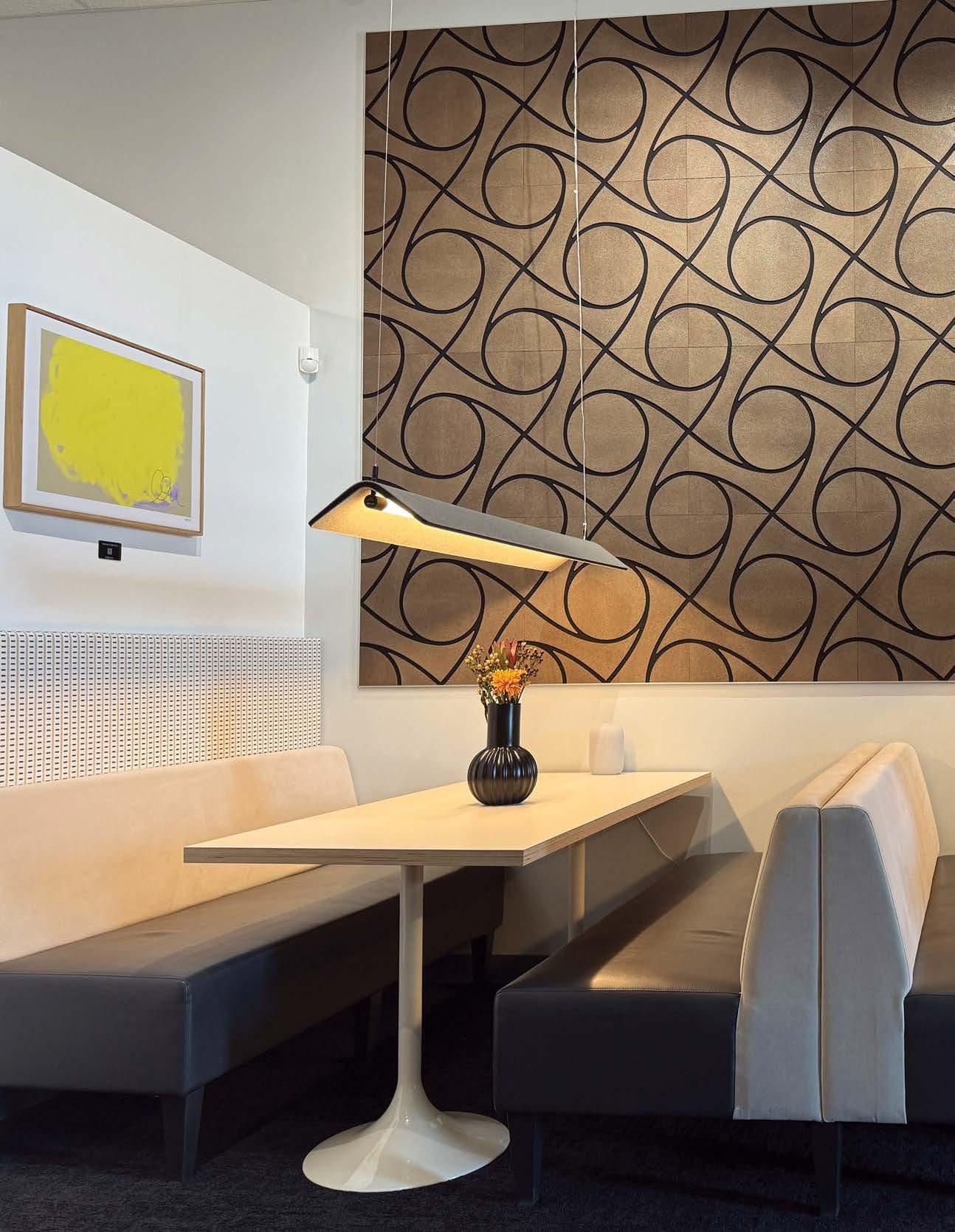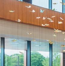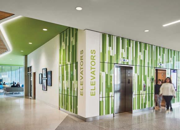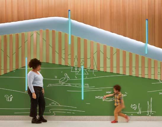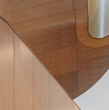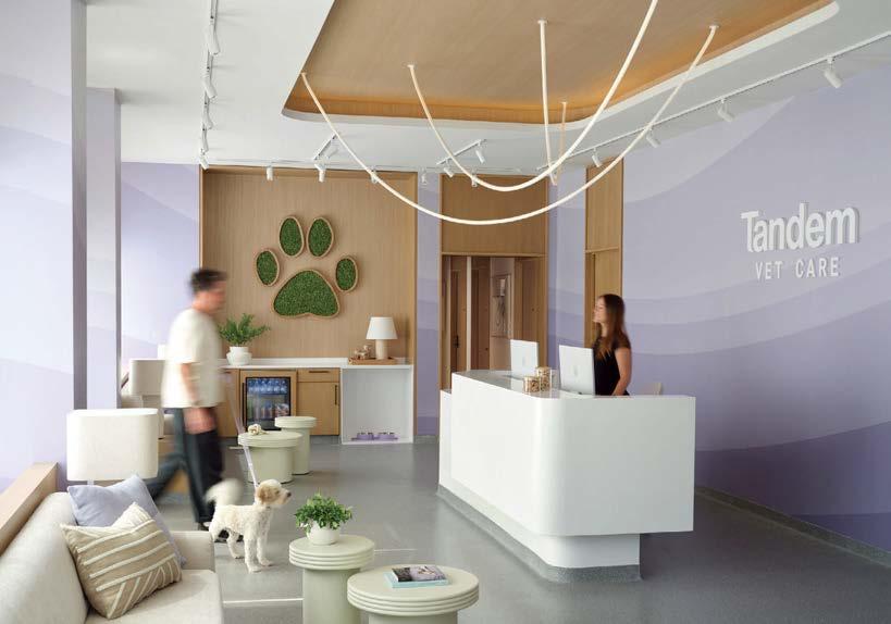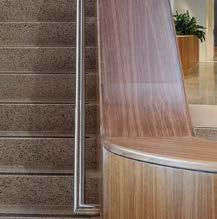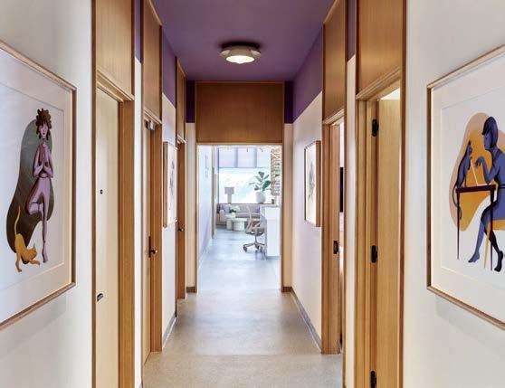 standout More than 30,000 square feet of this ground-up, 15-story office tower by architecture firm Goettsch Partners has been crafted by PDB to be flexible, welcoming, and wellness-oriented. That’s evident in the lobby, an airy 30-foot space with inviting velvetappointed curved sectionals, capped by a dramatic ceiling swoosh veneered in warm white oak. The upscale finishes continue on level five—a full floor of amenities—where glass-fronted training rooms are divisible and daylit, and lounges are like living rooms, with chenille-upholstered barrel chairs, marble-topped coffee tables, and carbon-neutral carpet tile.