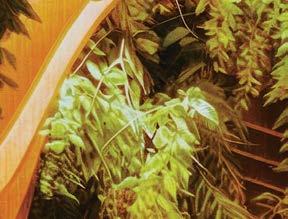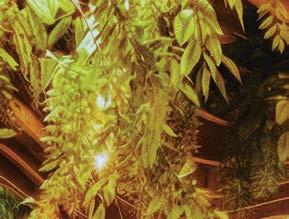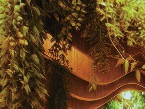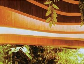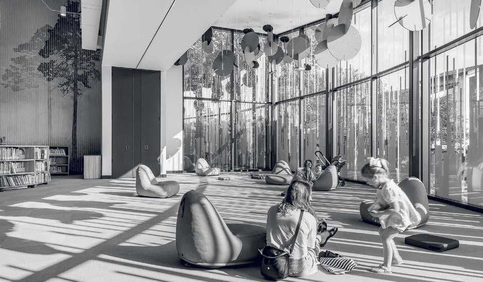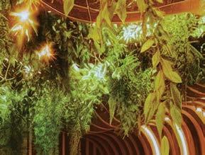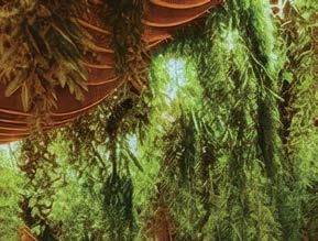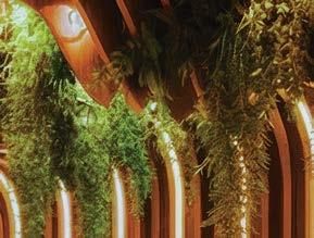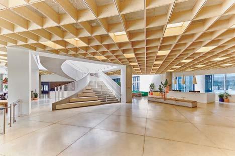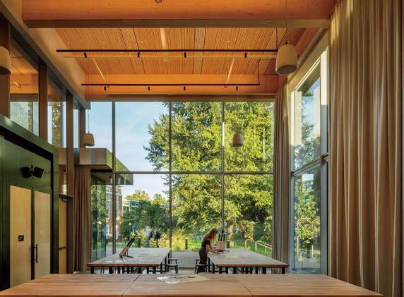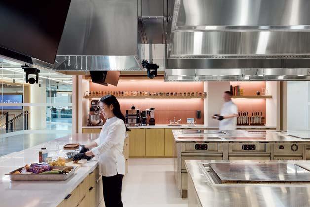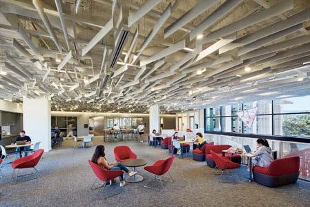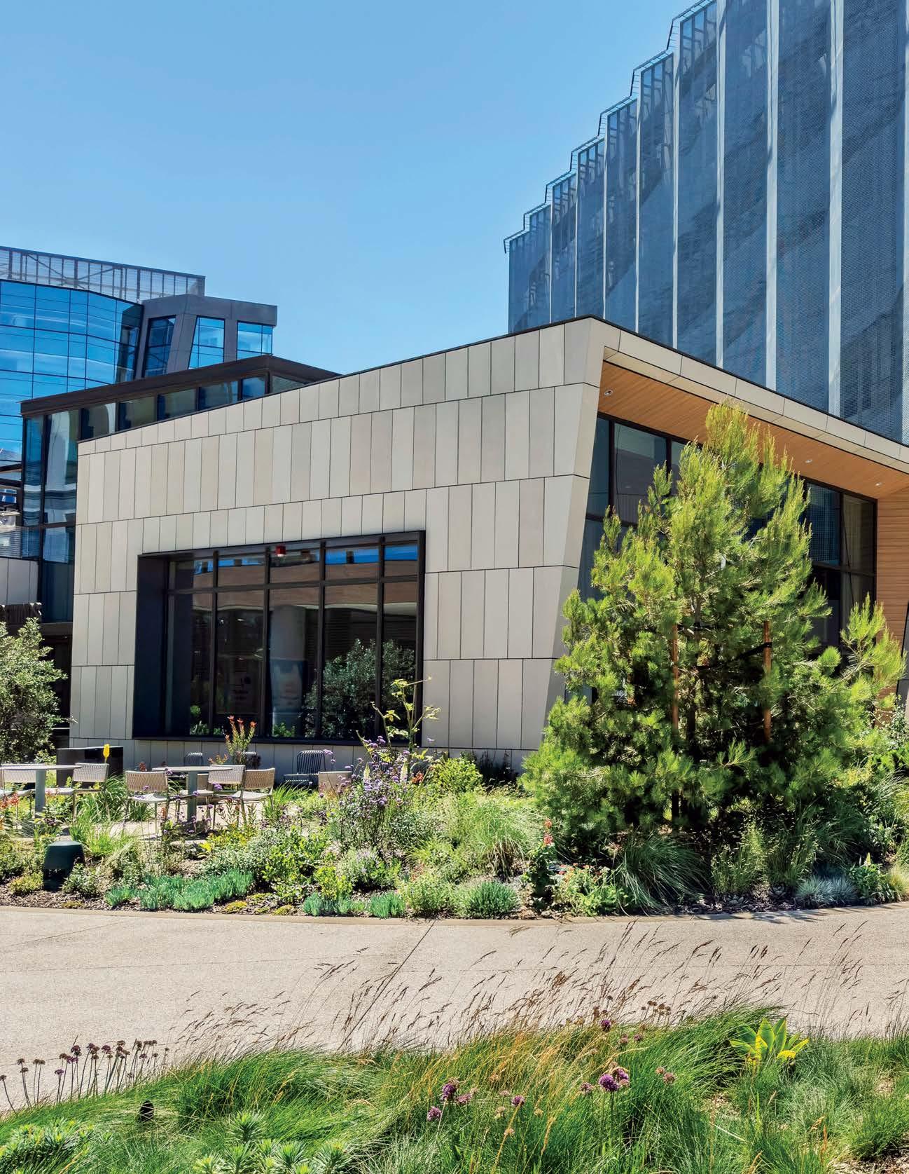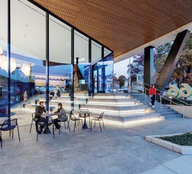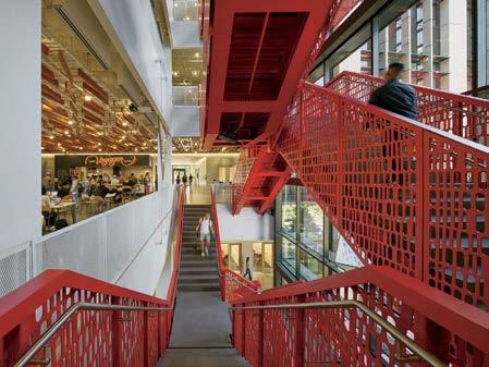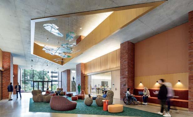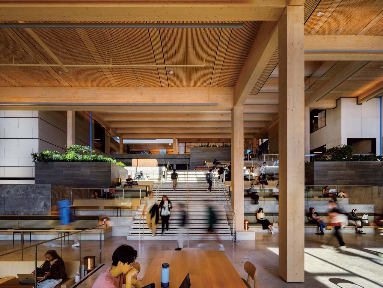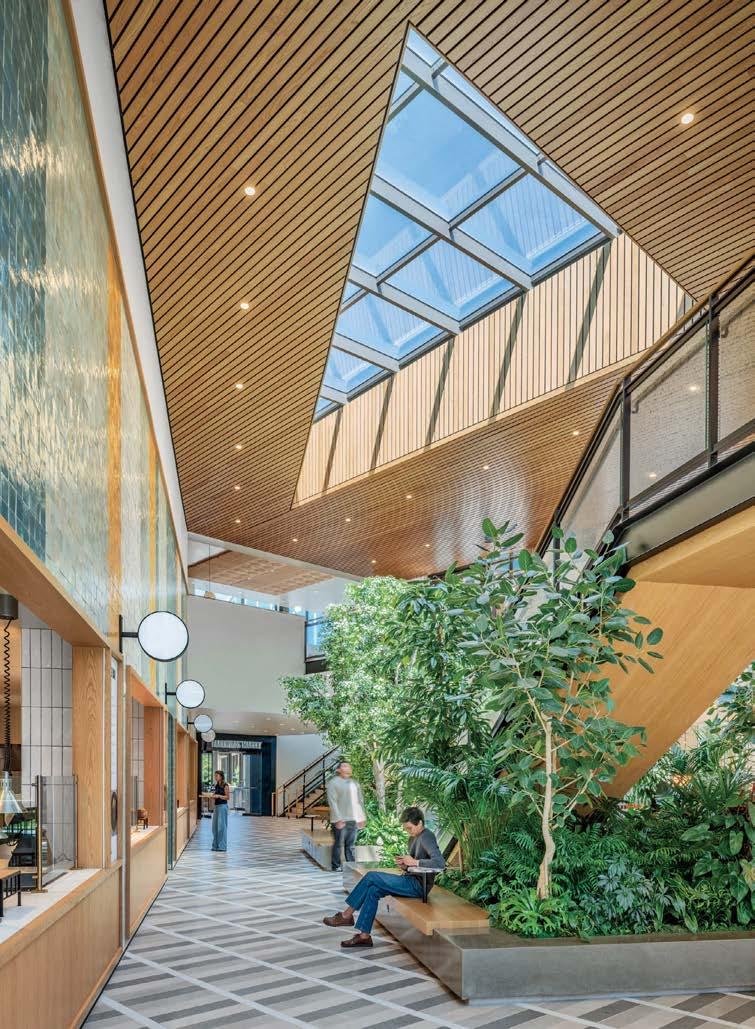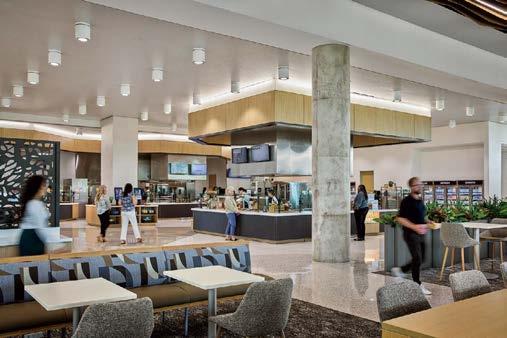 the nexus for everyone on campus, housing serveries, a grab-and-go market, lounges, and a private dining room. But first its massing had to be wrestled with. Petersen and Rapt explored shed roofs and coral shapes before landing on a rock-inspired, concreteclad structure, its double-height window walls like jagged faces on a geode. A triangular atrium is at its heart, filled with lush vegetation that helps blur the line between indoors and out. The ground floor hosts food stalls and dining areas; upstairs is a mezzanine with a terrace and bar. Natural light streams in from multiple angles.