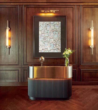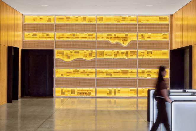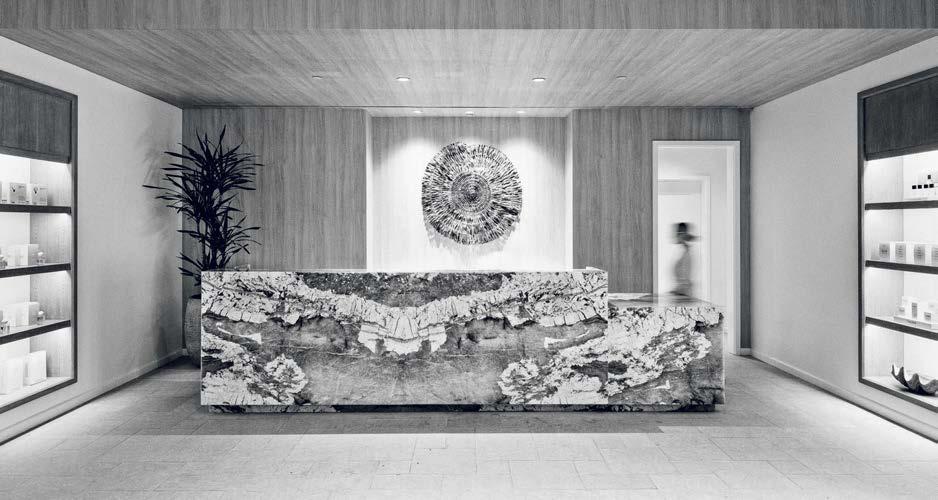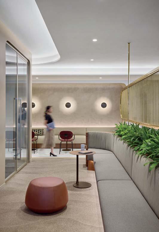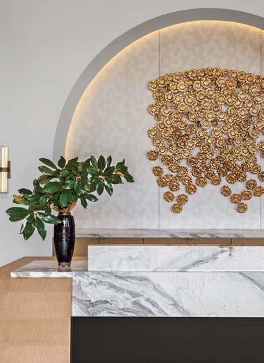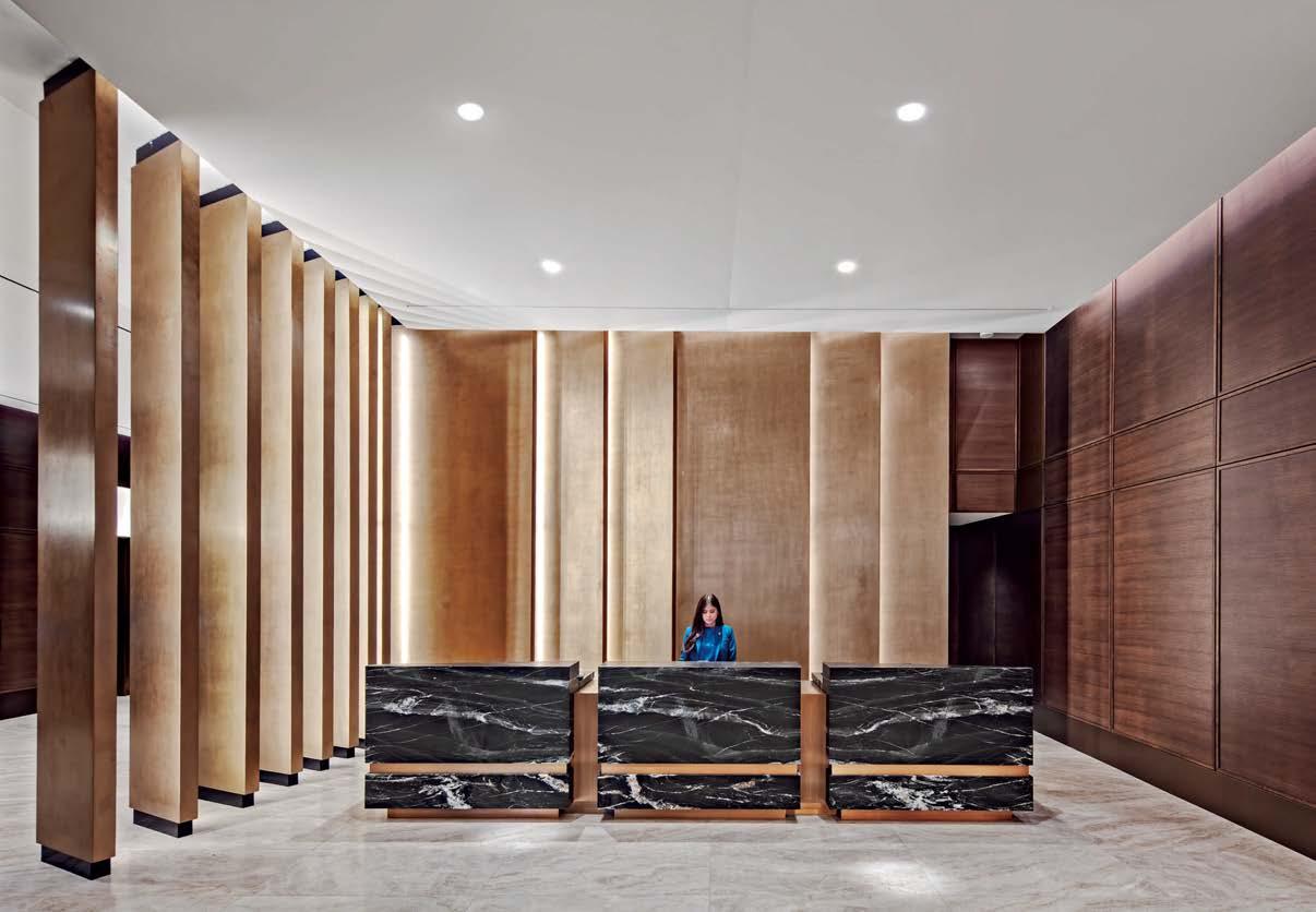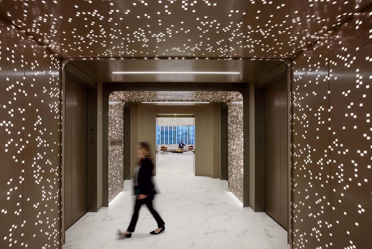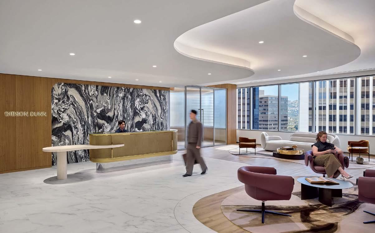standout When the 136-year-old law firm needed more space, it landed in a location that was top to bottom by the Giants’s highestranking firm, which orchestrated the 40,000-square-foot interiors on the penthouse floor of the Class A office building it designed in 2006. The workplace concept leans in to site context, starting with the glimmering elevator lobby, enveloped by custom aluminum panels that have been CNC-cut and backlit with LEDs for a constellation referencing the project’s Avenue of the Stars location. Farther in are nods to California sunsets and sandy beaches, such as reception’s rhythmic Cipollino Ondulato marble wall and ceiling of lapped drywall and plaster, the boardroom’s coastlinelike carpet (fittingly made of regenerated fishing nets), and a lounge aglow from Disco sconces by Jordi Miralbell and Mariona Raventós. photography Garrett Rowland.