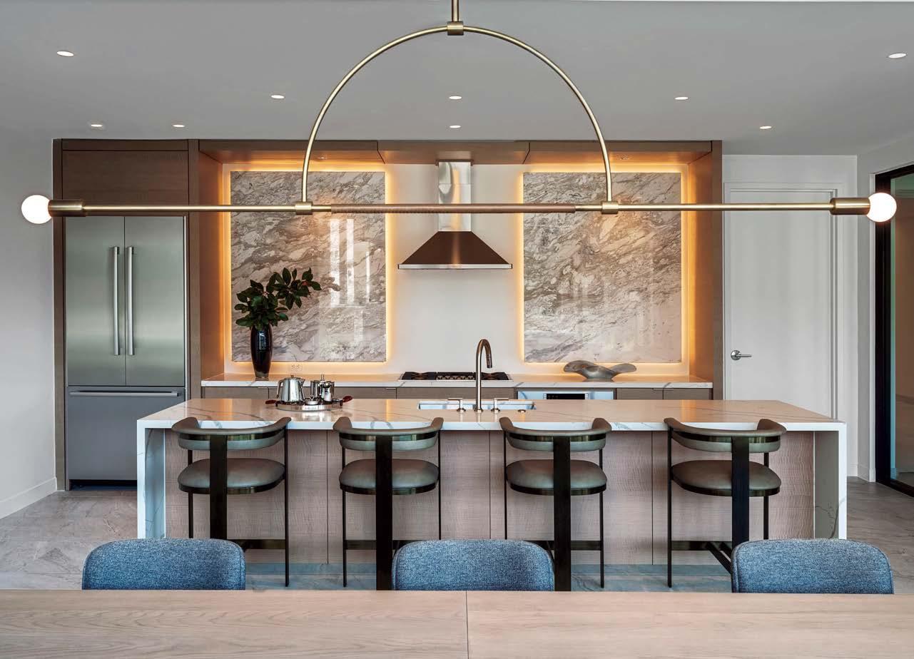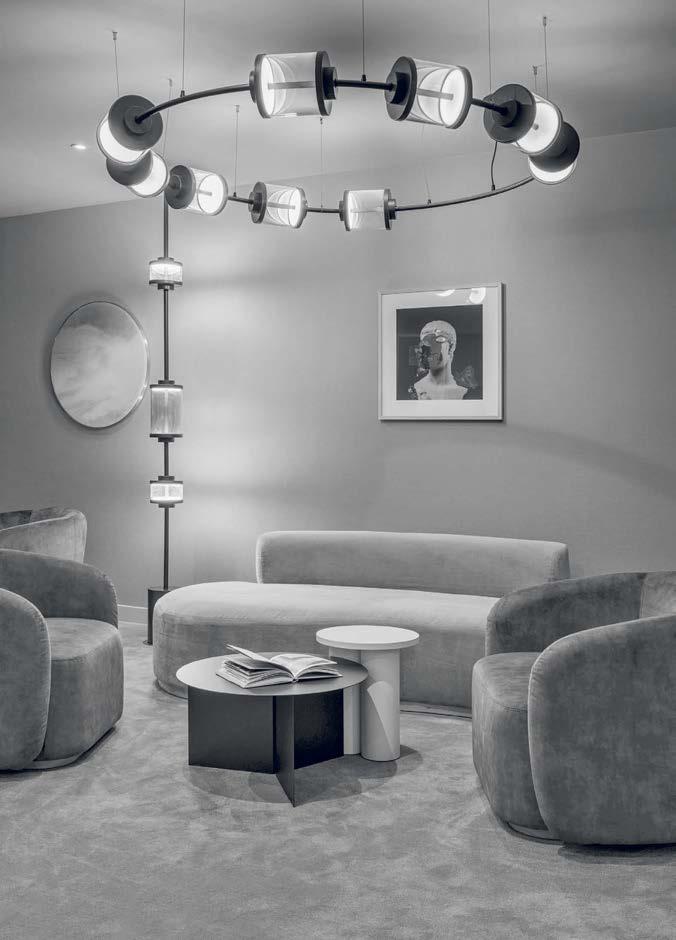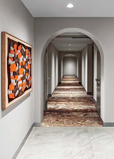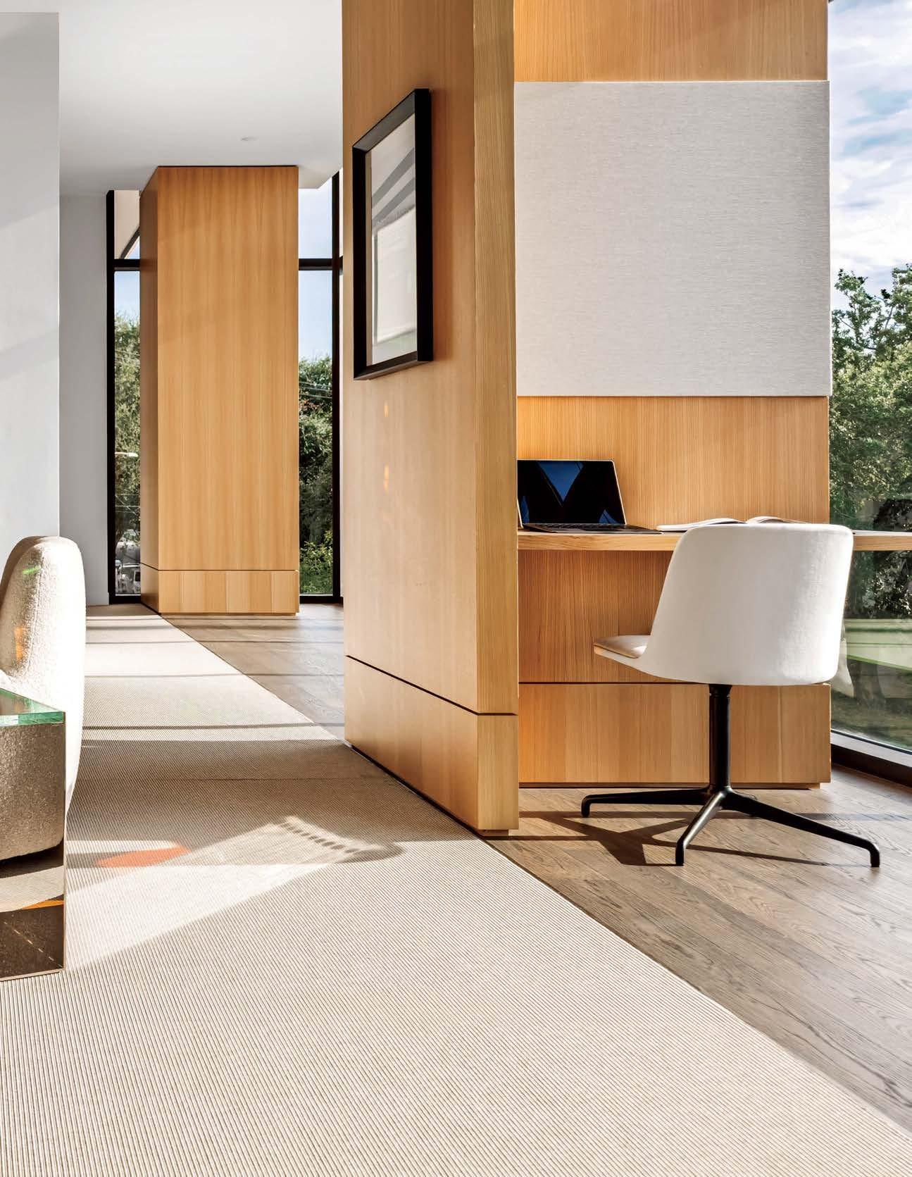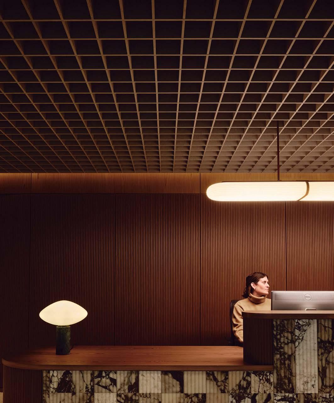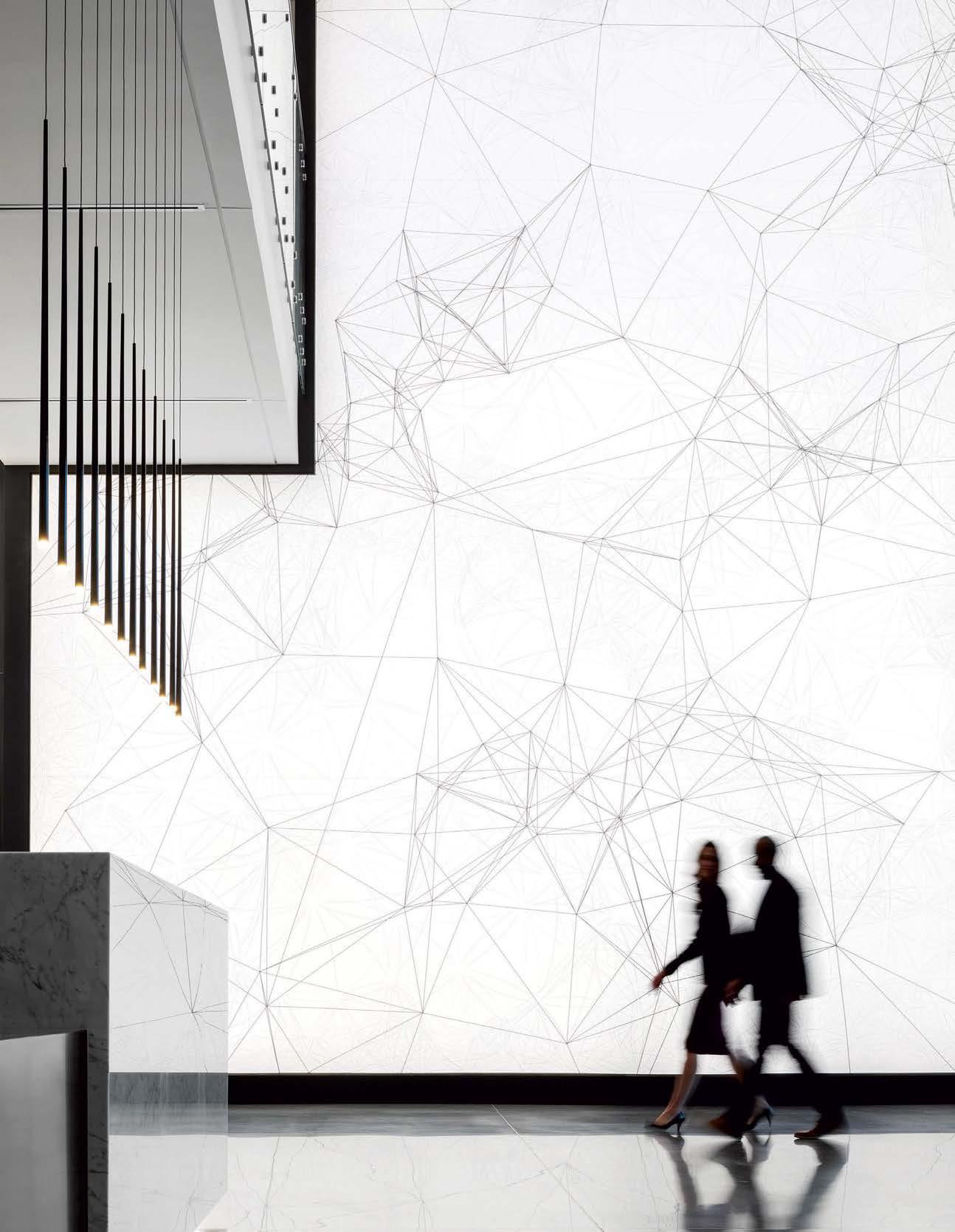 standout When the 136-year-old law firm needed more space, it landed in a location that was top to bottom by the Giants’s highestranking firm, which orchestrated the 40,000-square-foot interiors on the penthouse floor of the Class A office building it designed in 2006. The workplace concept leans in to site context, starting with the glimmering elevator lobby, enveloped by custom aluminum panels that have been CNC-cut and backlit with LEDs for a constellation referencing the project’s Avenue of the Stars location. Farther in are nods to California sunsets and sandy beaches, such as reception’s rhythmic Cipollino Ondulato marble wall and ceiling of lapped drywall and plaster, the boardroom’s coastlinelike carpet (fittingly made of regenerated fishing nets), and a lounge aglow from Disco sconces by Jordi Miralbell and Mariona Raventós. photography Garrett Rowland.