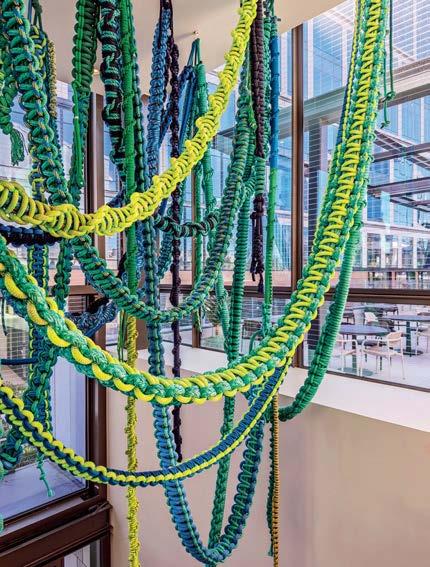 Opposite top: In one of two reception lobbies by Rapt, Tense pendant fixtures by New Works float above Finn Juhl’s Chieftain chairs, backdropped by a desk clad in Ijen Blue quartzite and an Alex Weinstein work in fiberglass, automotive paint, and aluminum. Opposite bottom: Pacific Eel Grass, an installation of yachting rope by macramé artist Jim Olarte, hangs above an entrance to the Farewinds food hall.