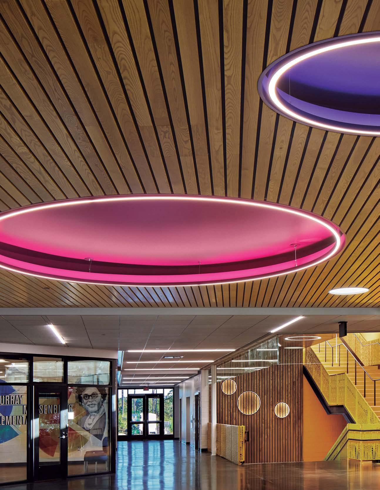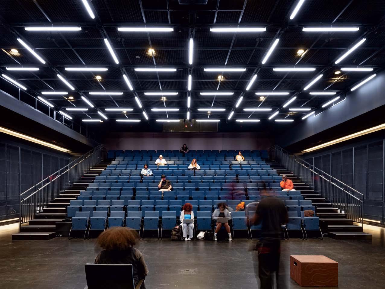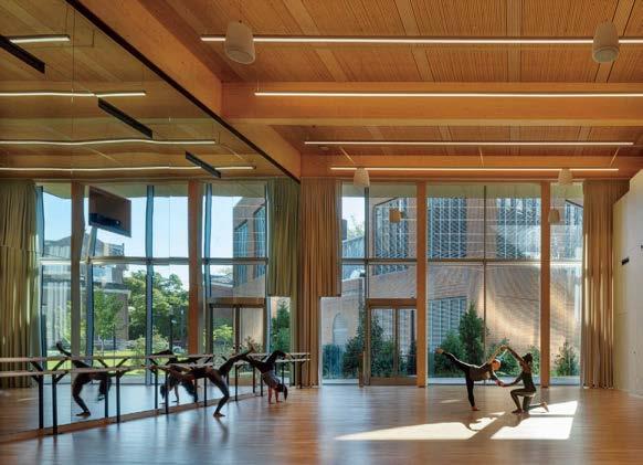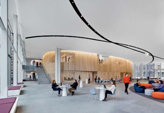 standout Even in academia, Rockwell delivers cinematic, engaging interiors. Collaborating with design architect BIG–Bjarke Ingels Group, the 150,000-square-foot project combines spaces geared for hospitality, performance, and mindfulness across four floors, which center on an atrium “living room,” a convivial, open-flow expanse defined by mass-timber columns and ceilings and a limestone feature stair, all radiated by study and dining areas. Included in the program are multiple rooms for reflection, art-making, dance classes, and music rehearsals, the final version of which may appear in the black-box theater, its 250 seats sporting recycled polyester–blend upholstery in a JHU Blue Jays colorway.