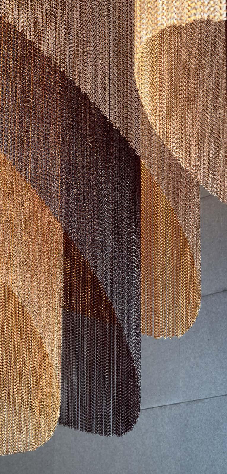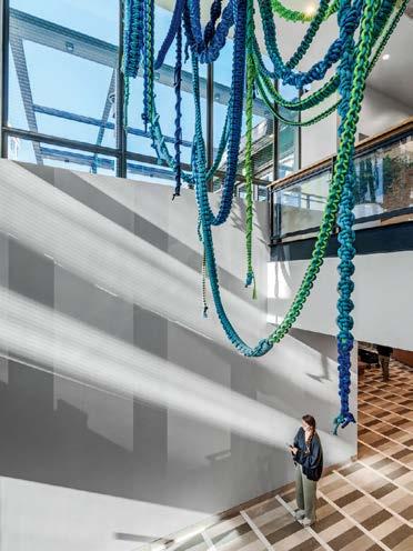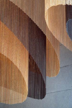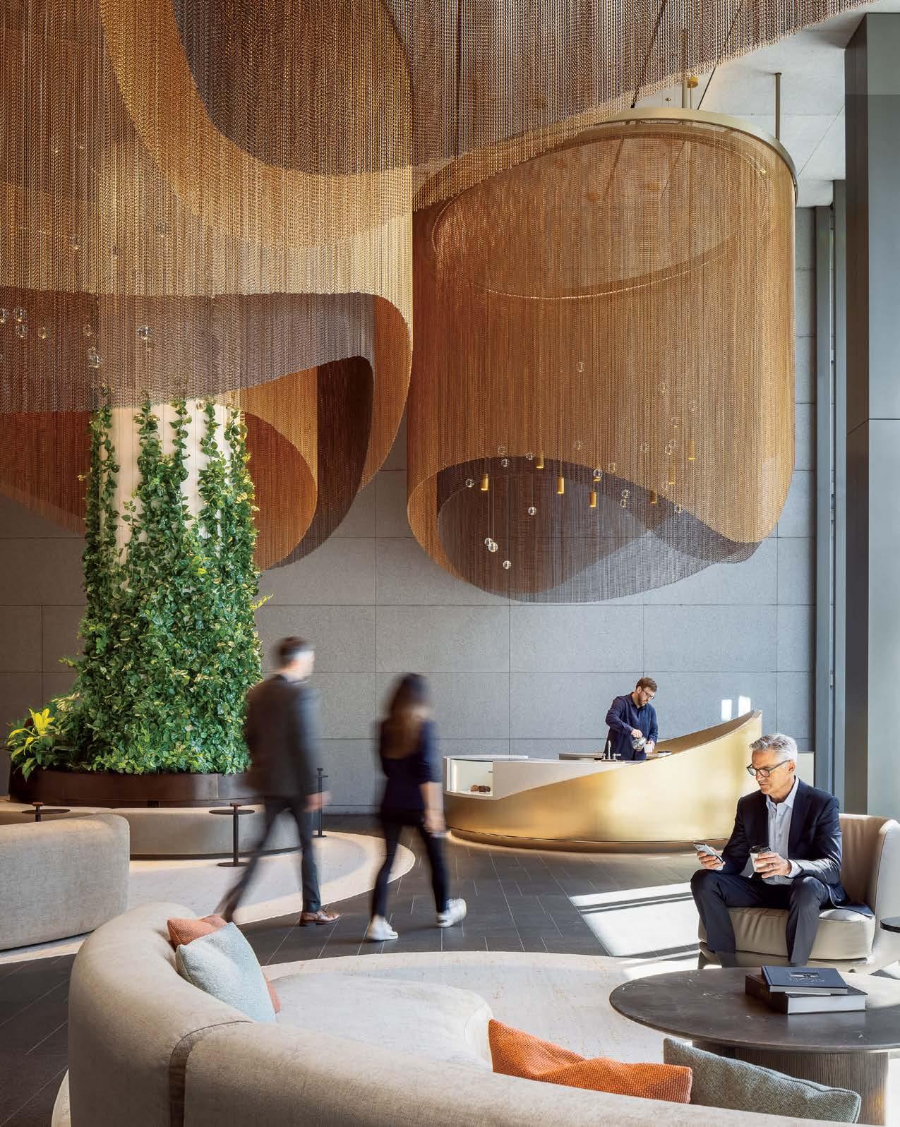 standout The renovation of this 5,000-square-foot lobby and adjoining event space, inside a landmarked 12-story office building constructed for Pacific Bell in 1964, was influenced by and protects nature. Anchored by repurposed granite flooring are luxe, earth-tone furnishings—Francesco Rota’s Cosy Curve sectionals upholstered in woven slub and heathered yarns, Velvet armchairs by Matteo Zorzenoni—accompanied by live tropical plants and a luminous brushed gold–finished coffee kiosk. Poetically tying it all together are a series of dramatic ceiling installations composed of two-color, anodized-aluminum chain link ranging from 7 to 13 feet long, their silhouettes nodding to the city’s prevalent coastal fog. photography Sean Airhart/NBBJ.