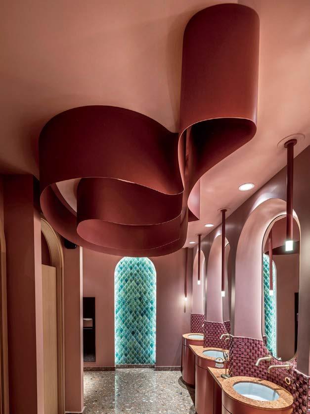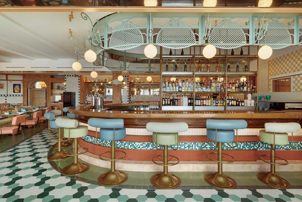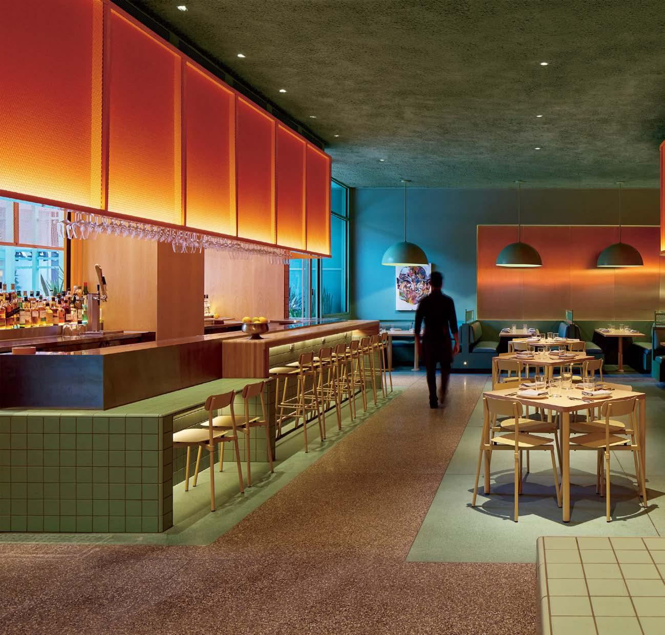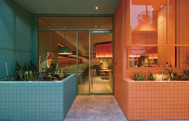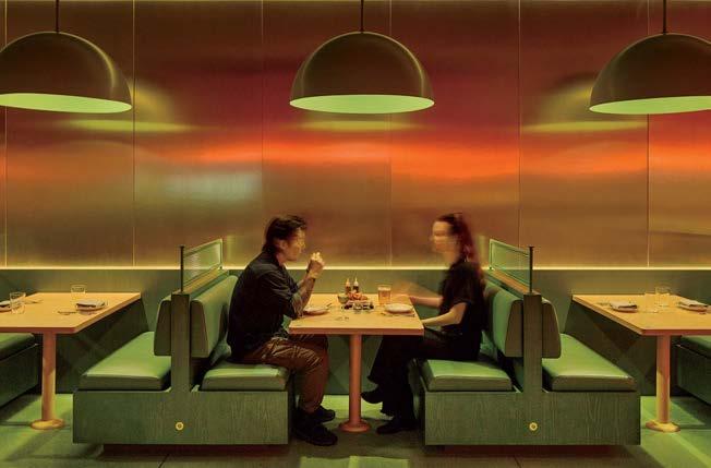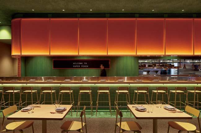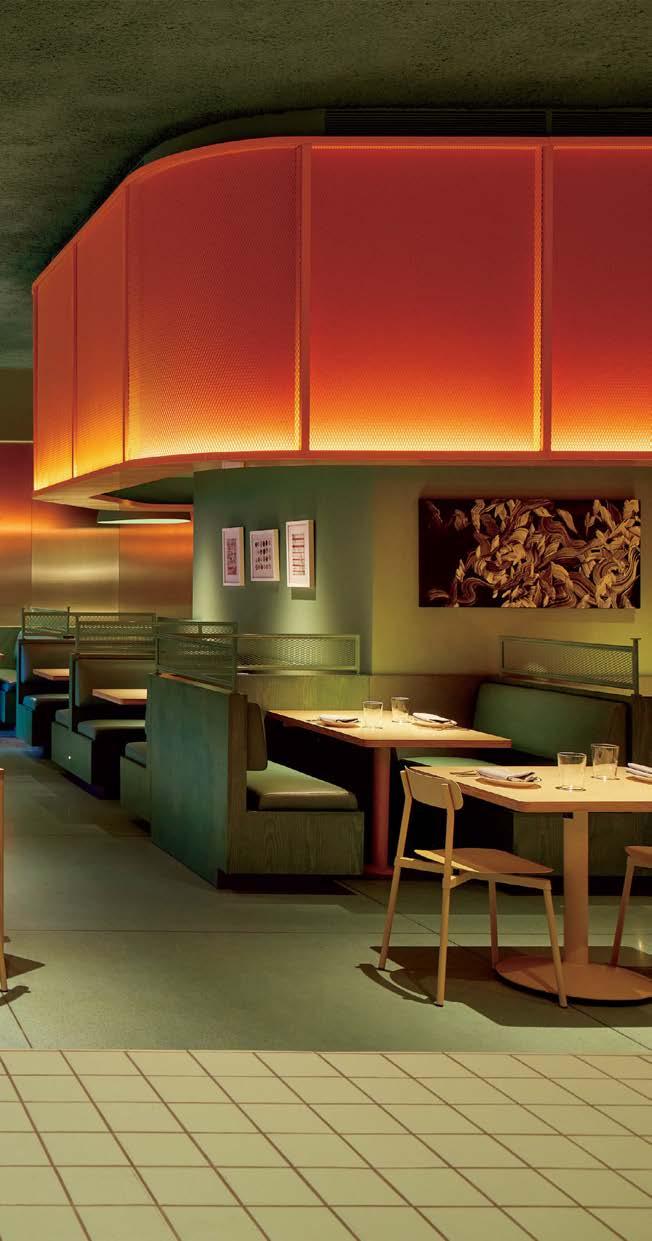 rising giants #132. project Super Peach, Los Angeles. standout For chef David Chang’s latest West Coast eatery, he returned to the firm that designed his Momofuku Noodle Bar Uptown in New York in 2018. The concept for this nearly 10,000-squarefoot commission extends beyond the noodle-centric format into a more expansive, all-day offering emphasizing variety, sociability, and performance, which INC expressed with a theater-in-the-round layout, a visible open kitchen, and a mix of booths, bars, and custom birch-ply tables that encourage lingering and interaction. Via upper swaths of powder-coated metal mesh and uplit acoustic panel, glazed porcelain tile, 36-inch-diameter pendant domes, and a SonaSprayed ceiling, the palette focuses on citrus and grounding earthy-green tones as a literal and atmospheric representation of the restaurant name and company branding. photography Ye Rin Mok.
