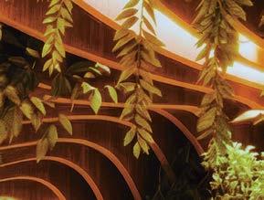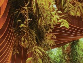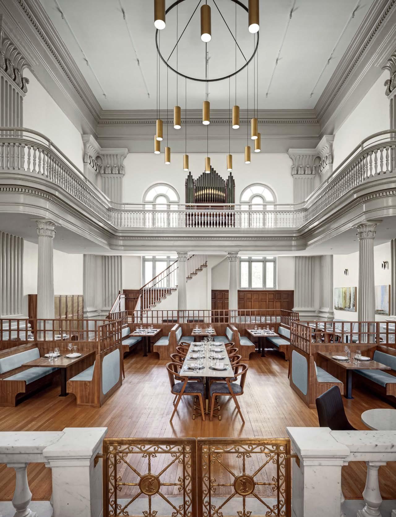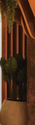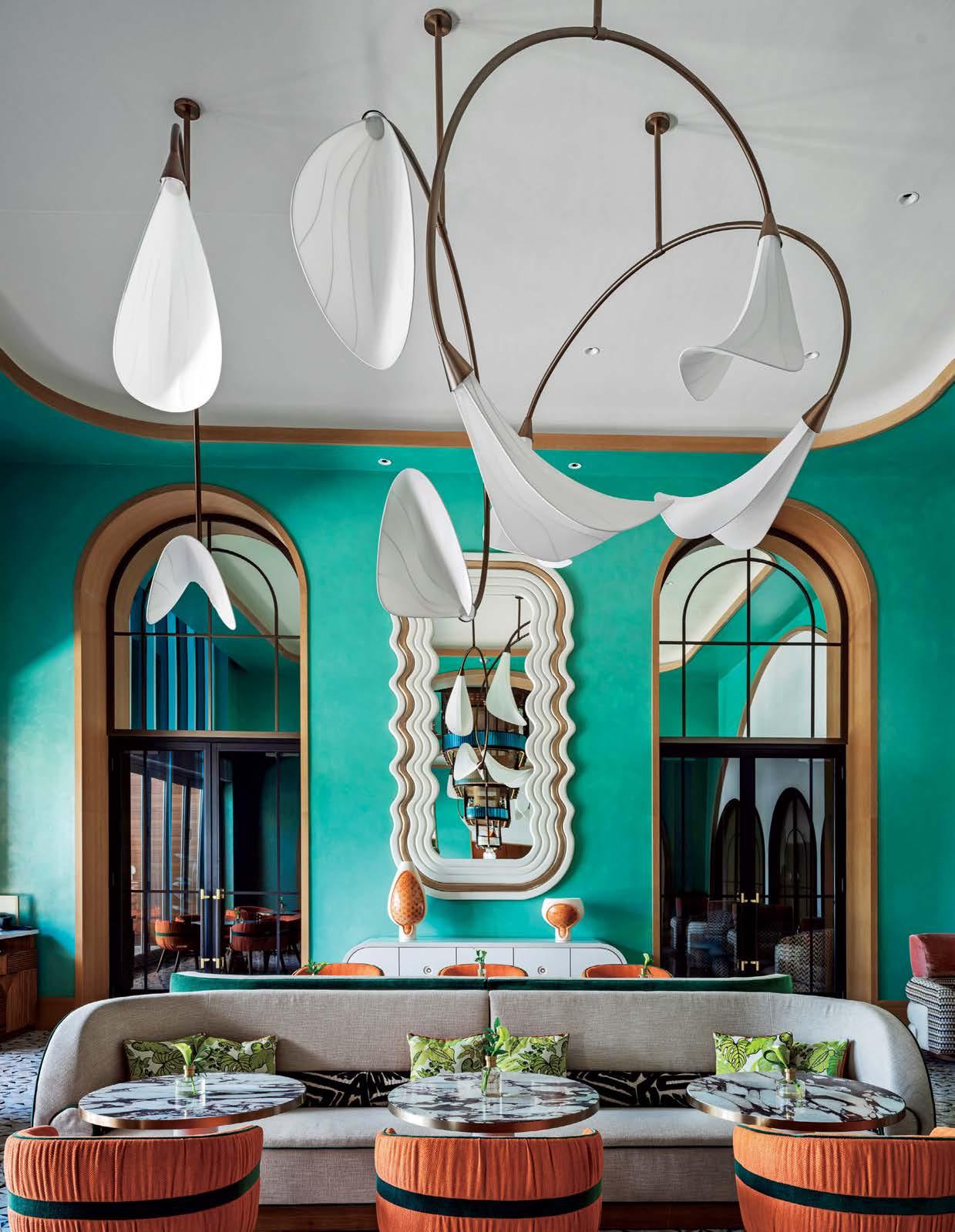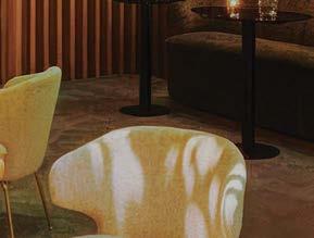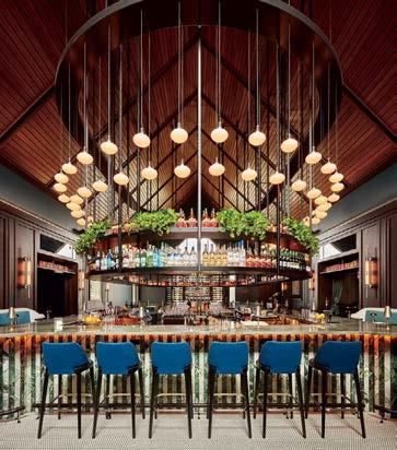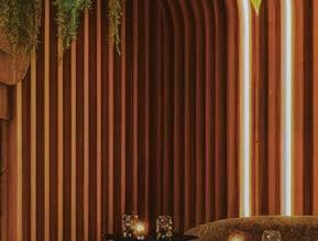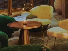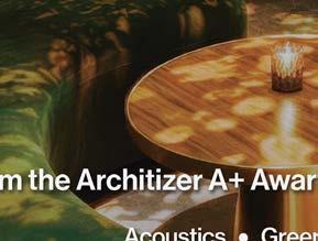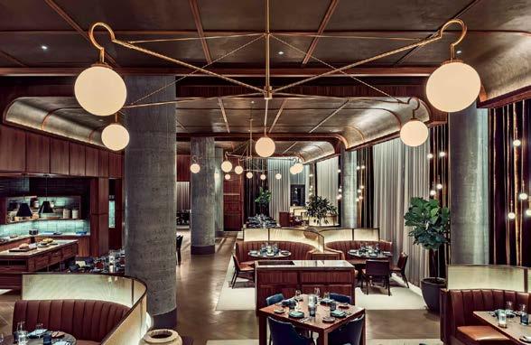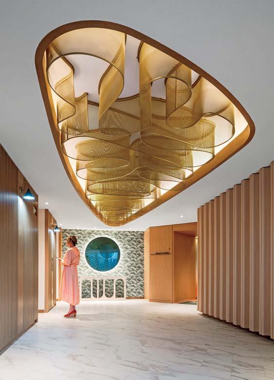 rising giants #132. project Super Peach, Los Angeles. standout For chef David Chang’s latest West Coast eatery, he returned to the firm that designed his Momofuku Noodle Bar Uptown in New York in 2018. The concept for this nearly 10,000-squarefoot commission extends beyond the noodle-centric format into a more expansive, all-day offering emphasizing variety, sociability, and performance, which INC expressed with a theater-in-the-round layout, a visible open kitchen, and a mix of booths, bars, and custom birch-ply tables that encourage lingering and interaction. Via upper swaths of powder-coated metal mesh and uplit acoustic panel, glazed porcelain tile, 36-inch-diameter pendant domes, and a SonaSprayed ceiling, the palette focuses on citrus and grounding earthy-green tones as a literal and atmospheric representation of the restaurant name and company branding. photography Ye Rin Mok.
