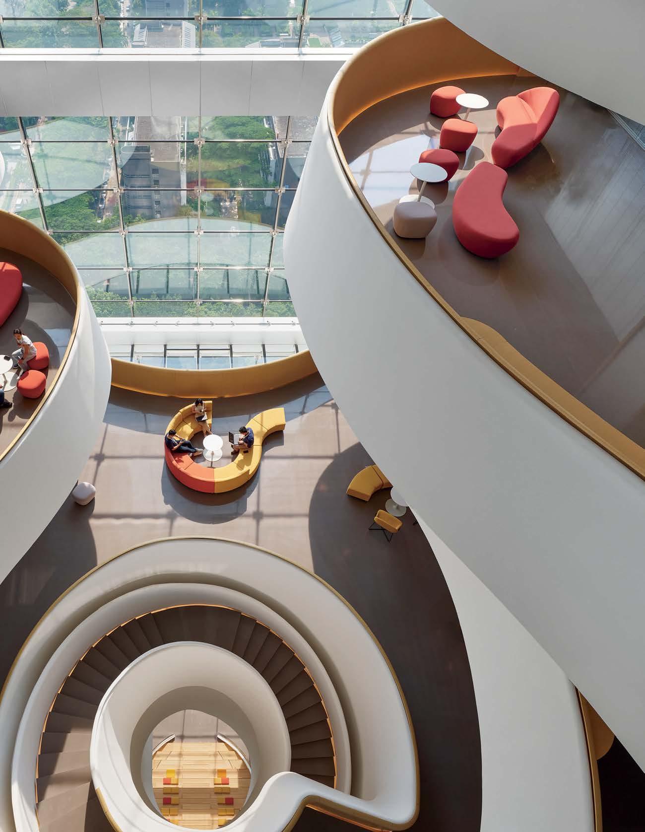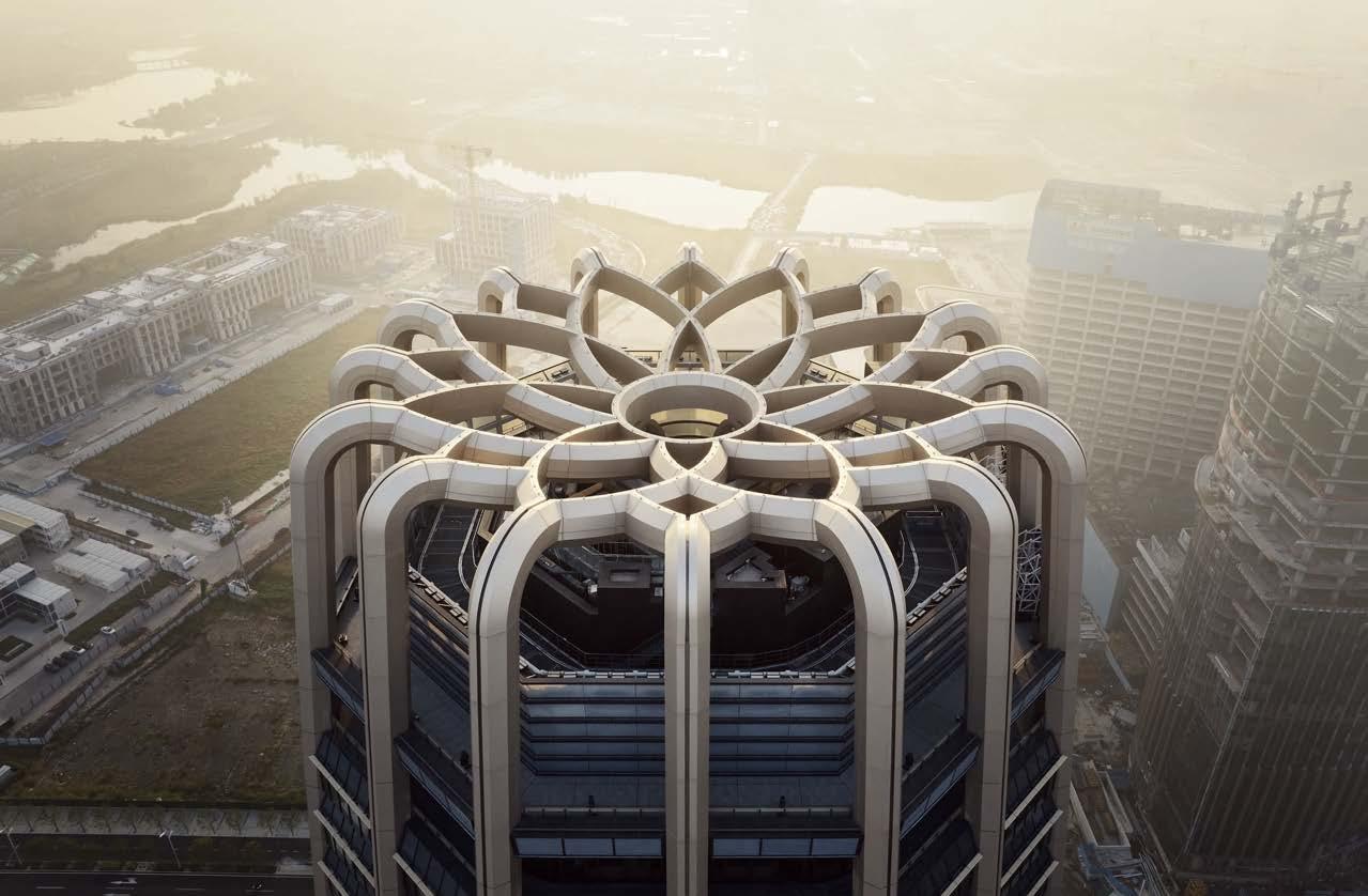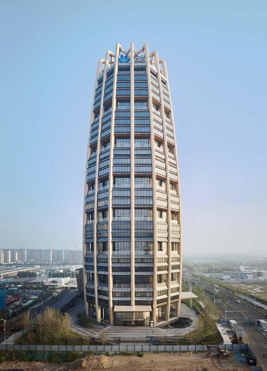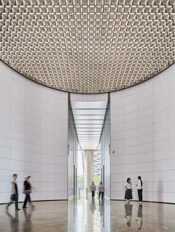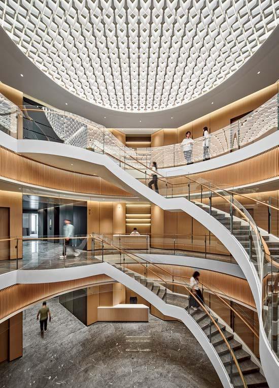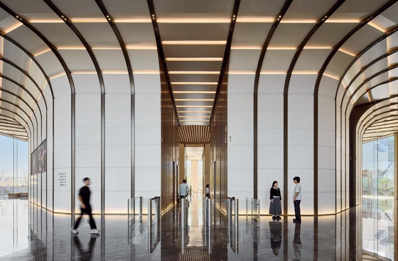 standout The 31-story headquarters for one of the world’s largest chemical companies is a beacon of high performance. A dominant material is aluminum paneling, which, for the exterior crown, has been arranged in a peony form referencing Sinochem’s corporate identity and the Chinese symbol for prosperity, renewal, and vitality. The metal reappears inside, surrounding the lobby, where it’s champagne-toned or bronze-finished, and wrapping the 40-foot atrium, one of six, where it resembles bamboo. The recyclable material joins photovoltaics, passive solar control, and natural ventilation and daylighting, which has the nearly 1 million-square-foot project targeting LEED Platinum certification and net-zero energy in operations by 2050. photography Qingyan Zhu.