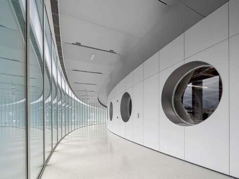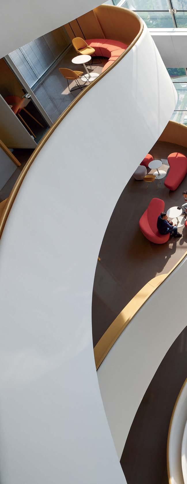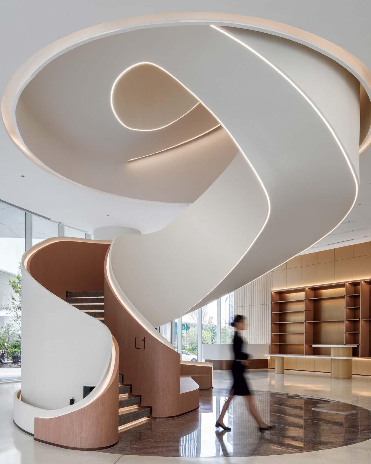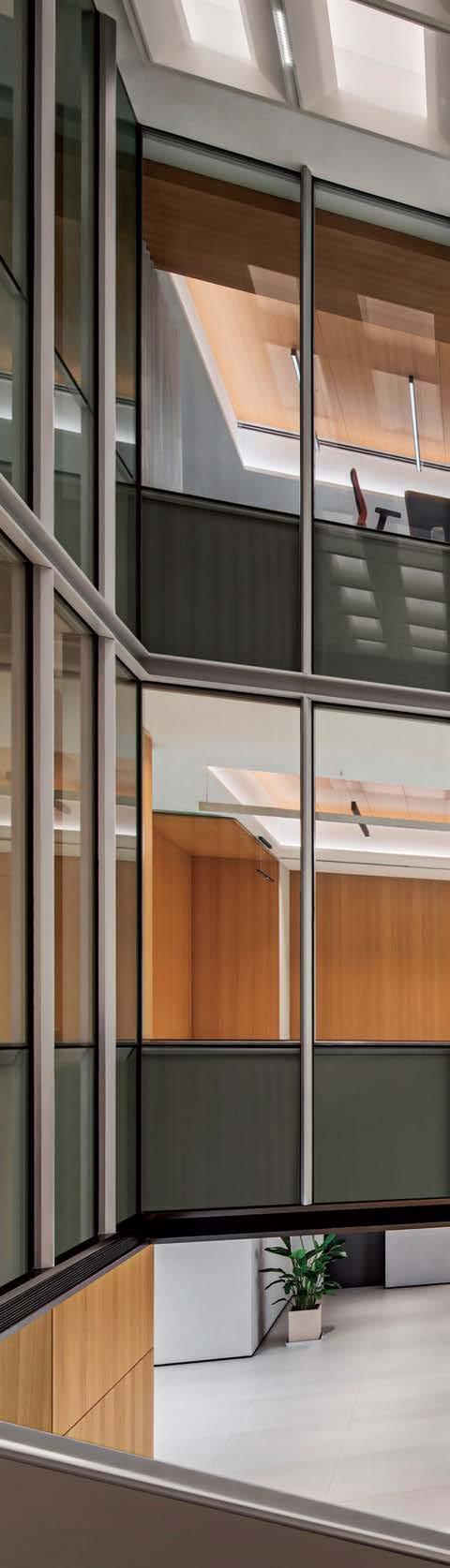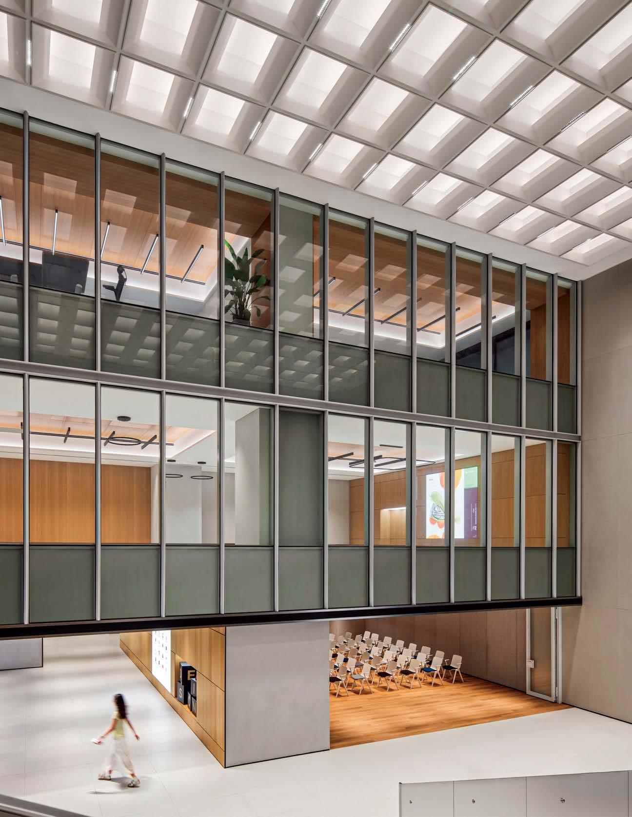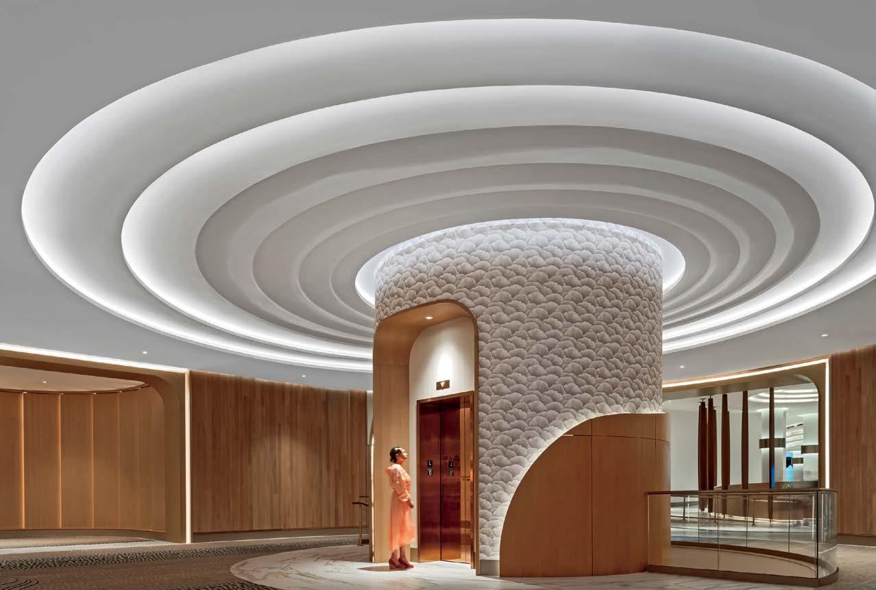 standout The 31-story headquarters for one of the world’s largest chemical companies is a beacon of high performance. A dominant material is aluminum paneling, which, for the exterior crown, has been arranged in a peony form referencing Sinochem’s corporate identity and the Chinese symbol for prosperity, renewal, and vitality. The metal reappears inside, surrounding the lobby, where it’s champagne-toned or bronze-finished, and wrapping the 40-foot atrium, one of six, where it resembles bamboo. The recyclable material joins photovoltaics, passive solar control, and natural ventilation and daylighting, which has the nearly 1 million-square-foot project targeting LEED Platinum certification and net-zero energy in operations by 2050. photography Qingyan Zhu.