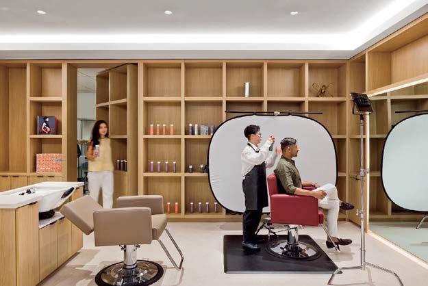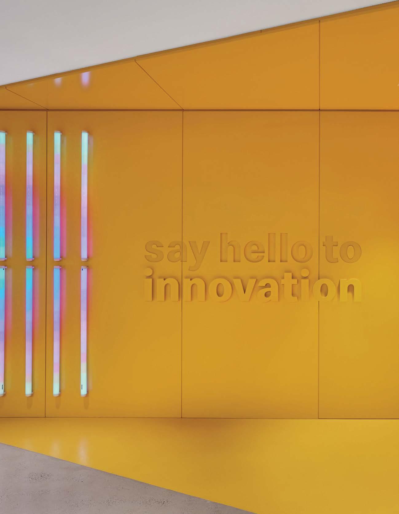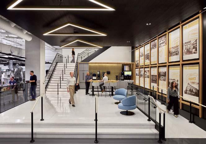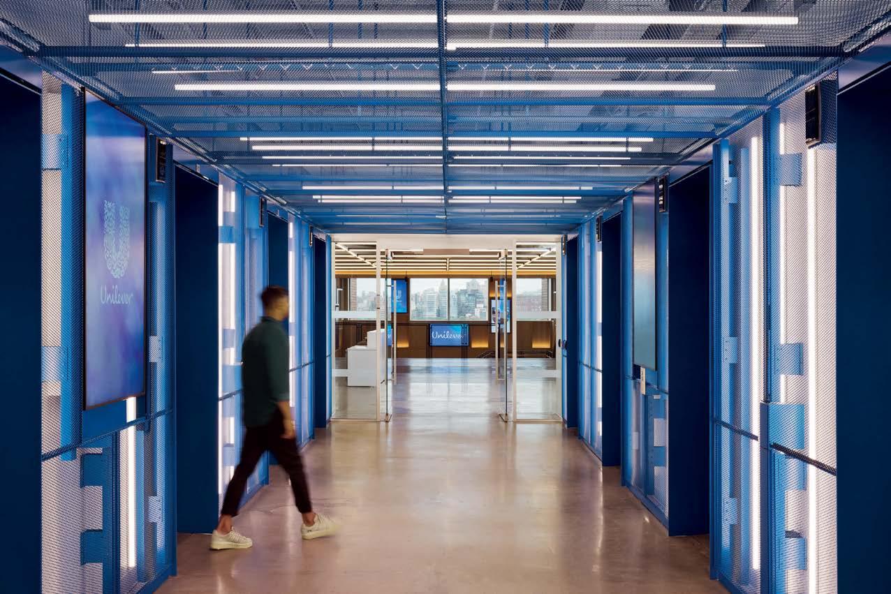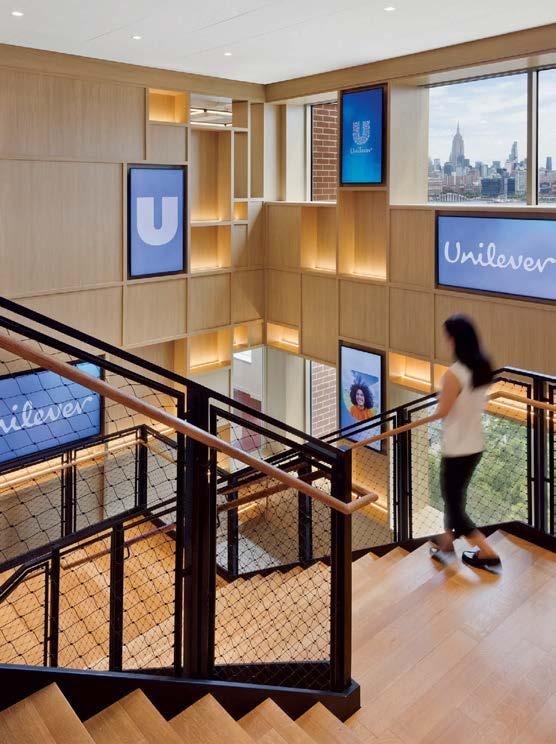standout It’s not often a multinational consumer-goods company condenses its headquarters, but right-sizing and increasing efficiency are what P&W did for the U.S. outpost of the British entity that makes Hellmann’s, Dove, and Vaseline. Throughout the 111,000-square-foot, three-level workplace, which relocated from 350,000 square feet in suburbia to a waterfront downtown with Manhattan views, are bold, bright expressions of collaboration, celebration, and consumer love— core culture anchors—such as the elevator lobby’s Unilever Blue metal-mesh panels, the hub’s violet Uptown Social sectionals by Achella Design, and, around the main stair in FSC-certified reclaimed white oak, the 10 screens looping campaigns and products. Those and new products get developed in the professional-grade kitchen and full-service beauty salon.