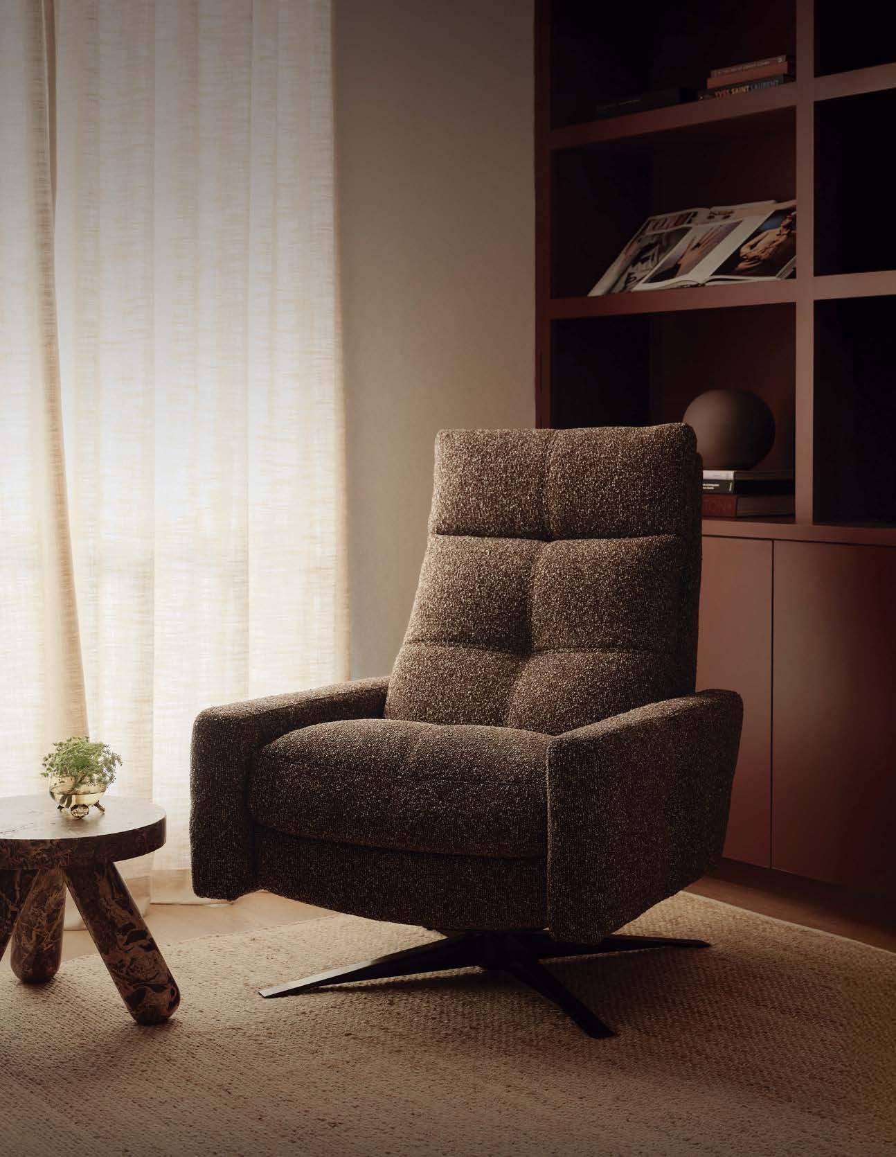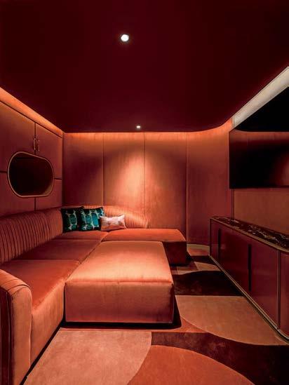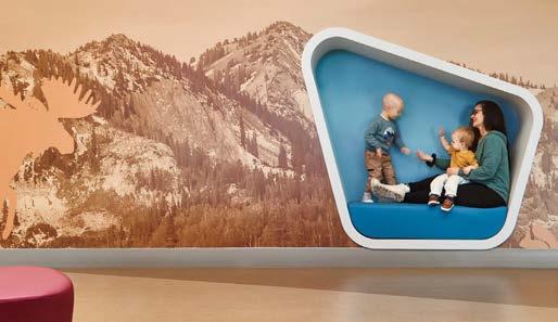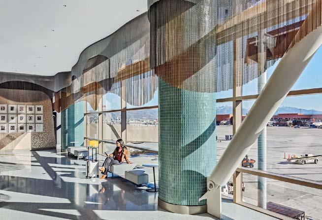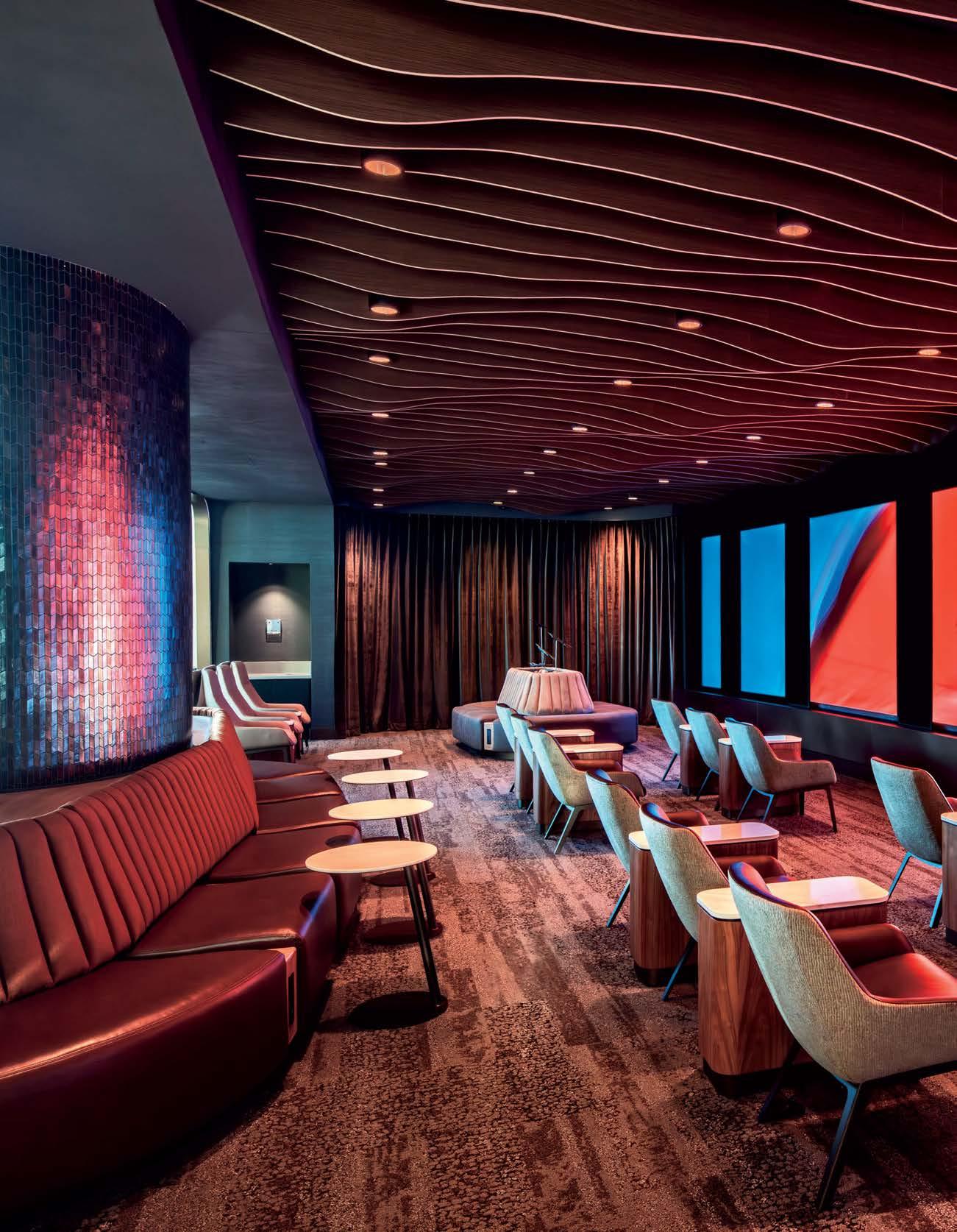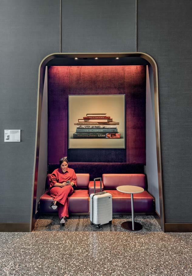 Previous spread: At the Delta Sky Club at Salt Lake City International Airport Concourse B by HOK, an immersion room is a calming, quiet retreat for neurodiverse guests, with velvet drapery, acoustical felt baffles, and Boss Design’s Marnie lounge chairs facing LED screens looping Utah landmarks as if seen through a plane window.