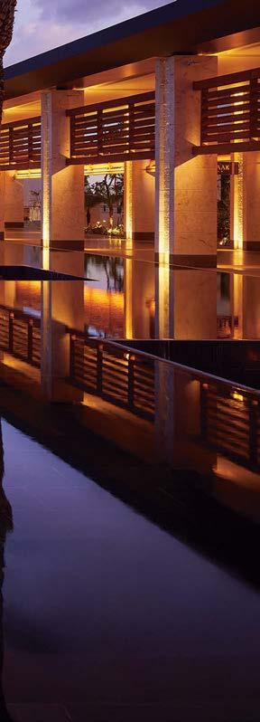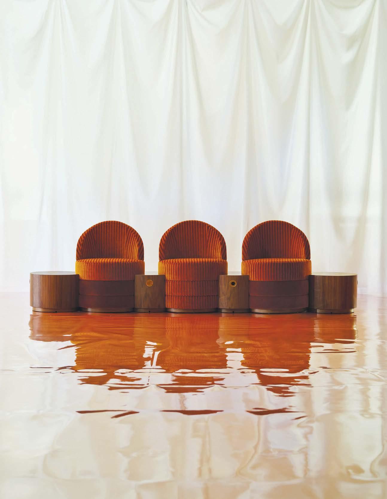 FROM FRONT ARCHITEX: DRAPERY FABRIC (IMMERSION). FUTUMIS: CUSTOM TABLES. BOSS DESIGN: CHAIRS (IMMERSION), GREEN SOFAS (LOUNGE), STOOLS (BAR AREA). KRISKADECOR: CHAIN (ARRIVAL). 3FORM: GLASS (ENTRY). KEILHAUER: ORANGE CHAIRS, B ARREL CHAIRS (LOUNGE). PAUL BRAYTON