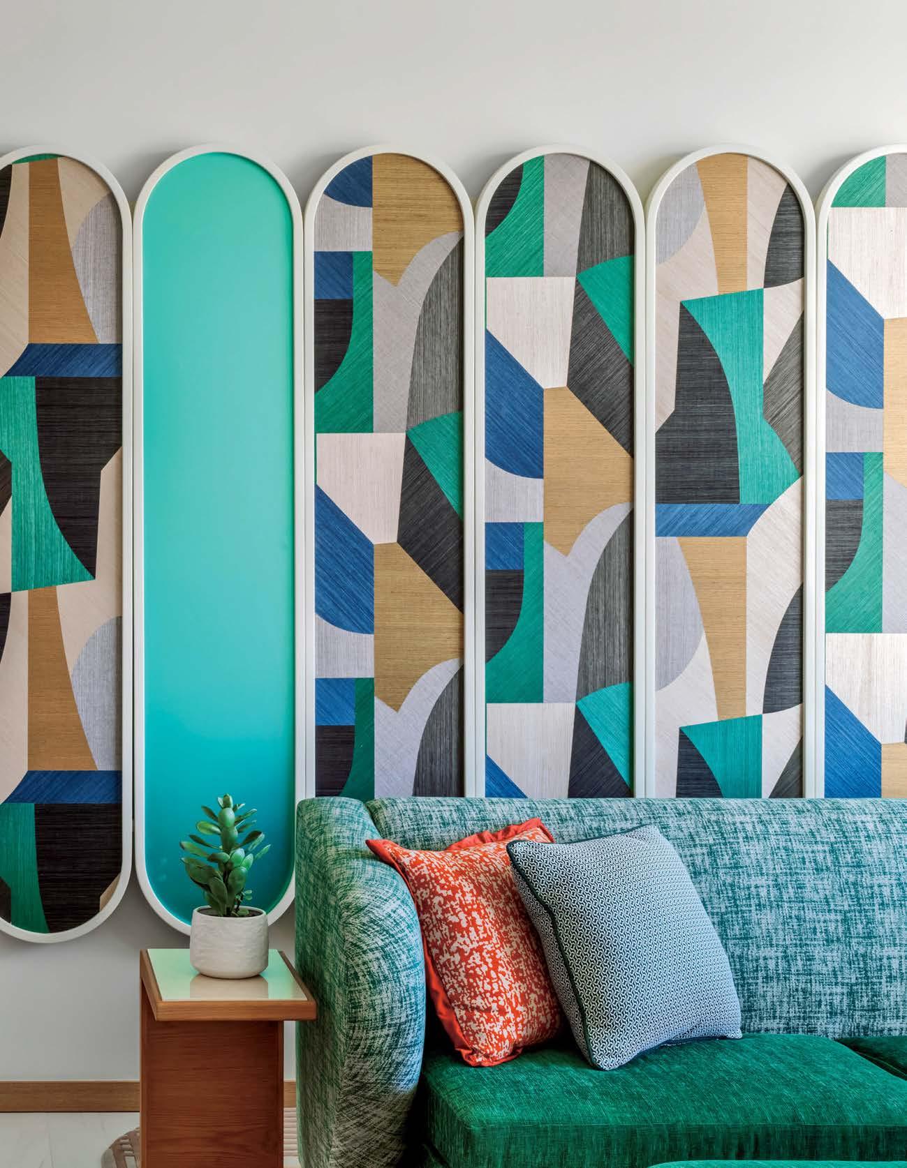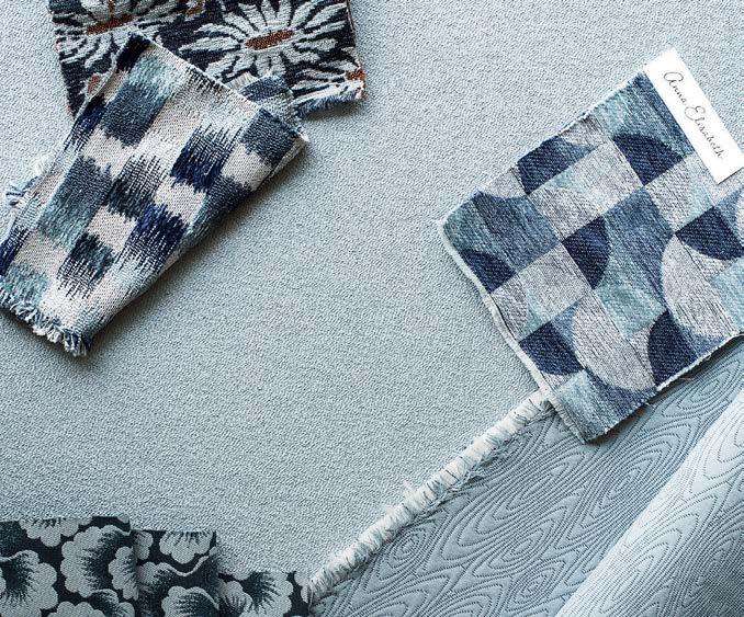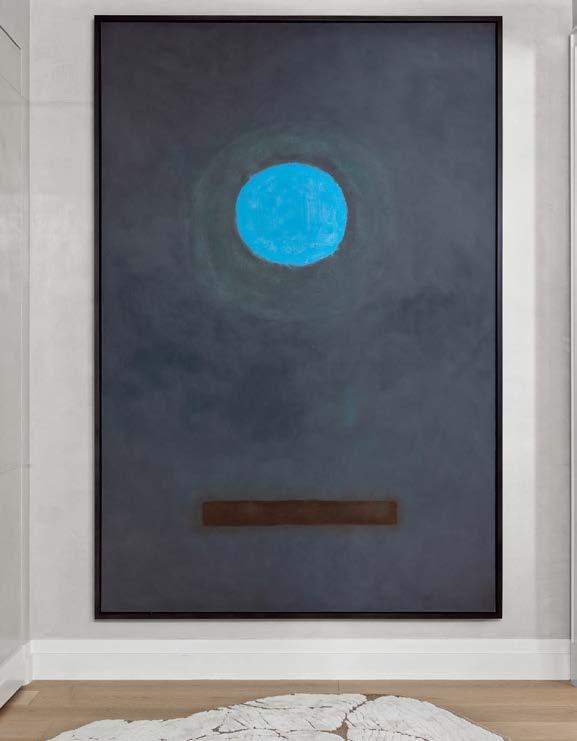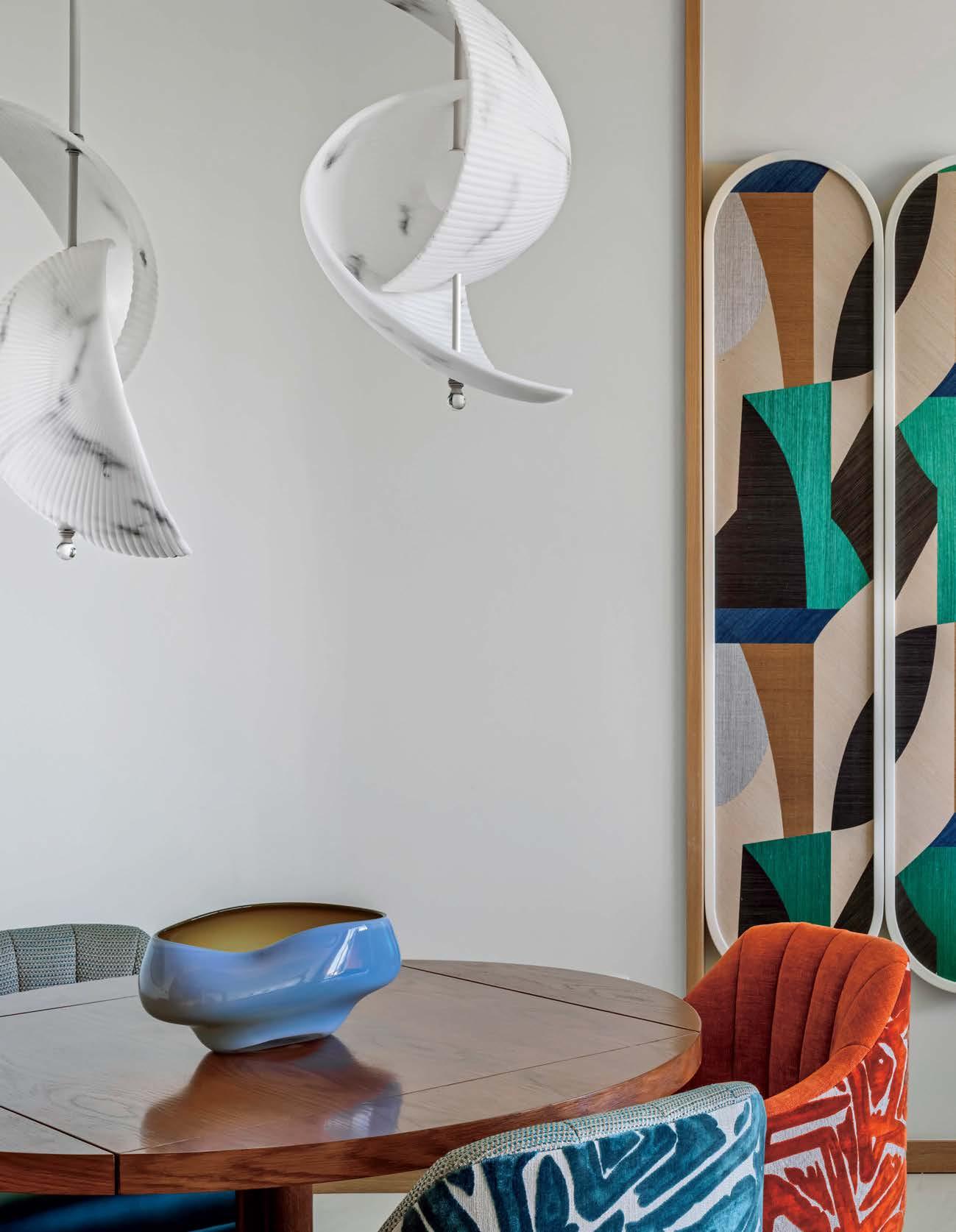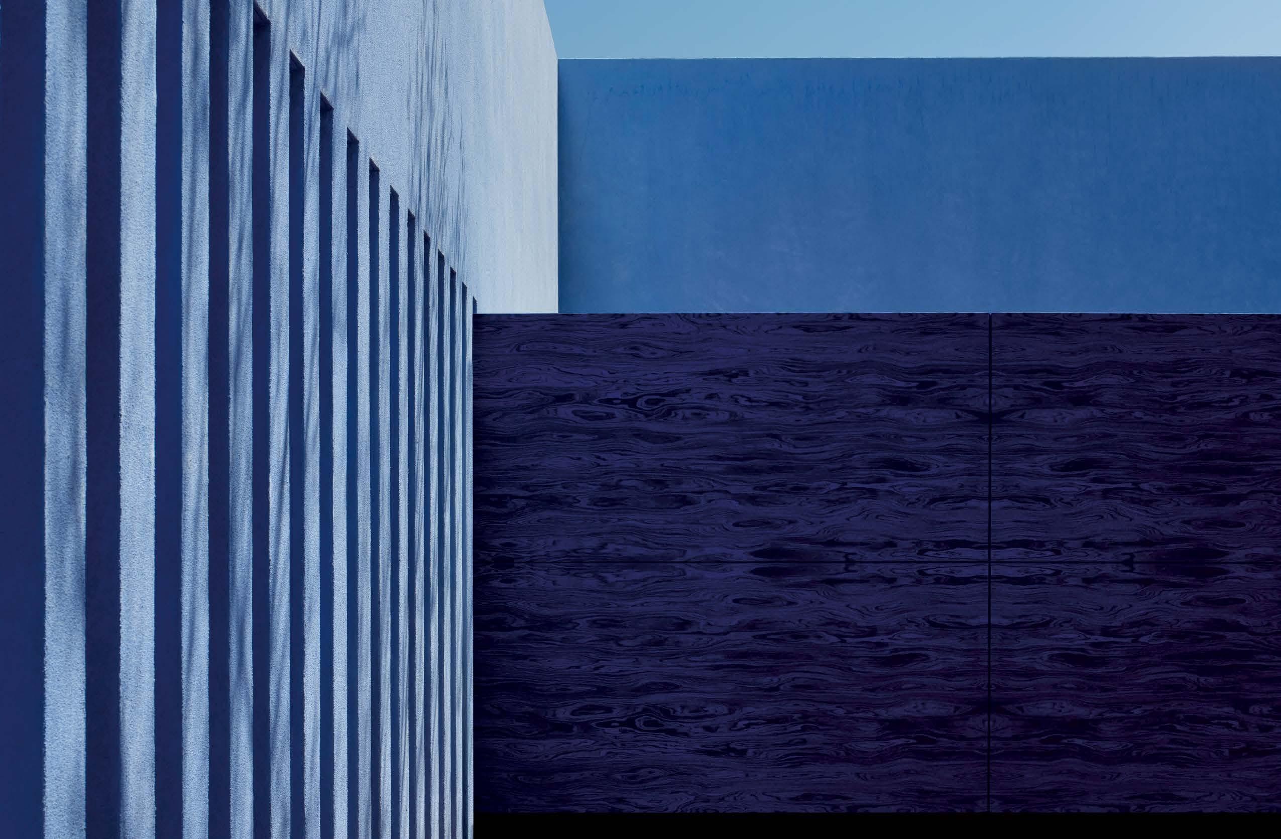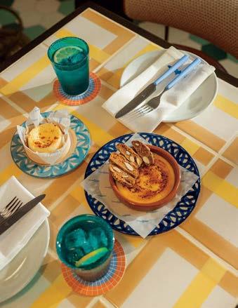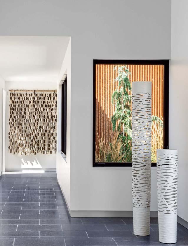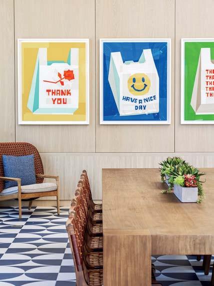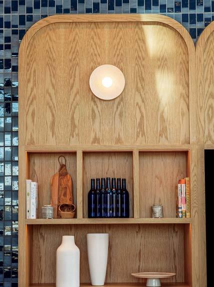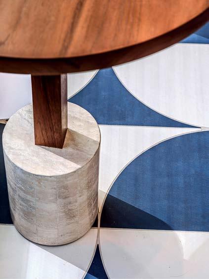 That’s apparent inside Farewinds, where Rapt conceived refined, layered spaces that feel approachable and residential—an antidote to the sterile labs. Cool tones of blue and gray, driftwood screens, and a doubleheight installation of teal and green yachting rope by California macramé artist Jim Olarte bring a whiff of the sea. “The palette has a gritty, weathered quality, with materials that feel as if they’ve been dredged out of the bay,” Petersen explains. On an atrium wall, handmade zellige tile form blocks of color like nautical stripes, a pattern mirrored in the porcelain-stoneware flooring. A mix of furnishings invites people to linger all day. There are roomy booths, a communal teak table in the market, and a dining lounge with Neri & Hu armchairs upholstered in handwoven Portuguese blankets. The private dining room, with its long oak table, amberglass pendant fixtures by Italian studio Chiaramonte Marin, and cobalt-detailed artwork by Mexican-descent painter Abel Macias is open to all when not reserved for events