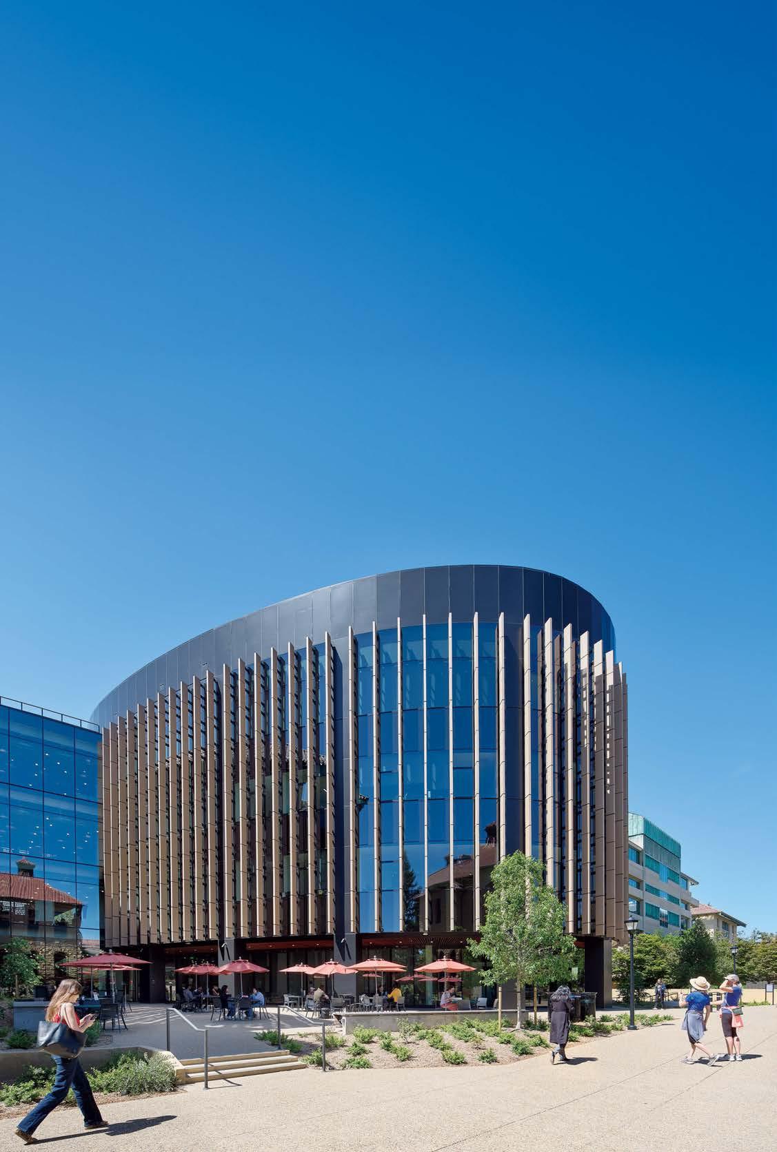 A feature is the central “mixing” chamber containing a precast-concrete stair that spans the structure’s five floors. The pattern of its perforated-aluminum balustrades, which have been powder-coated Stanford Cardinal red, was devised from 8-bit binary code, nodding to computer language while revealing views of adjacent lounges. Acoustic felt baffles above those lounges introduce movement, suggesting the flow of ideas between people and subject matters. Outside, the ovoid form engages a busy campus thoroughfare, its vertical terra-cotta fins fittingly doing double duty: referencing the materiality of the campus’s historic architecture and providing shade from the California sun.