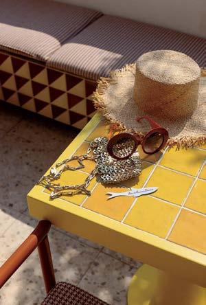 Opposite top, from left: A Fort Standard Column table on ceramic floor tile in the grab-and-go market. The lounge’s teak coffee table. Olarte’s 1,000 linear feet of rope. Opposite center, from left: Glory Day McSharry’s acrylic on wood panel assemblage and In Common With’s Dome pendants at the Farewinds bar. Traditional Portuguese blanket fabric on the lounge’s Capo chair. The atrium’s Zellige wall tile. Opposite bottom, from left: Bronze signage for the market. Ceramic tile, custom oak-veneer cabinetry, and Allied Maker’s Concentric sconce in the market. Jeffrey Sincich’s quilted mixed-media works and a custom teak communal table in the coffee bar.