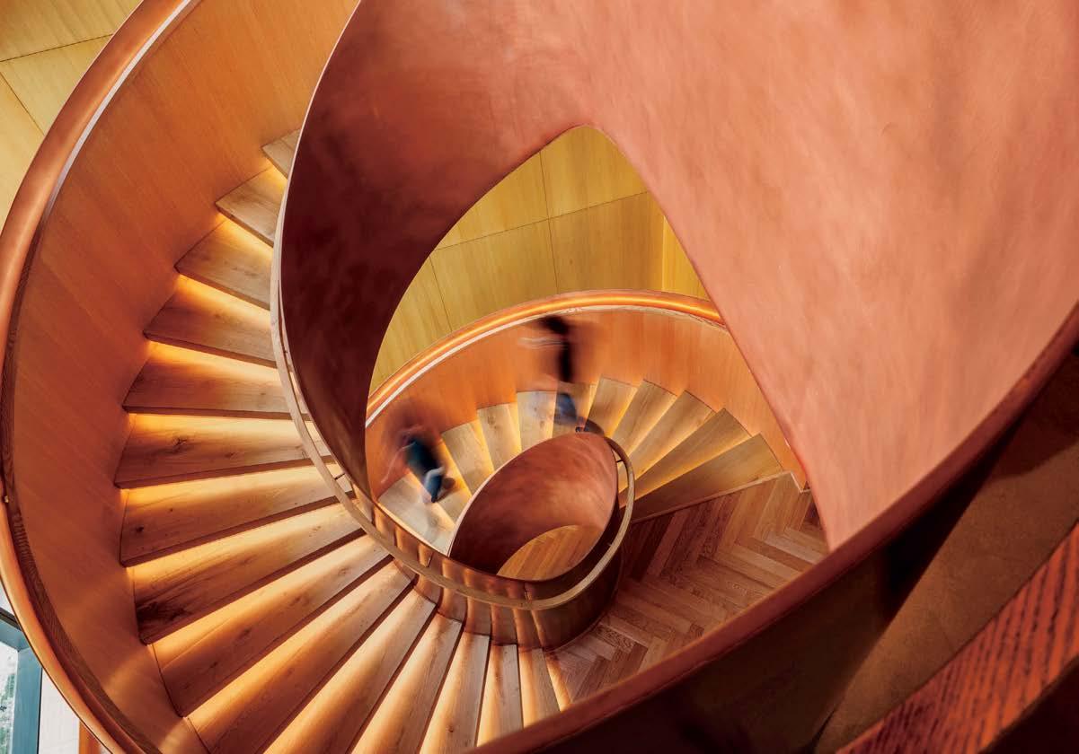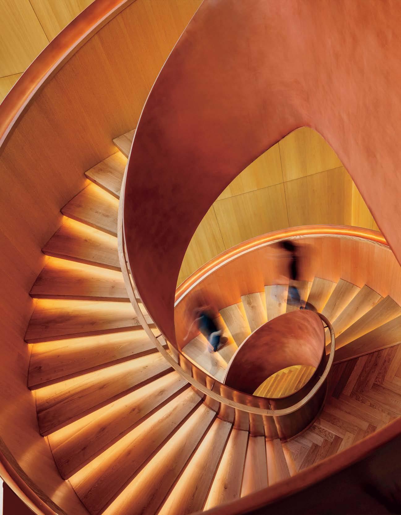 For the India headquarters of Diageo, the British multinational producer of such alcohol brands as Guinness, Smirnoff, and Johnnie Walker, M Moser Associates—number 16 among Interior Design’s 100 Giants, which this issue is devoted to— referenced the materiality of distillation stills and liquor aging barrels for the sweeping copper and oak helical staircase connecting the 83,000 square foot workplace’s three floors.