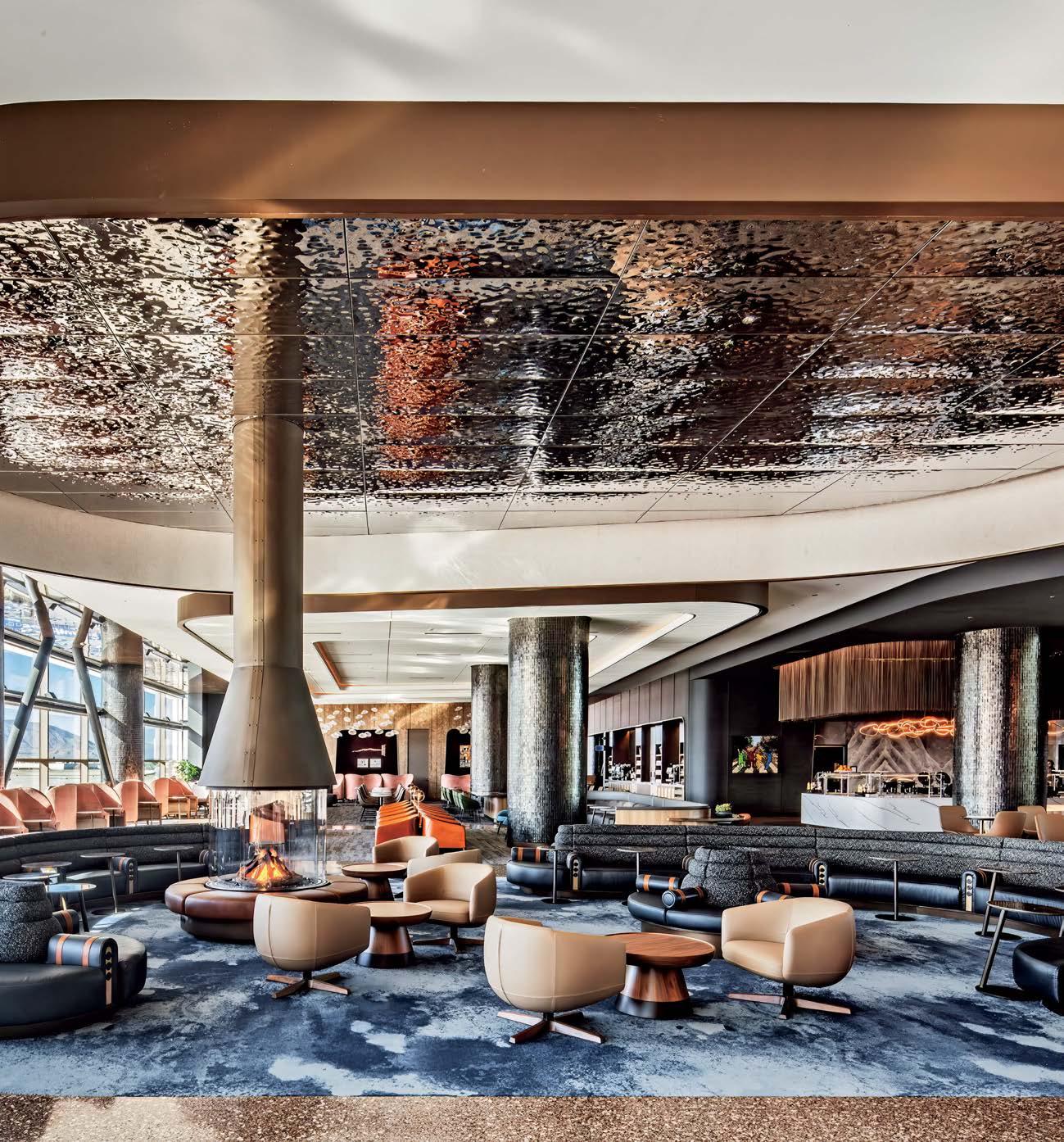 A custom, 360-degree bronze-finish fireplace anchors the lounge’s central seating area, where Verge armchairs by Eoos stand on carpet and under a ceiling of rippled stainless-steel panels, both alluding to the Great Salt Lake.