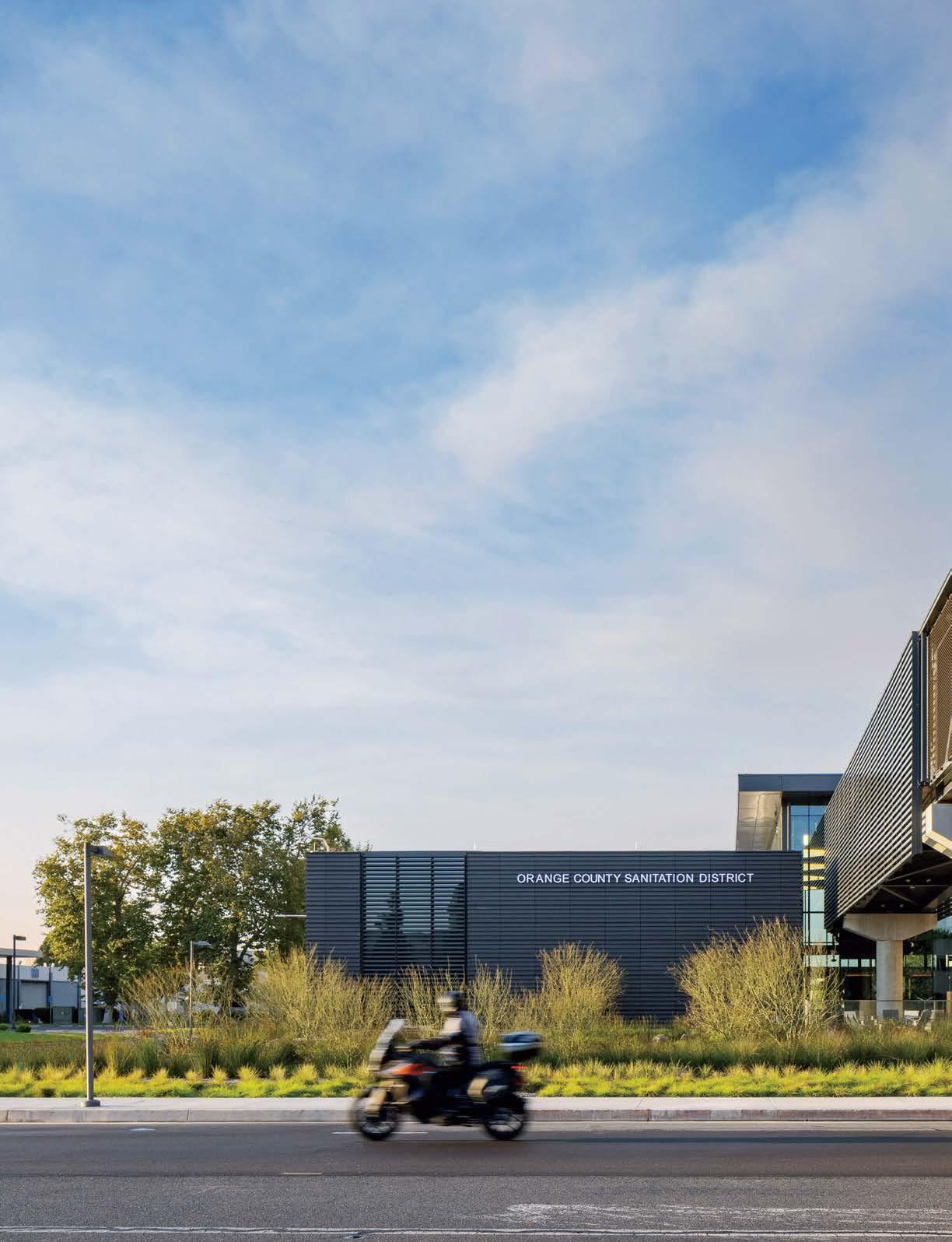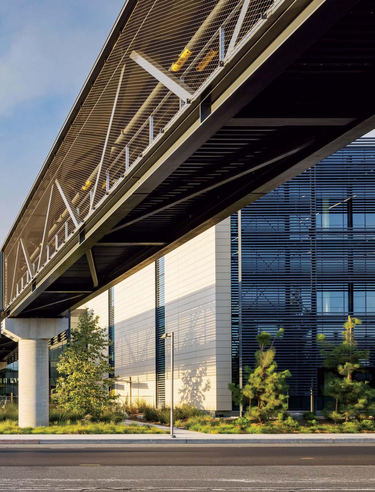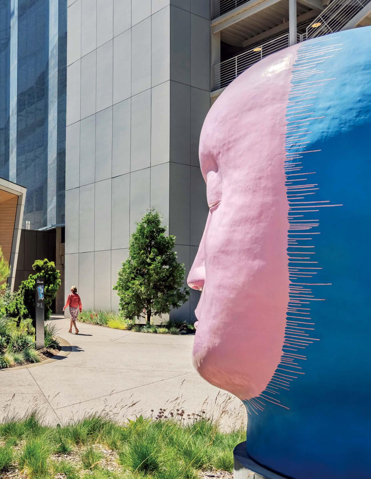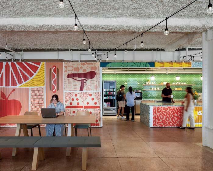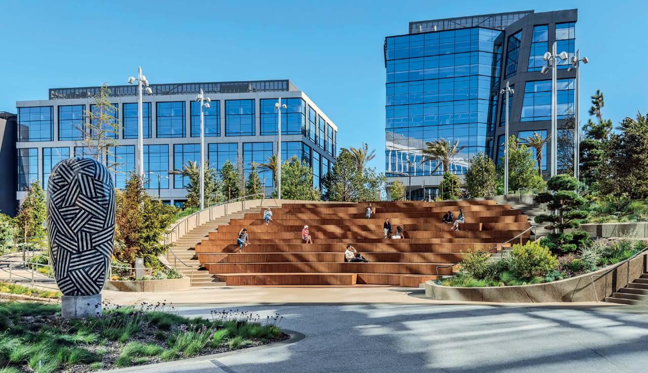 Previous spread: At Kilroy Oyster Point, a biotech and life-sciences hub in South San Franscico, California, a 10-foot-tall sculpture by ceramicist Jun Kaneko faces the concreteframed food hall, part of Rapt Studio’s 48,400-square-foot amenities scope, its massing inspired by the jagged rocks along the Pacific coast.