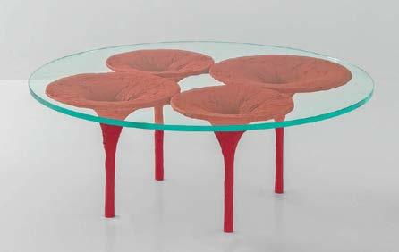 Top: Gathered beneath Danielle Trofe’s mycelium MushLume pendants in a Farewinds lounge are Capo lounge chairs by Neri & Hu, Andreas Engesvik and Daniel Rybakken’s Arbour sofa, Mario Ferrarini’s Lyz chairs, and custom porcelain floor tile. Bottom: Overlooked by the site’s second Kaneko sculpture, an amphitheater with fused-bamboo decking near the food hall is by James Corner Field Operations and the glass lab buildings around it are by DGA.