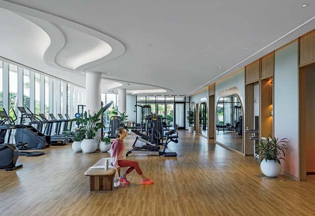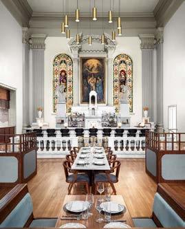 PRODUCT SOURCES FROM FRONT NEW WORKS: PENDANT FIXTURES (RECEPTION). HOUSE OF FINN JUHL: ARMCHAIRS. SACCAL DESIGN HOUSE: WHITE CHAIRS. AUDO COPENHAGEN: SECTIONAL. ALARWOOL: CUSTOM RUG. CAESARSTONE: DESK SOLID SURFACING. PORCELANOSA: CUSTOM FLOOR TILE (FOOD HALL, PRIVATE DINING). DANIELLE TROFE DESIGN: PENDANT FIXTURES (LOUNGE). THROUGH THE FUTURE PERFECT: LOUNGE CHAIR. HAY: SOFA. BAUX: CEILING TILE. POTOCCO: DINING CHAIRS (LOUNGE, PATIO). CLÉ TILE: WALL TILE (ATRIUM). 9WOOD: SLAT CEILING. MOSA: FLOOR TILE (MARKET, COFFEE BAR). FORT STANDARD: TABLE (MARKET). FRANCE & SON: TEAK TABLE (LOUNGE). IN COMMON WITH: PENDANT FIXTURES (BAR). STELLAR WORKS: STOOLS. DDS TILE: WALL TILE (MARKET). ALLIED MAKER: SCONCE. GLOSTER FURNITURE: LOUNGE CHAIR (COFFEE BAR). INDUSTRY WEST: DINING CHAIRS. UNALOME INTERIOR: CUSTOM TABLES (COFFEE BAR, PRIVATE DINING). HEATSAIL: HEAT LAMPS (PATIO). RH: SECTIONALS. KETTAL: DINING TABLES, STOOLS. DEDON: LOUNGE CHAIRS. TRESPA: EXTERIOR SLAT SYSTEM. MUUTO: PENDANT FIXTURES (GYM). GTEX STAINLESS: PANELING. BLÅ STATION: SOFA. TURF DESIGN: BAFFLE SYSTEM. VIBIA: PENDANT F IXTURES. BROKIS: PENDANT FIXTURES (PRIVATE DINING). LASKASAS: CHAIRS. NANIMARQUINA: RUG. MAHARAM: CURTAIN FABRIC. THROUGHOUT BENJAMIN MOORE & CO.: PAINT.