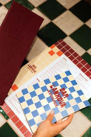 Left: Zellige tile line a wall of serving stations in the Farewinds atrium, crowned by an acoustic wood-slat ceiling.
