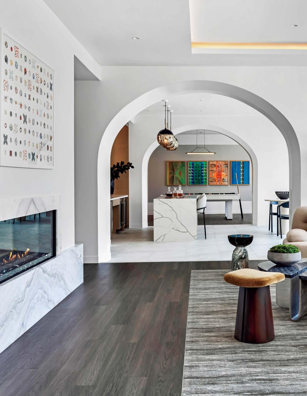 DESIGNS: BEIGE CHAIRS. ACUCRAFT: CUSTOM FIREPLACE. RIMEX METAL: METAL CEILING PANELS.