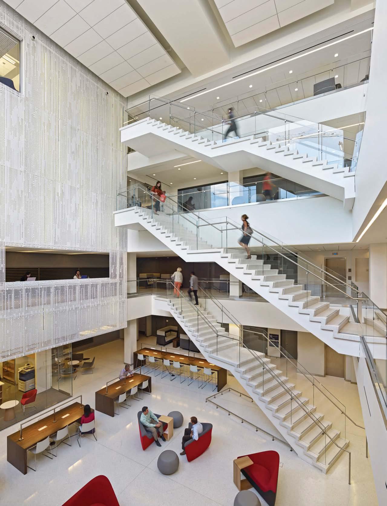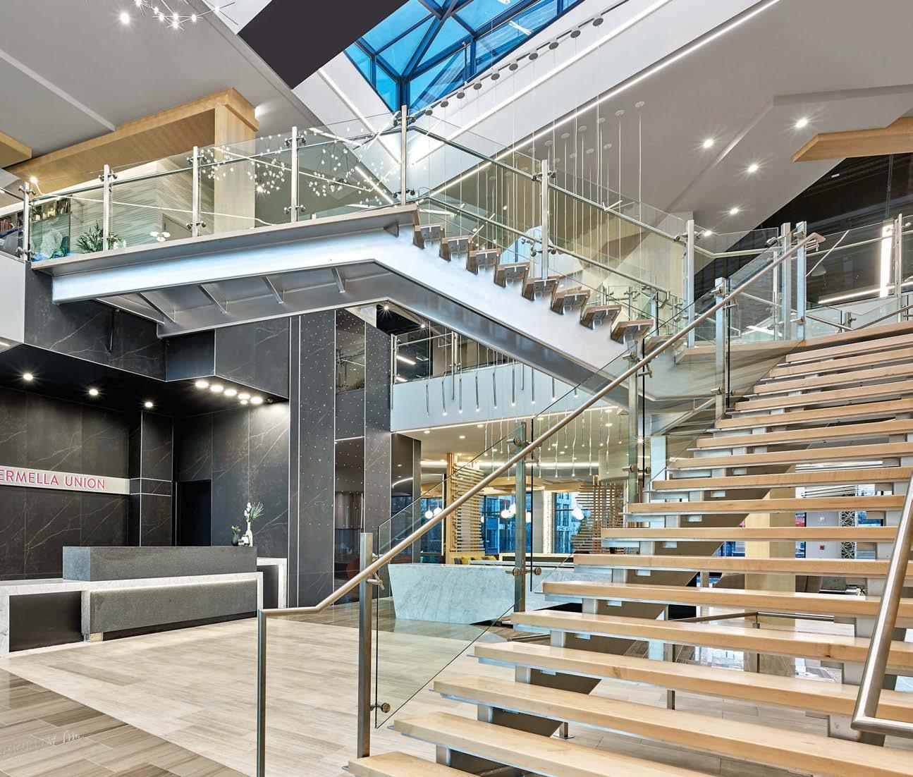 Clockwise from below: A grand stair showcases CDG’s modern design. Vermella Union offers studio, one-, two-, and three-bedroom apartments and luxury amenities. The complex features an expansive list of amenities including a kitchen/bar. The drama created by the staircase on the first level continues on the second floor with the addition of an architectural skylight.