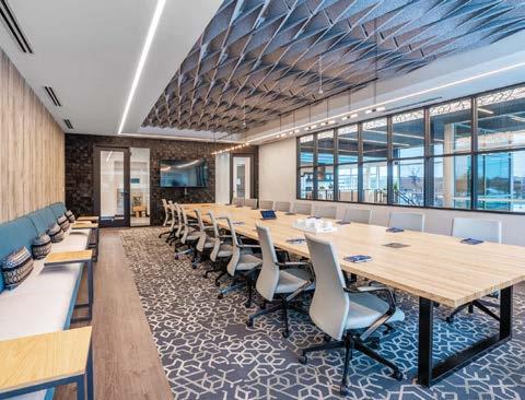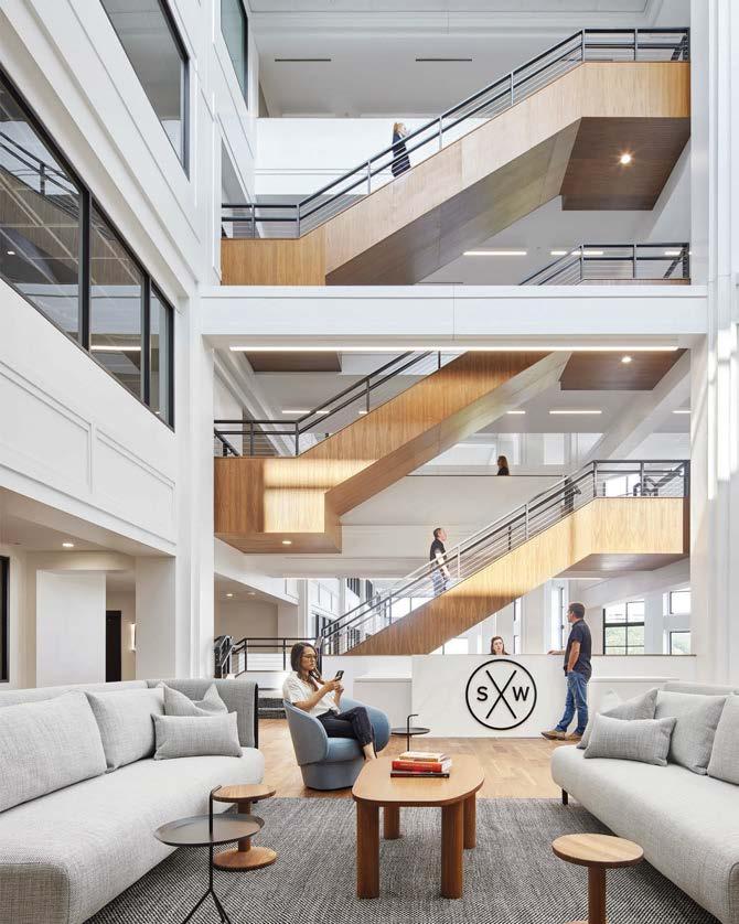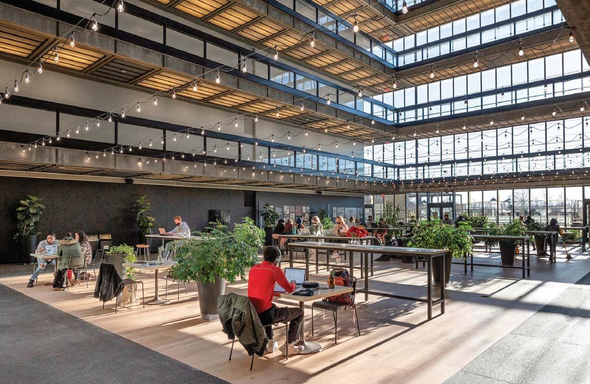 PROJECT TEAM PAOLA ZAMUDIO; BROOKE PETRANY KEY CONSULTANTS INSPIRED BY SOMERSET DEVELOPMENT; ALEXANDER GORLIN ARCHITECTS; G3 ARCHITECTS ; WIGHT + COMPANY PHOTOGRAPHY COURTESY OF NPZ STYLE + DÉCOR npzdesign.com; @npz_studioClockwise from right: At Bell Works New Jersey, the reimagination of mid-century architectural masterpiece Bell Laboratories, biophilic design dovetails with original architect Eero Saarinen’s ethos of bringing the outdoors inside. Coworking labs line circulation zones dotted with inviting breakout spaces at Bell Works Chicagoland. Also in Chicagoland, the Square comprises a Josef Albers–inspired tile floor furnished with modular pieces by Lapalma to add color and an interactive element.