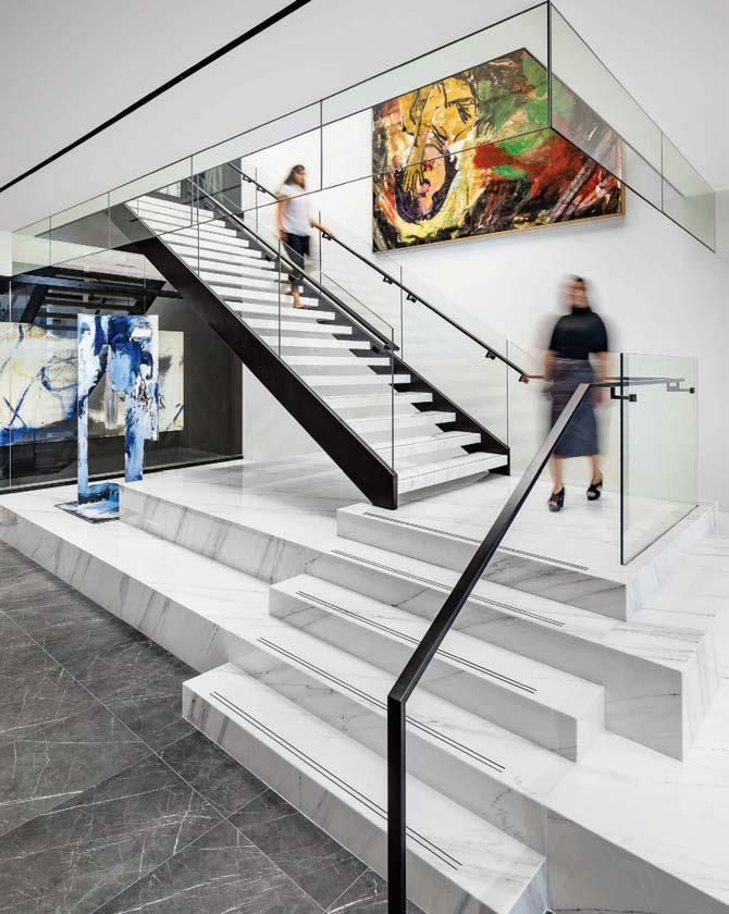 Whereas this level is spare in cool-toned terrazzo and shiny steel, level two is cozier, aiming to draw people together in community and conversation. A secret terrazzo staircase behind a sliding mirrored-glass wall ascends to the mezzanine balcony’s restful café, lounge, library, and conference room.