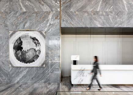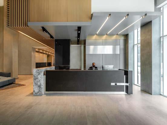 The lobby program evolved in parallel with the development of the facade. Angular forms create a fluid dialogue connecting the exterior and interior architectural expressions. A concrete stair cantilevers from the sheer core wall to celebrate the lobby’s height and link reception to the secondfloor terrace and pool, creating a seamless connection between the streetscape and the skyline. A custom bronze-finish balustrade adds refined detail to the stair.