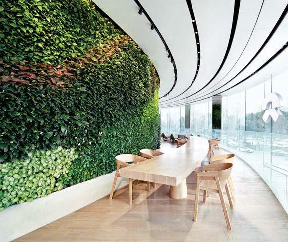 A mammoth living wall soars up both levels, cleaning the air and refreshing the spirit. “For us, true sustainability is based on understanding that every decision we make will impact lives today and beyond,” MertensMeyer says. “We must always ask: Why are we doing this, and who is it for?”