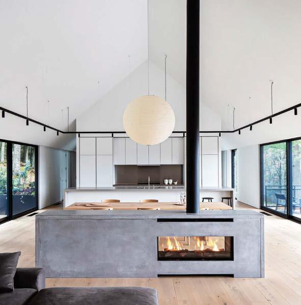 beams. All-white walls are illuminated by natural light spilling in through double-hung mullioned windows that accent the gabled front and back facades. The central architectural force is the folded stair that connects the main level to the bedroom volumes above. “We always knew the stair would take a central role,” D’Apostrophe principal and lead designer Francis D’Haene says. “Once we had that situated, everything fell into place.”