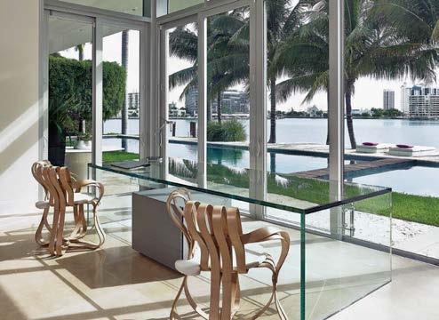 PROJECT TEAM JUAN POGGI; ROSMINA DI BARTOLOMEO; MARIA GABRIELA ROJAS MONTES DE OCA KEY CONSULTANT TOUZET ARCHITECTS PHOTOGRAPHY CARLOS DOMENECH poggidesign.com; @poggidesignClockwise from bottom left: Custom Paola Lenti furniture populates the poolside covered terrace. An Ingo Maurer chandelier surveys the elegantly detailed dining room. The crisp, clean lines of furniture and landscaping echo the contemporary architecture. Teak boards provide a pathway across the pool to a palm-shaded bayside lounge area. Frank Gehry’s Hat Trick chairs—ribbon like objects composed of maple-veneer strips—cozy up to a custom desk from the Italian glass masters Santambrogio Milano.