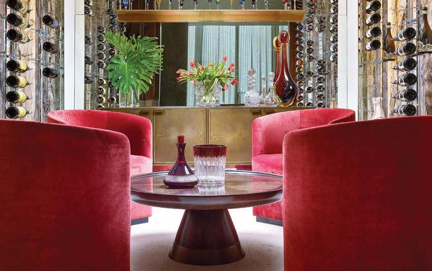 Velvet-upholstered curved-back chairs form an intimate seating area in the custom wine room.